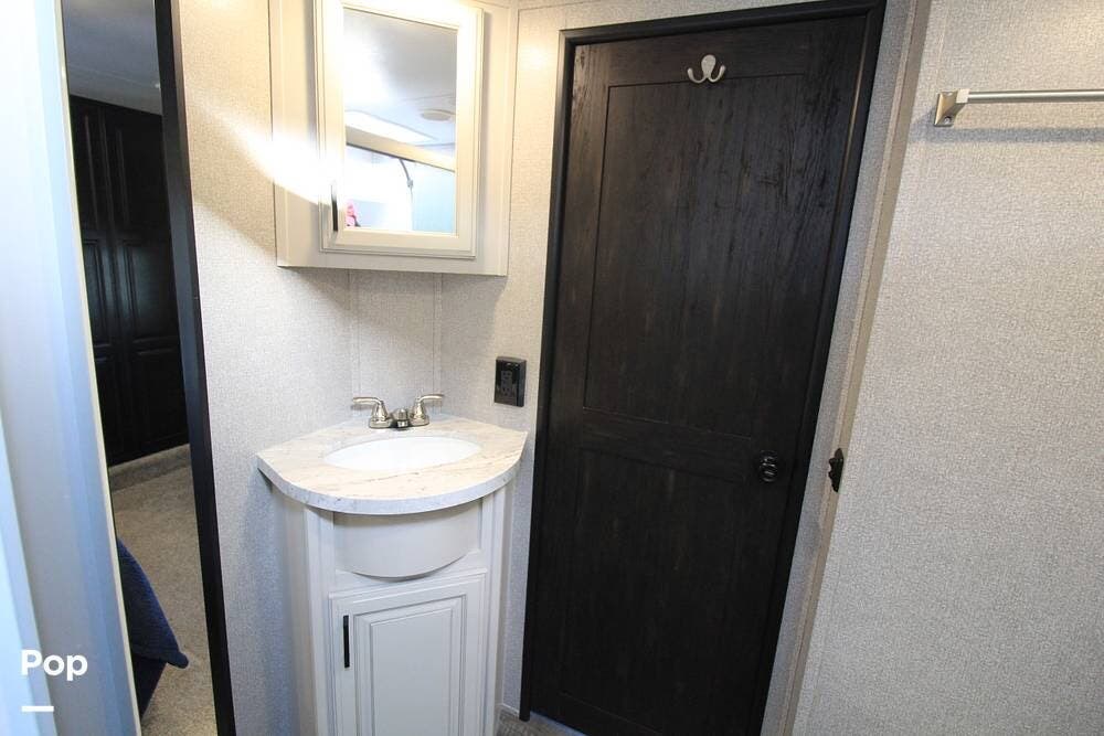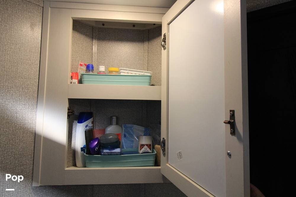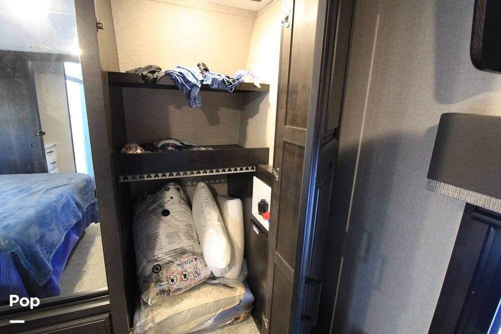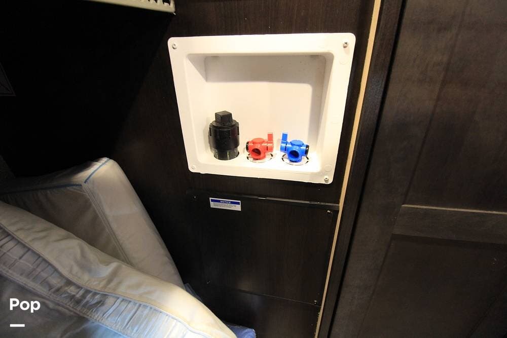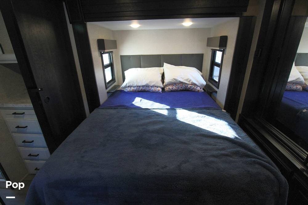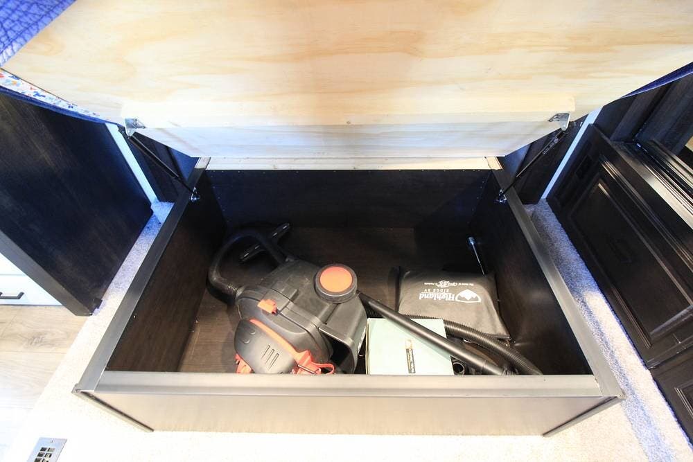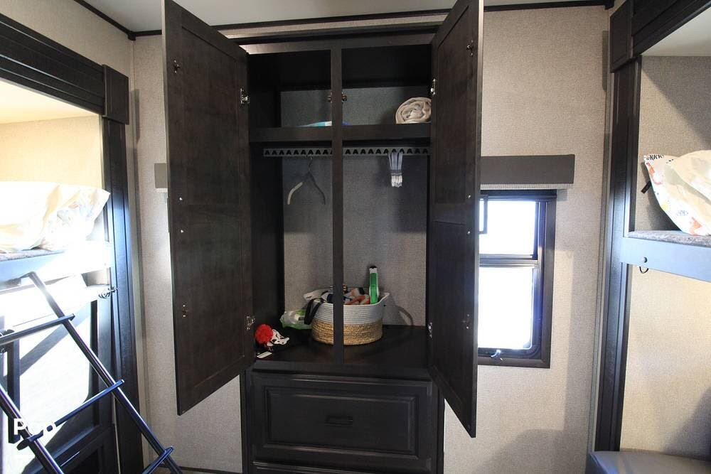 In traditional fifth-wheel fashion, the full bath and main bedroom are upstairs at the front of the trailer. The bedroom features a queen bed with plenty of storage, TV hook-ups, and in-closet washer and dryer hook-ups!