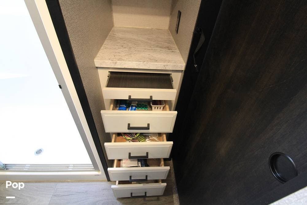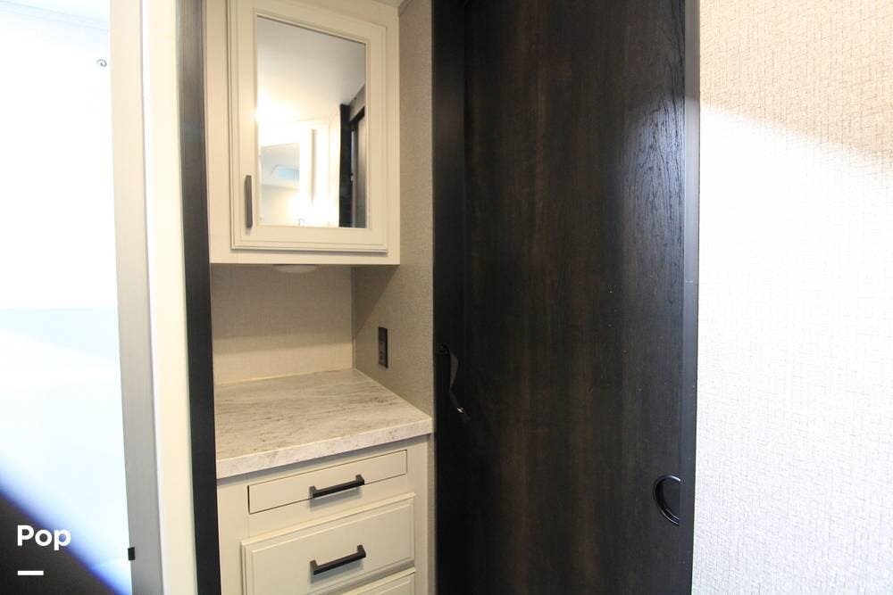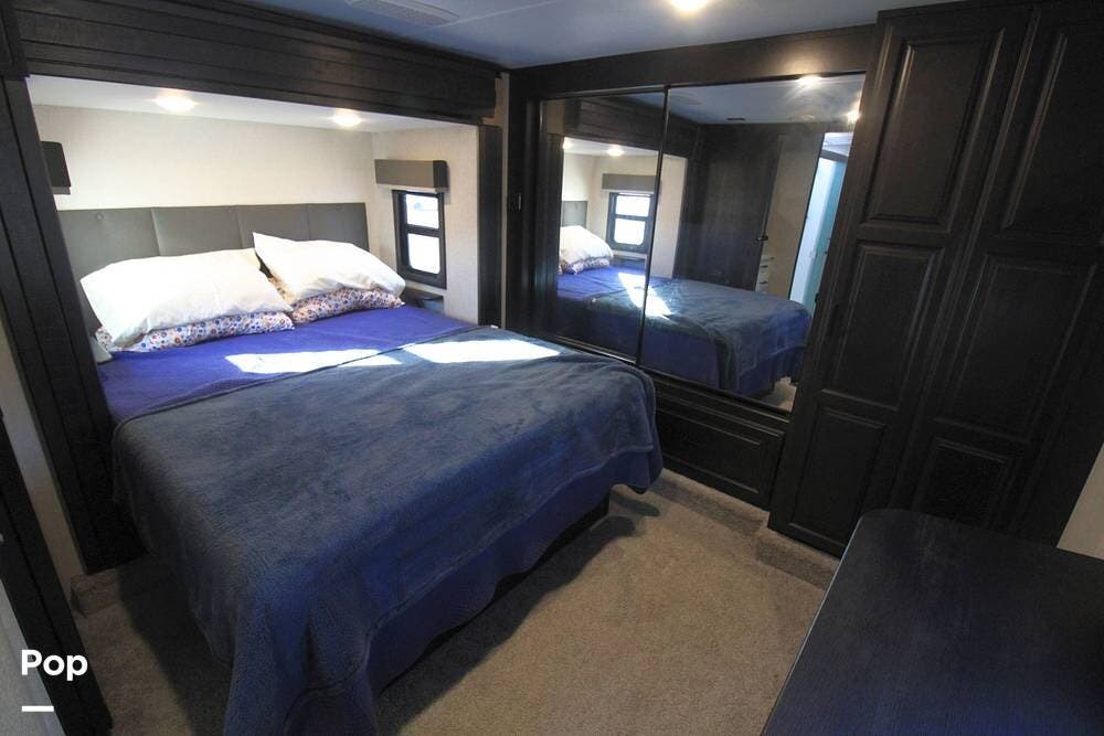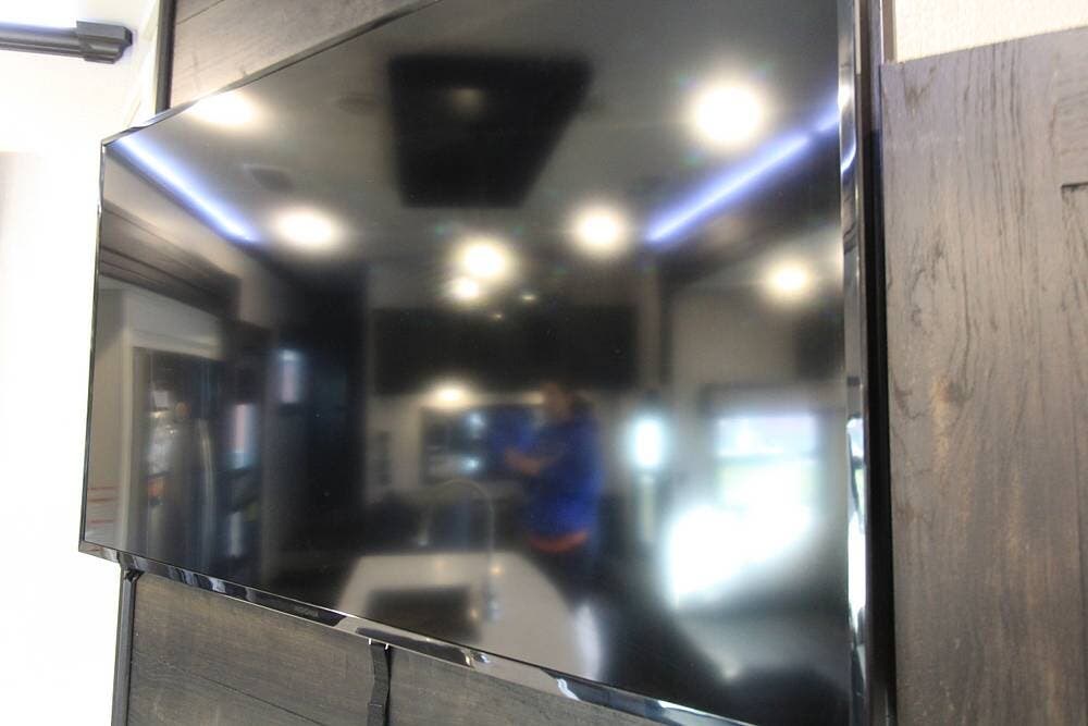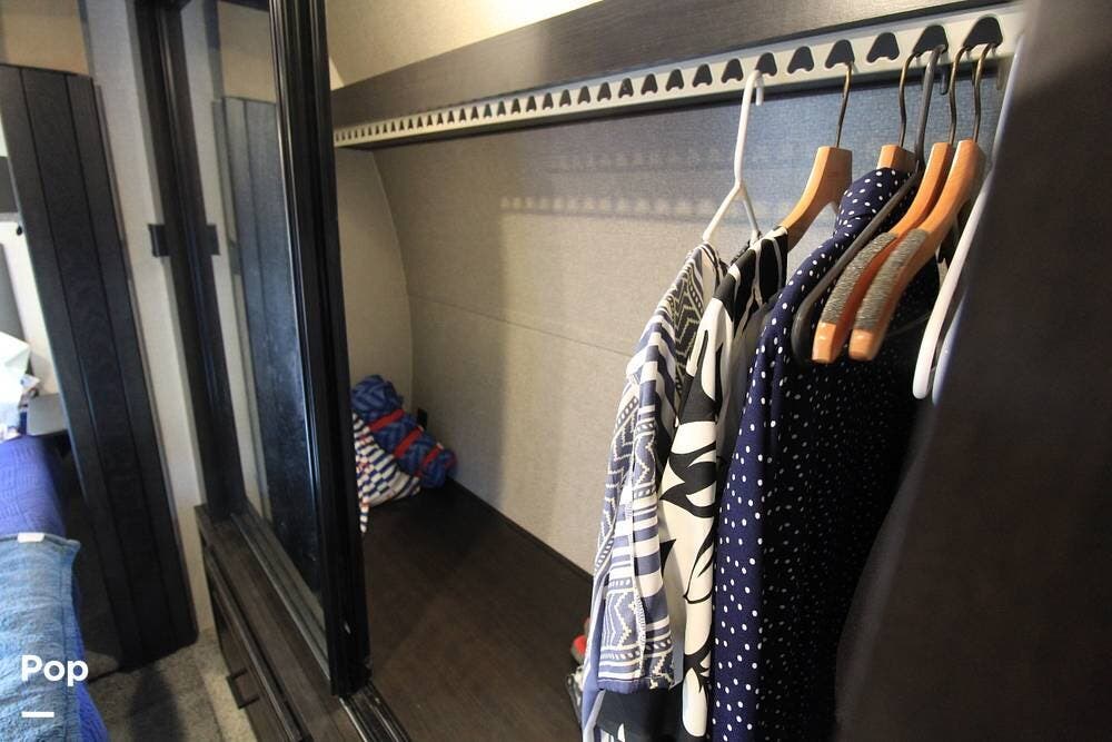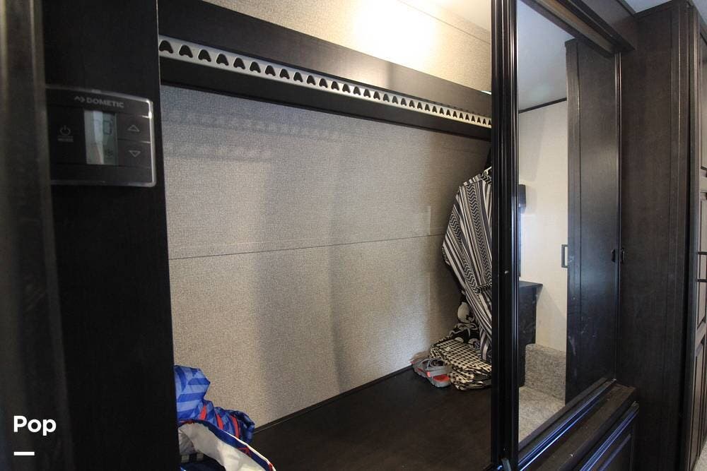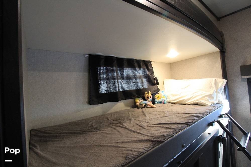 In traditional fifth-wheel fashion, the full bath and main bedroom are upstairs at the front of the trailer. The bedroom features a queen bed with plenty of storage, TV hook-ups, and in-closet washer and dryer hook-ups!