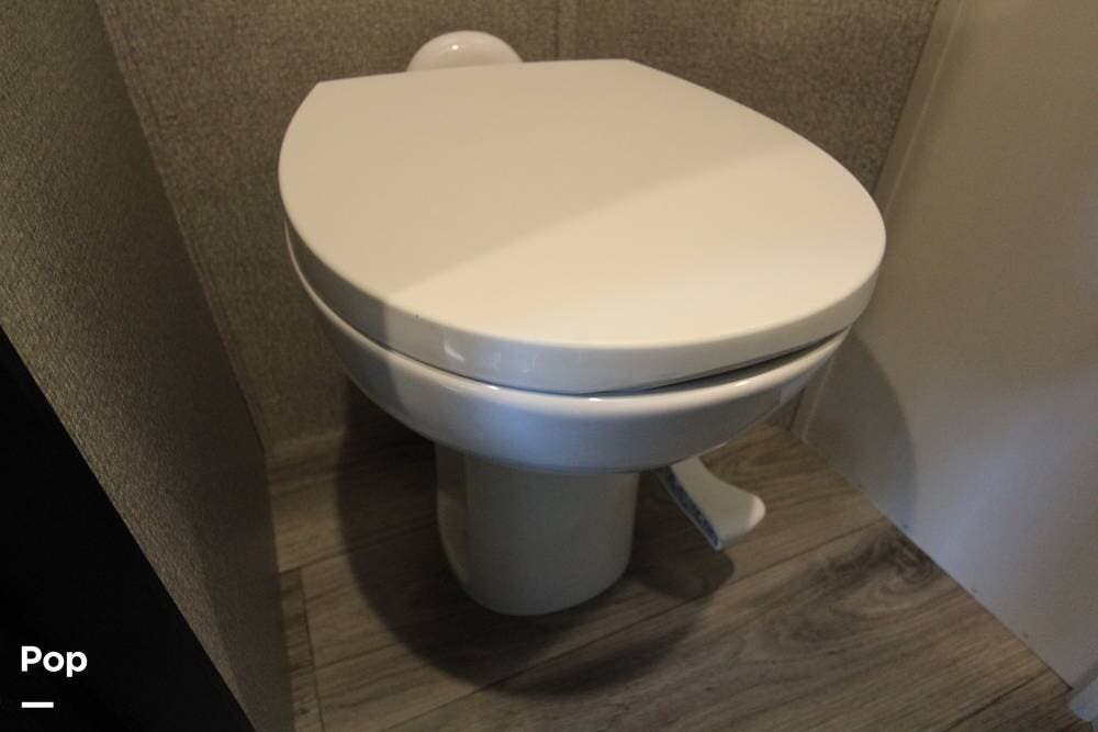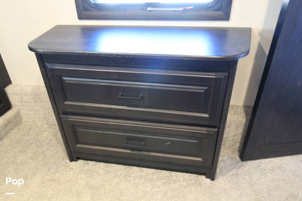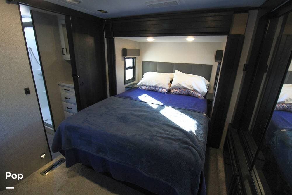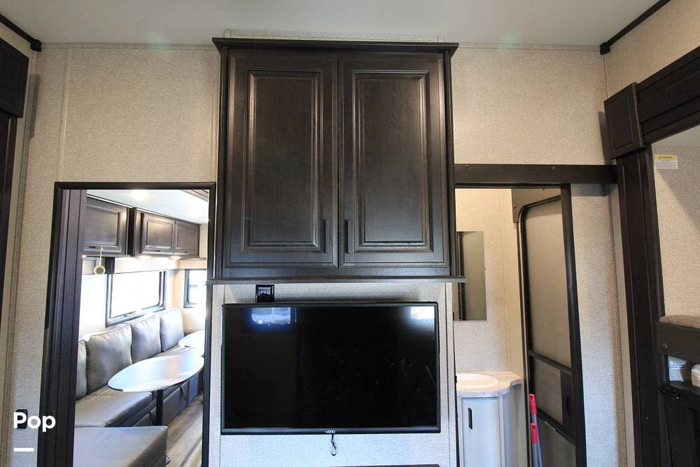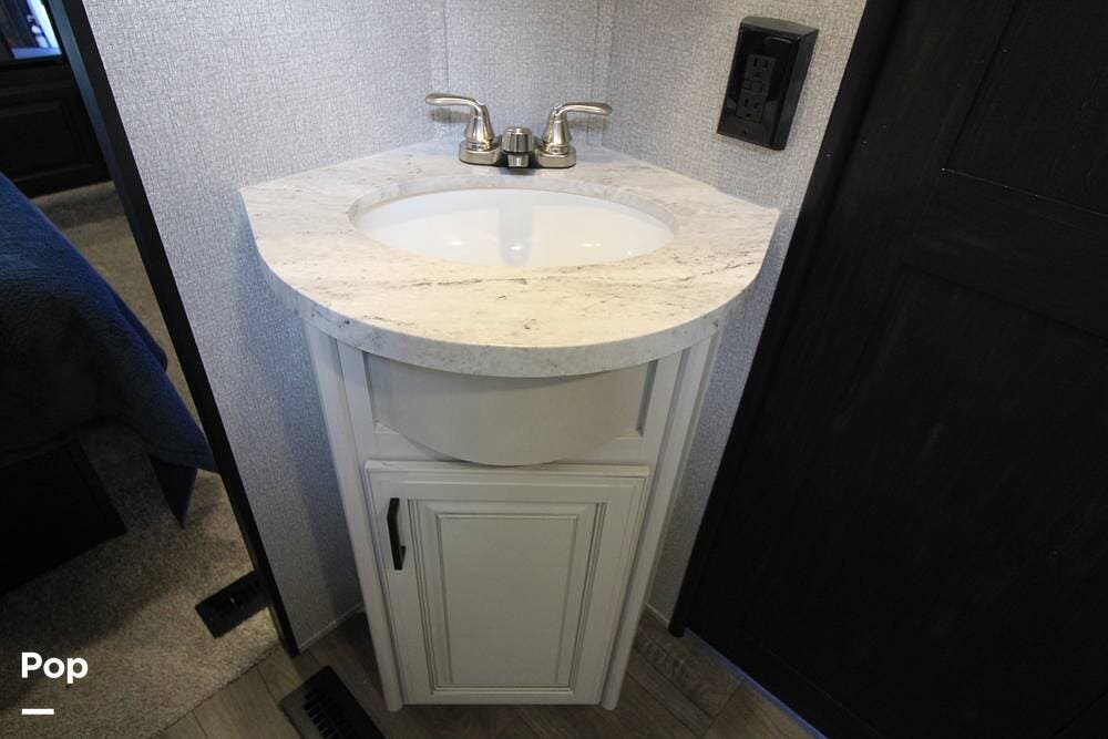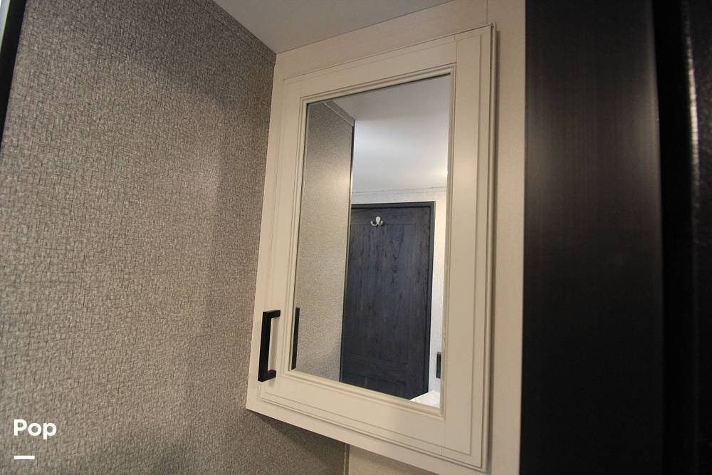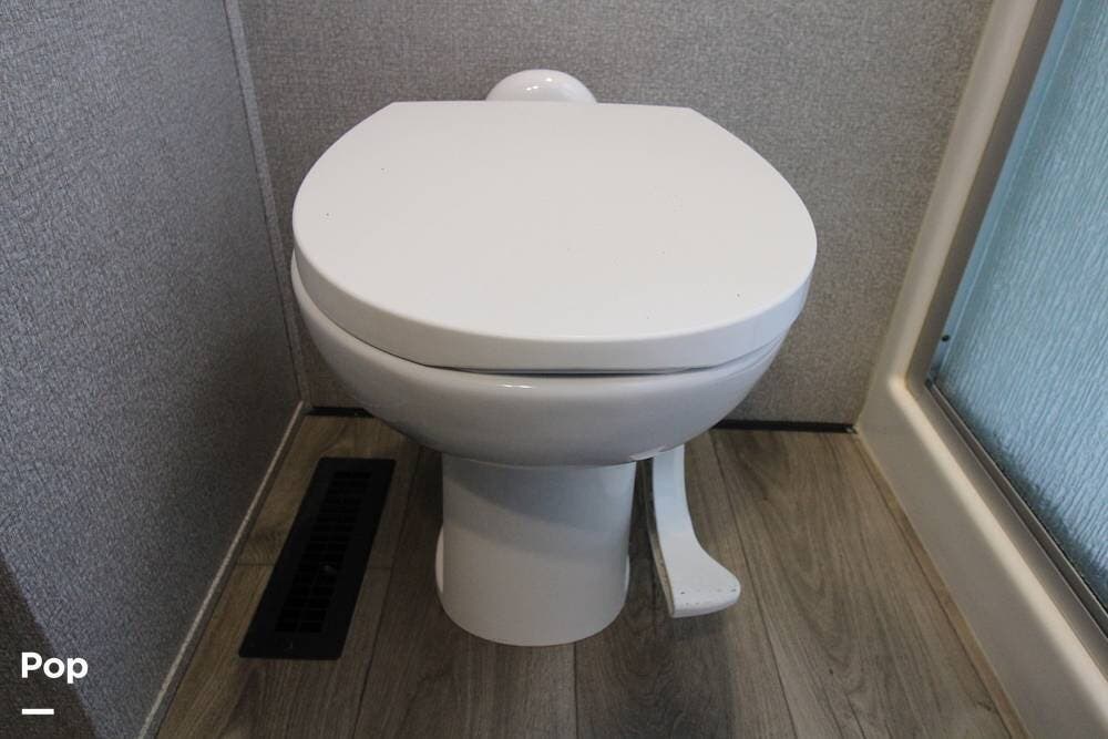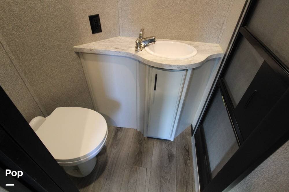 In traditional fifth-wheel fashion, the full bath and main bedroom are upstairs at the front of the trailer. The bedroom features a queen bed with plenty of storage, TV hook-ups, and in-closet washer and dryer hook-ups!