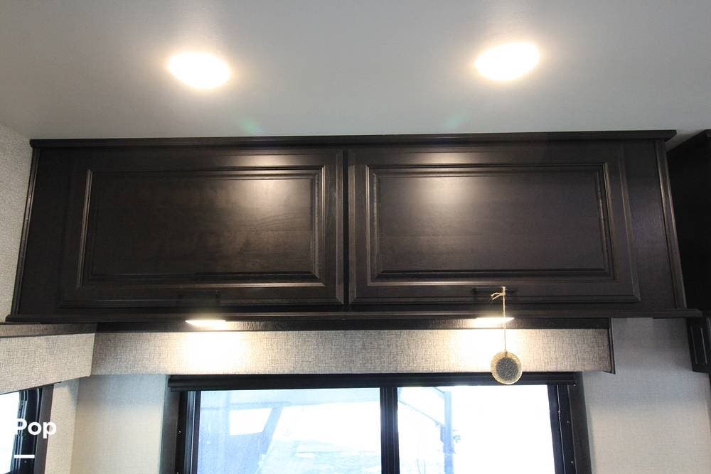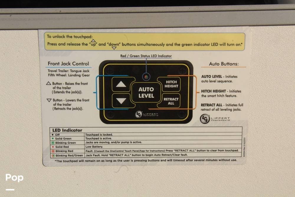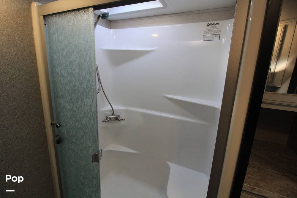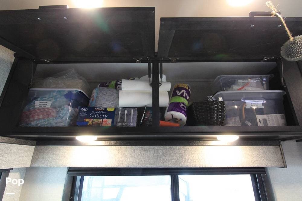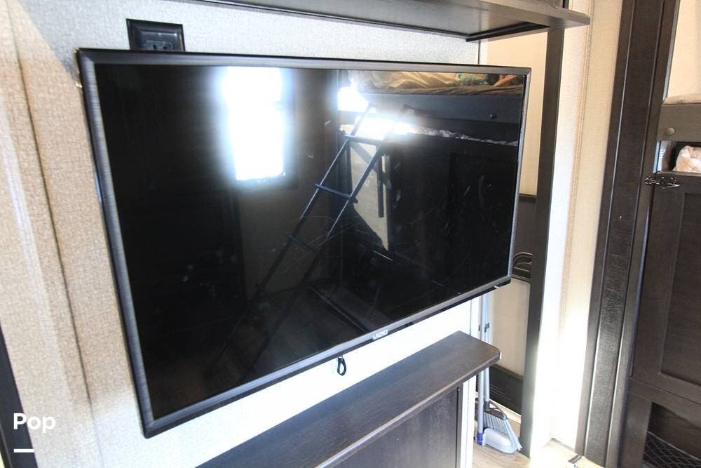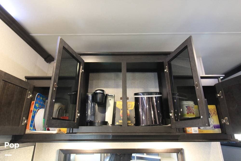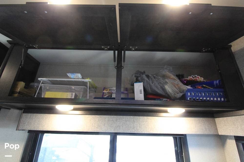 In traditional fifth-wheel fashion, the full bath and main bedroom are upstairs at the front of the trailer. The bedroom features a queen bed with plenty of storage, TV hook-ups, and in-closet washer and dryer hook-ups!
