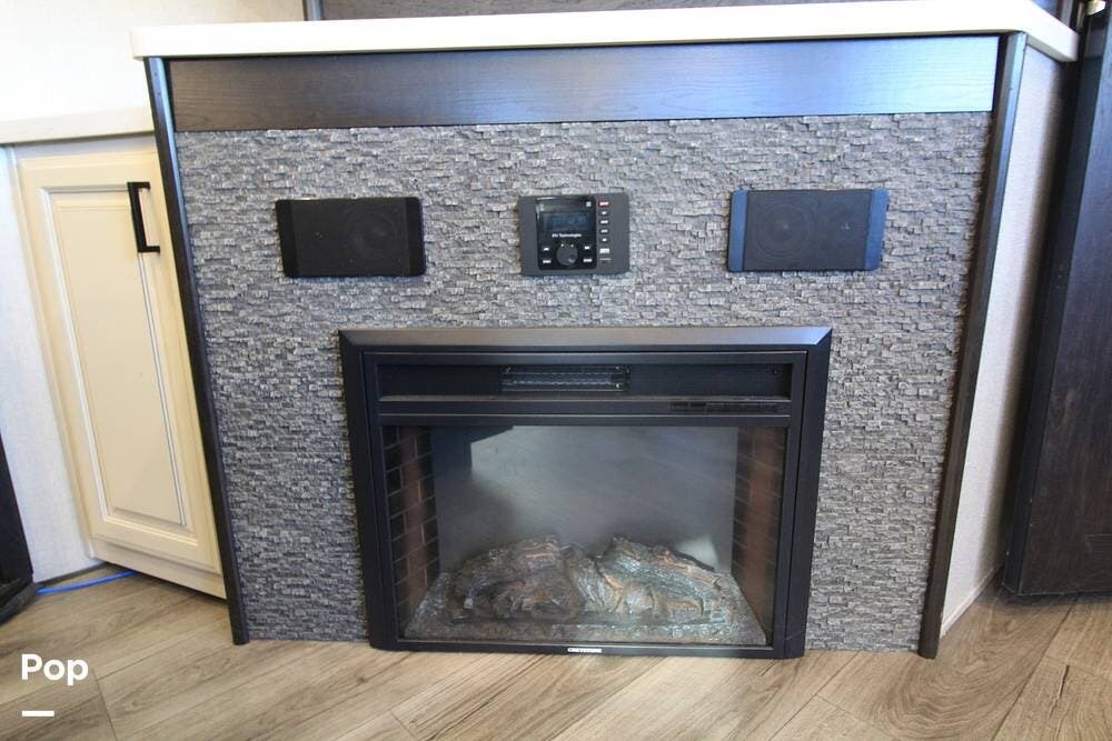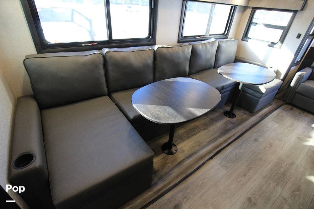 The living area features an extra-large combo dinette and sofa that has two removable tables and converts to a queen-size bed!! There are also twin recliners, and the space is rounded out with an entertainment center and electric heating fireplace!