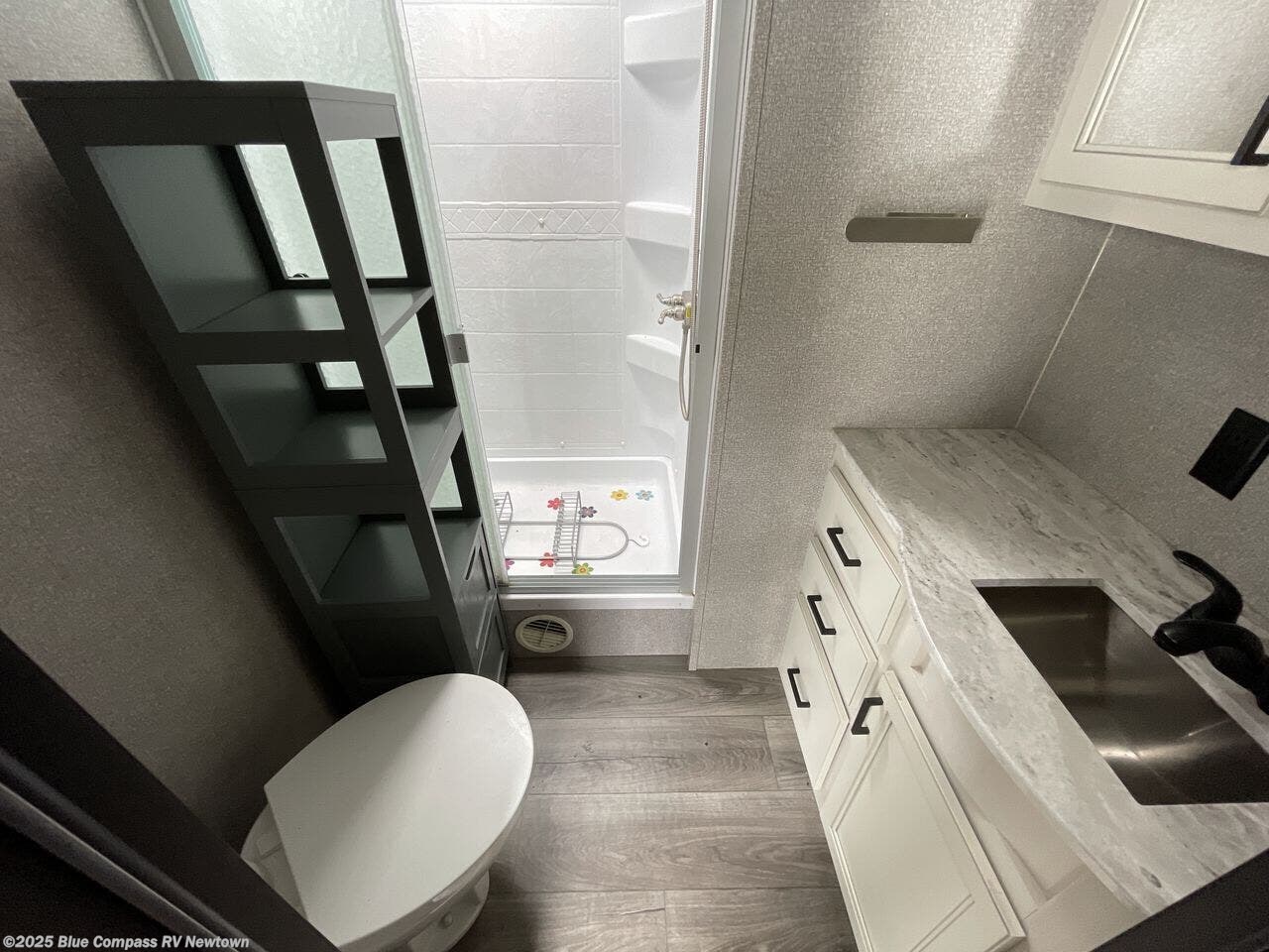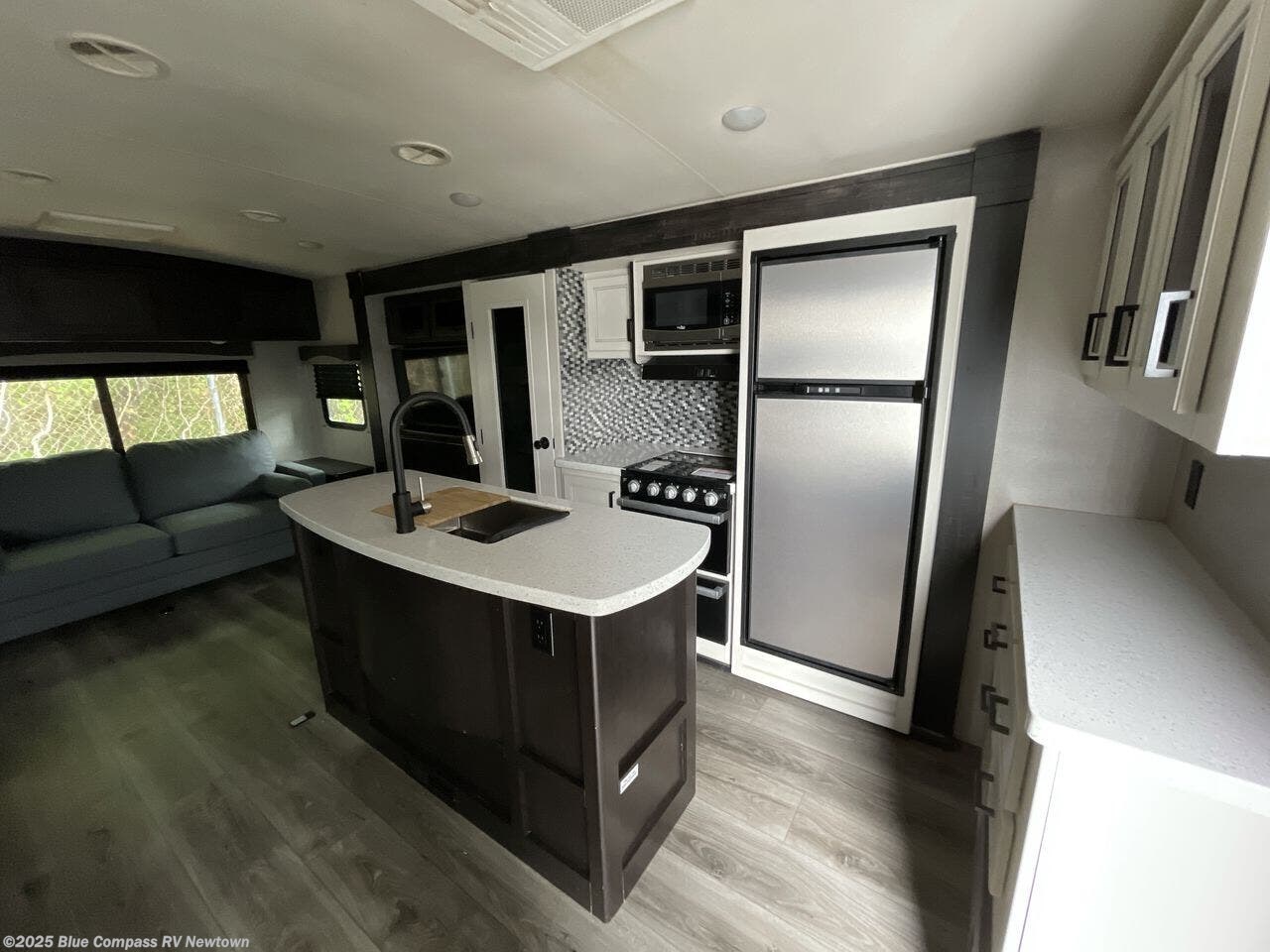 From its front master suite to its open kitchen/living area, this Open Range Light travel trailer is going to be comfortable all throughout! You will find great storage in the kitchen with the pantry, 8-cubic foot refrigerator, large pot-and-pan drawer below the 17" gas oven, and hutch, and there is also great seating across from the kitchen with the booth dinette, theater seating, and tri-fold sofa. As you get cleaned up in the radius shower in the dual-entry bathroom, you'll appreciate that one of the entrances leads directly into the front bedroom. You will also love that there are two power awnings outside so that you can stay protected while you are sitting in a camp chair reading a book.