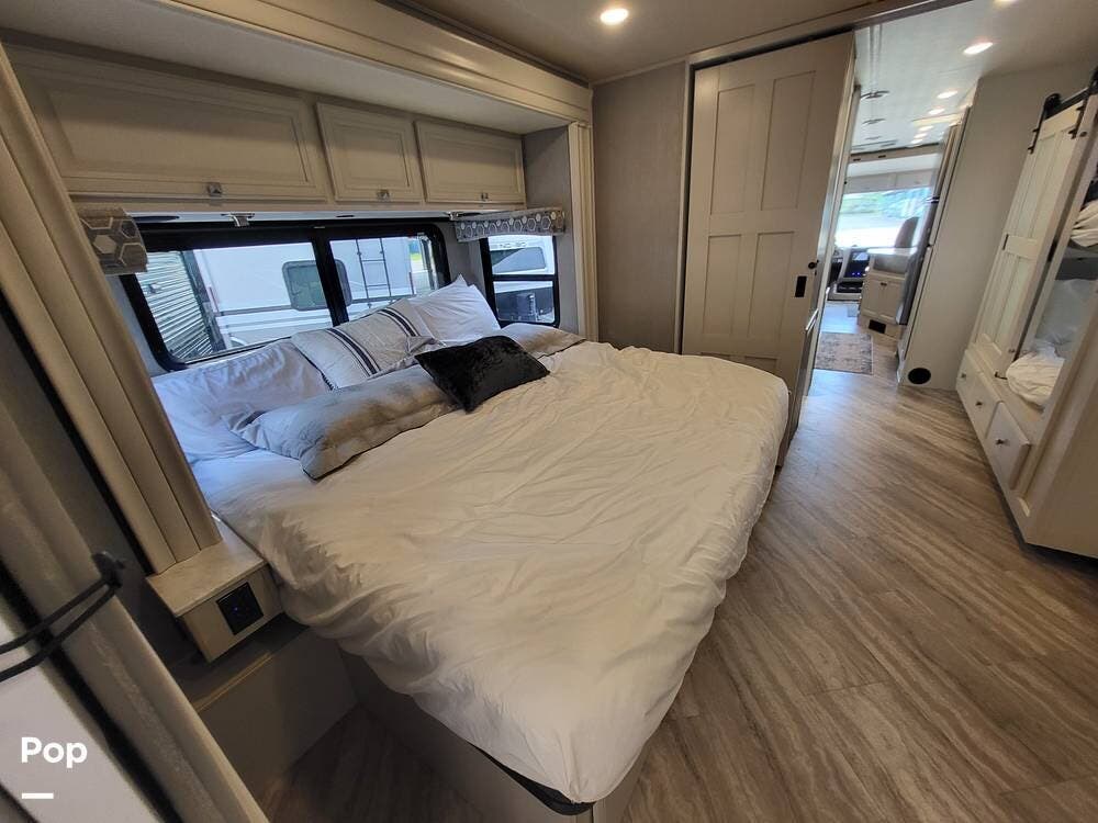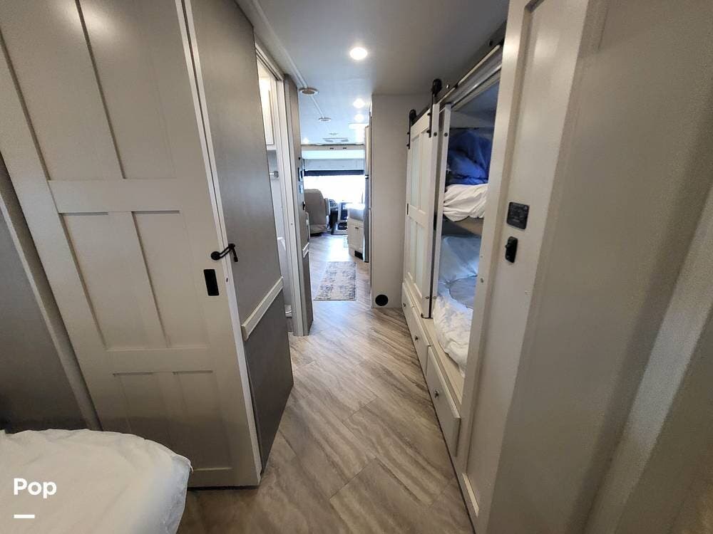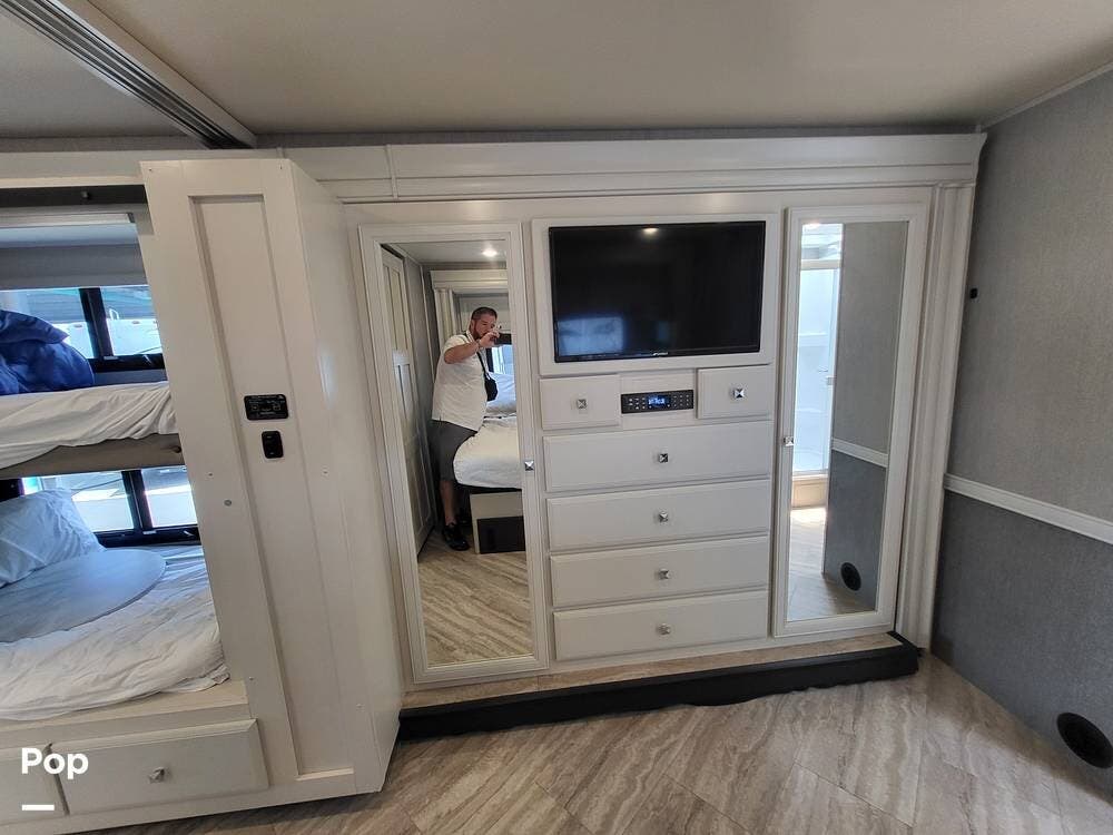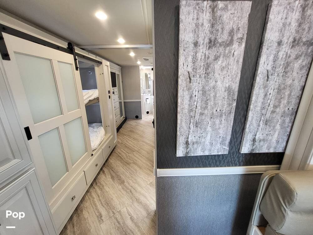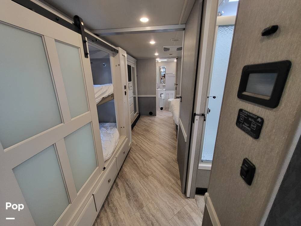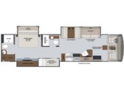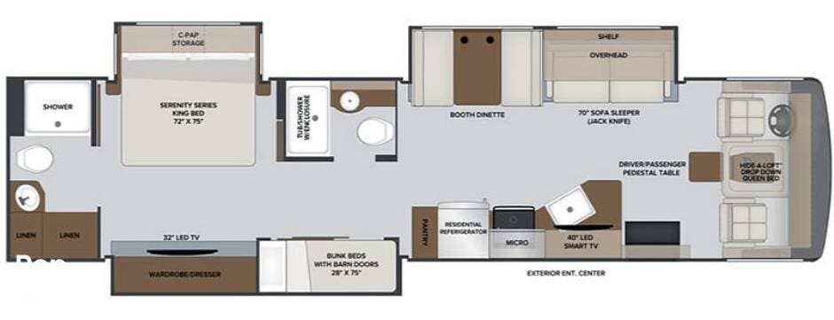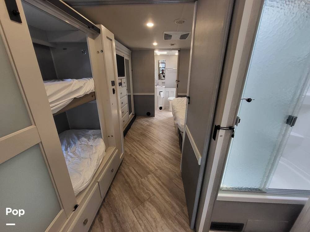This coach can accommodate up to 8-10 passengers, featuring a cabover drop-down bunk, a sleeper sofa, a convertible dinette, dual bunk beds, and a king-size bed in the master suite.