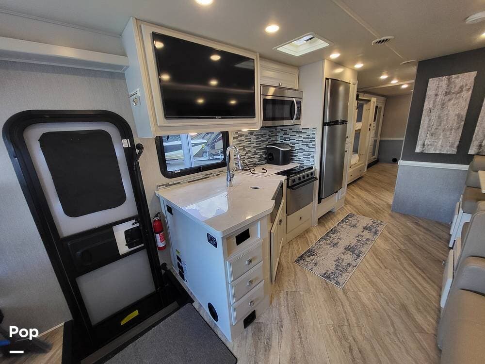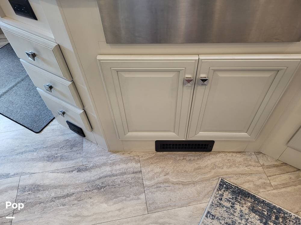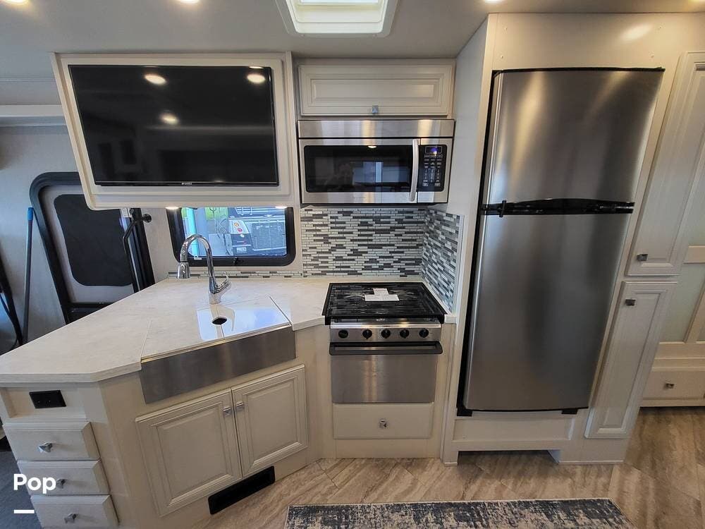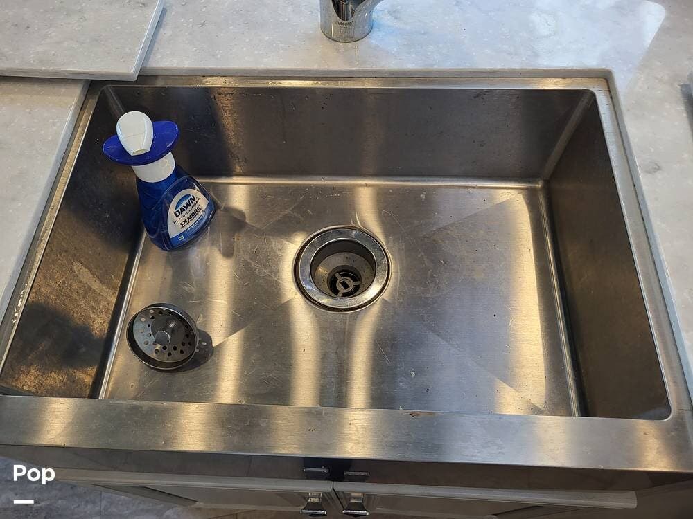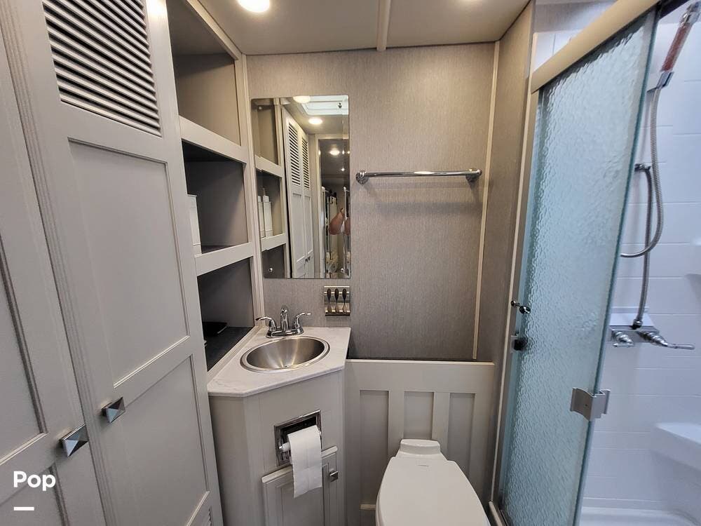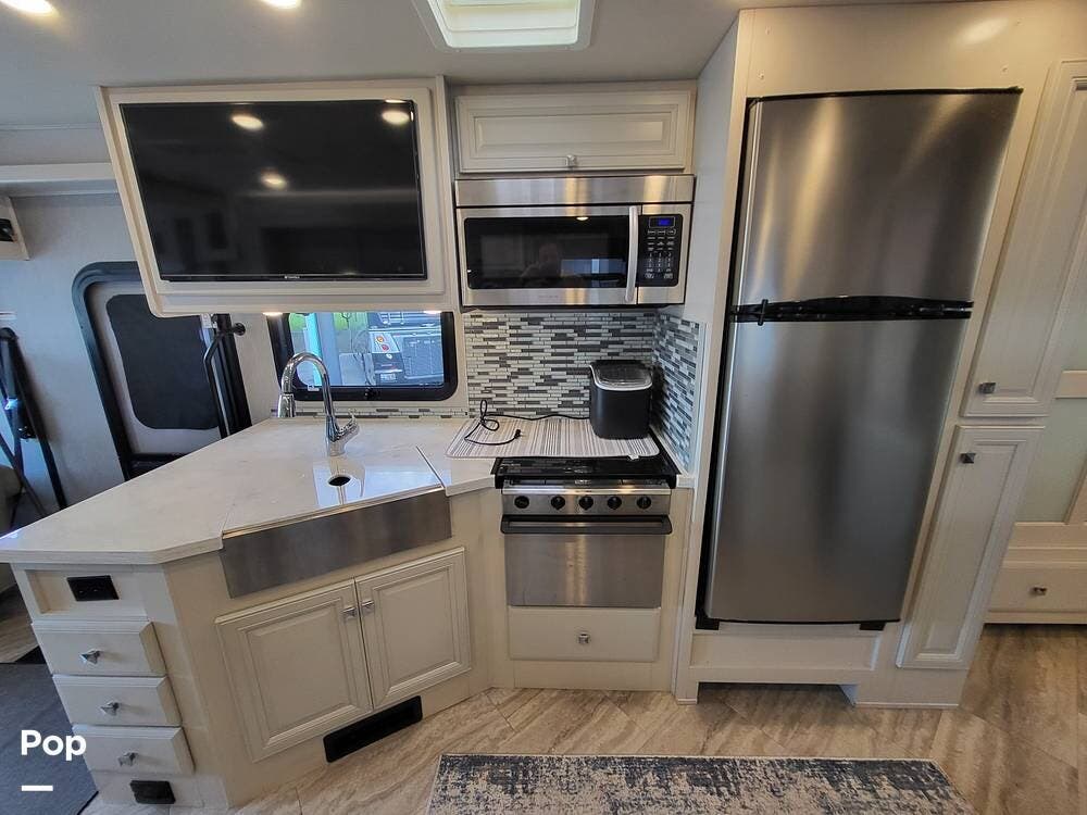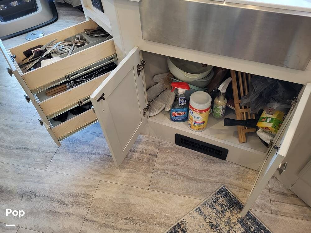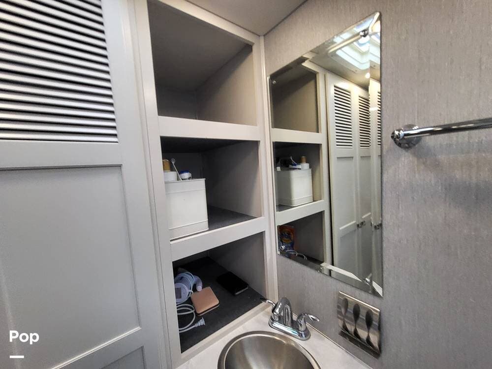 The kitchen is designed for both function and style, boasting a large stainless steel sink, convection microwave, stove, oven, refrigerator/freezer, and a spacious pantry with plenty of drawers and cabinets. A large midship flat-panel TV ties the living area together, creating a welcoming space for relaxing or entertaining.