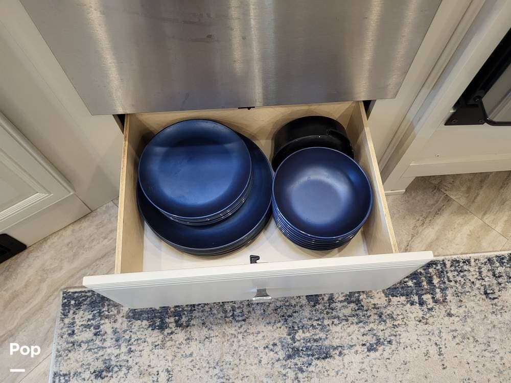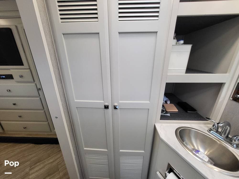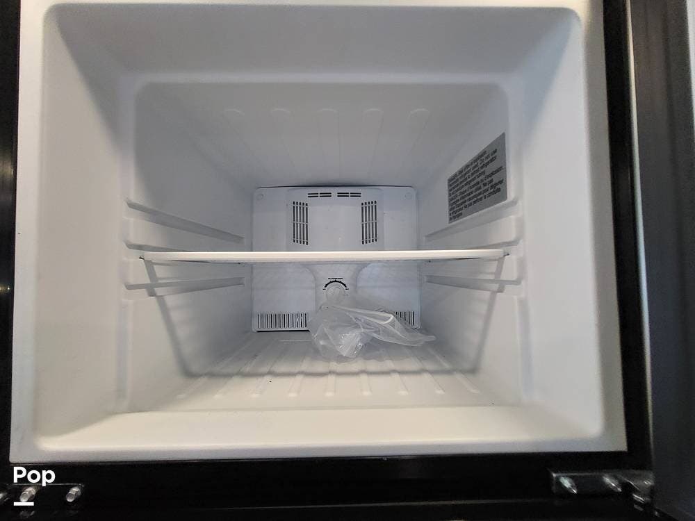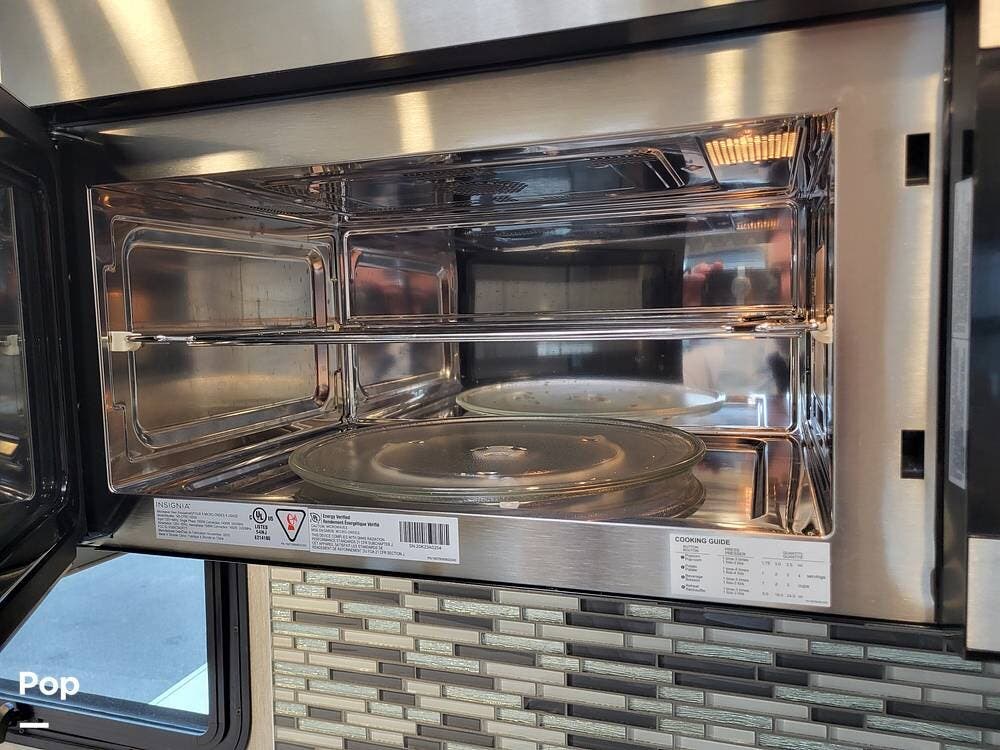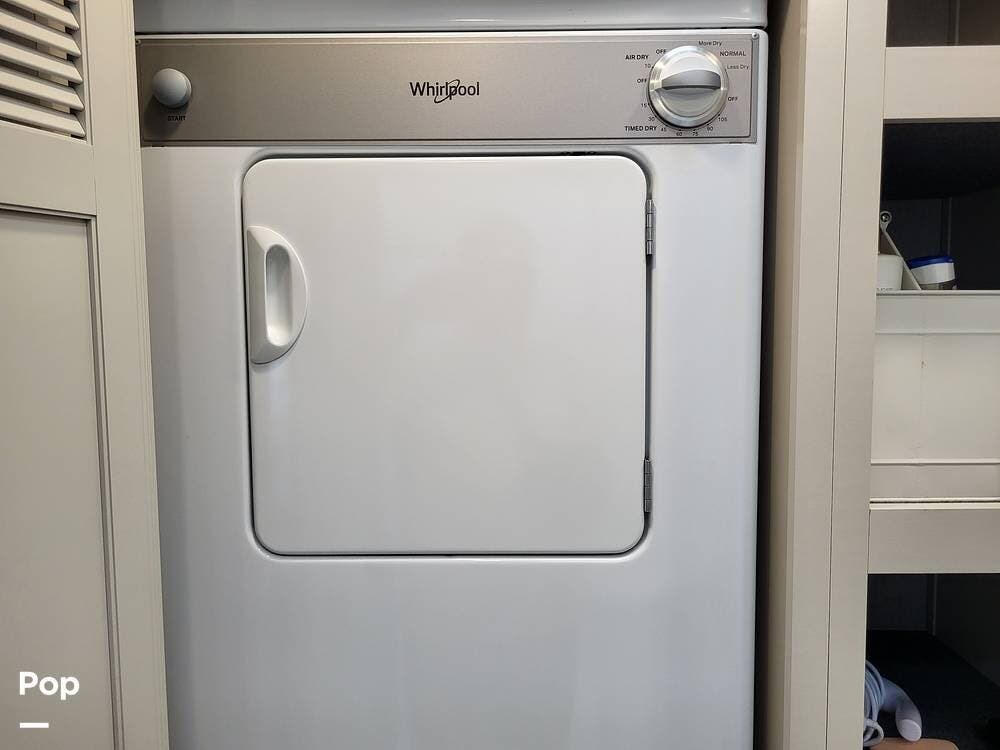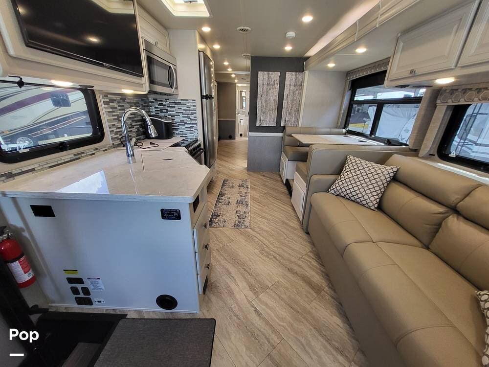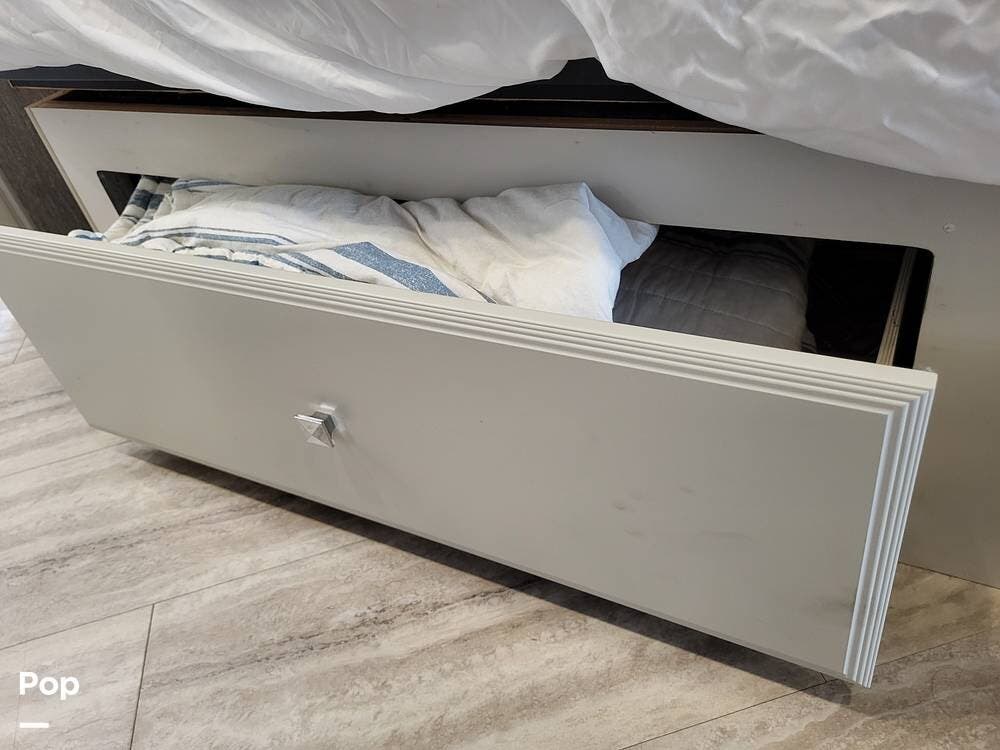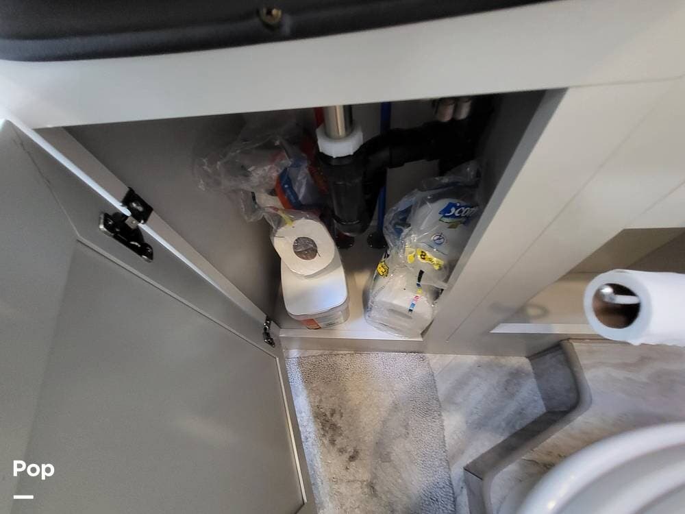 The kitchen is designed for both function and style, boasting a large stainless steel sink, convection microwave, stove, oven, refrigerator/freezer, and a spacious pantry with plenty of drawers and cabinets. A large midship flat-panel TV ties the living area together, creating a welcoming space for relaxing or entertaining.