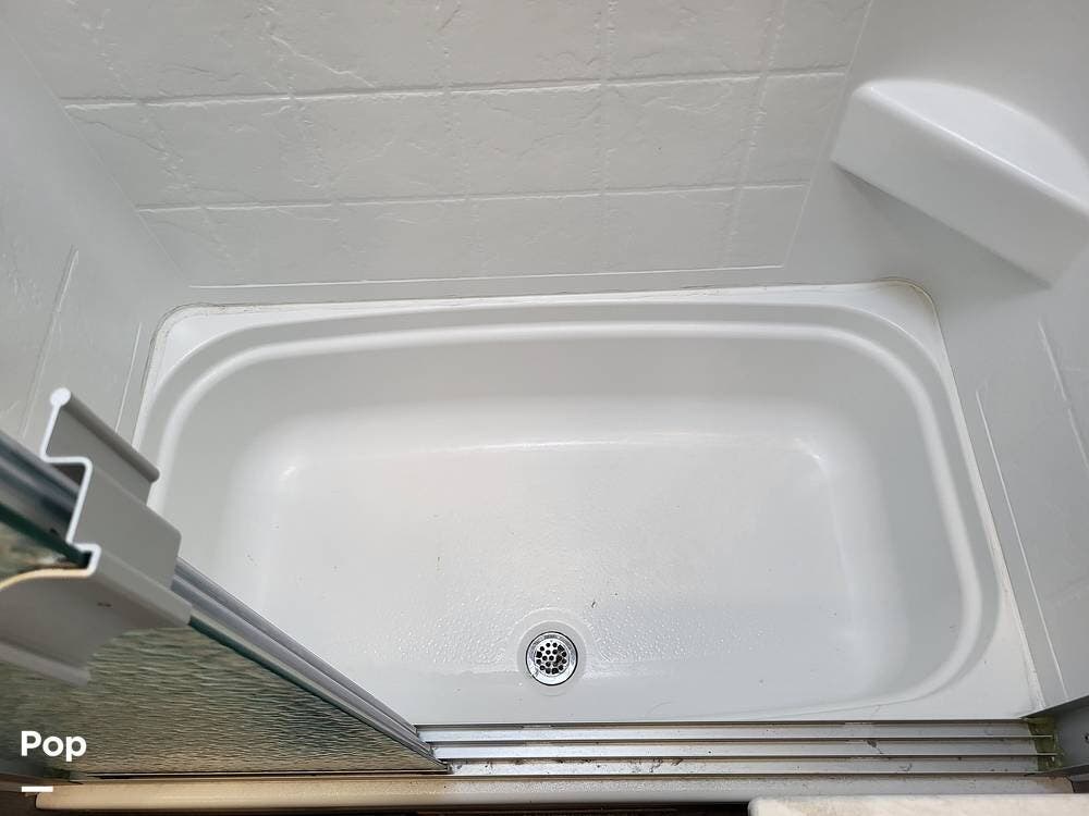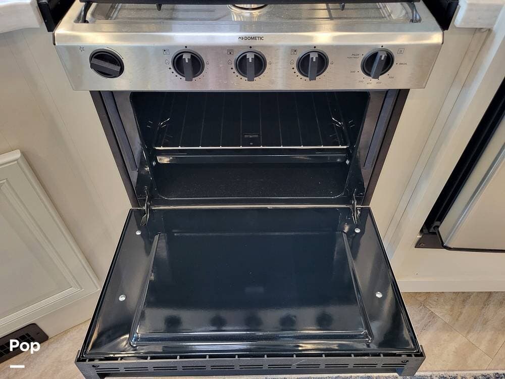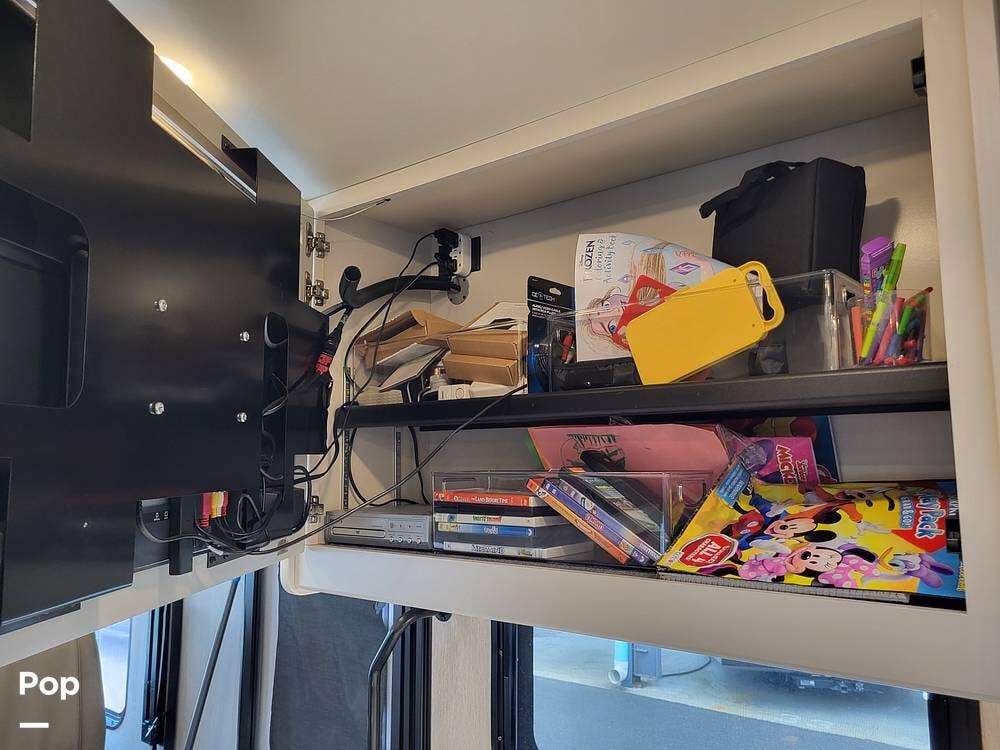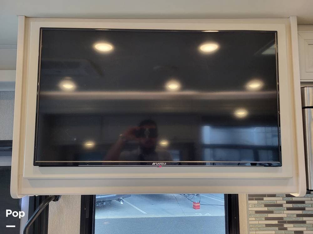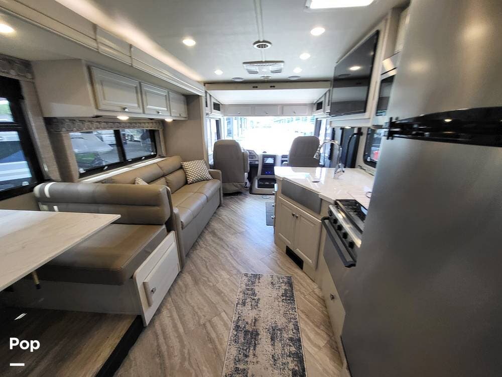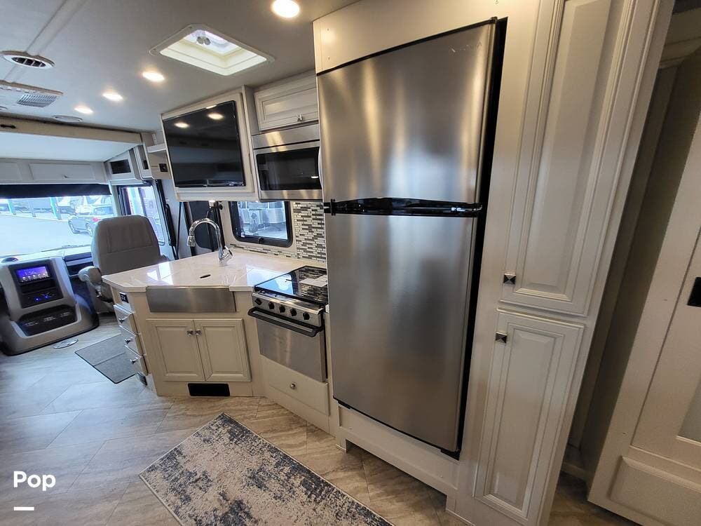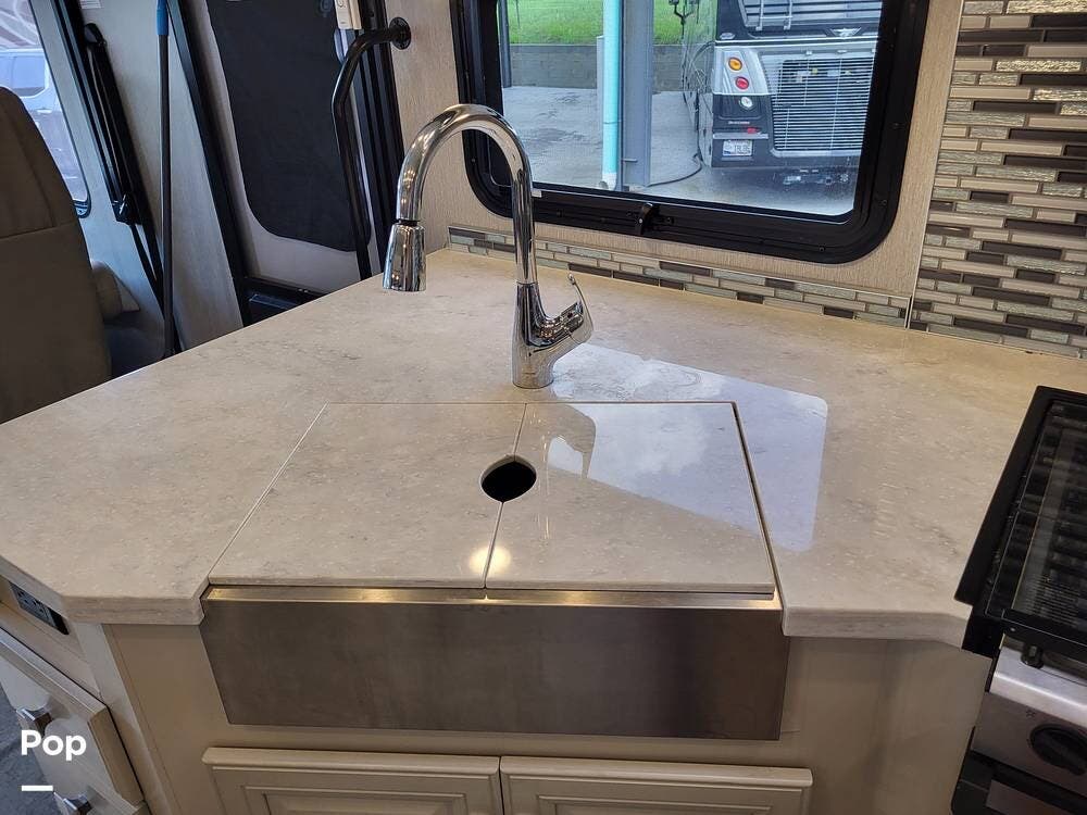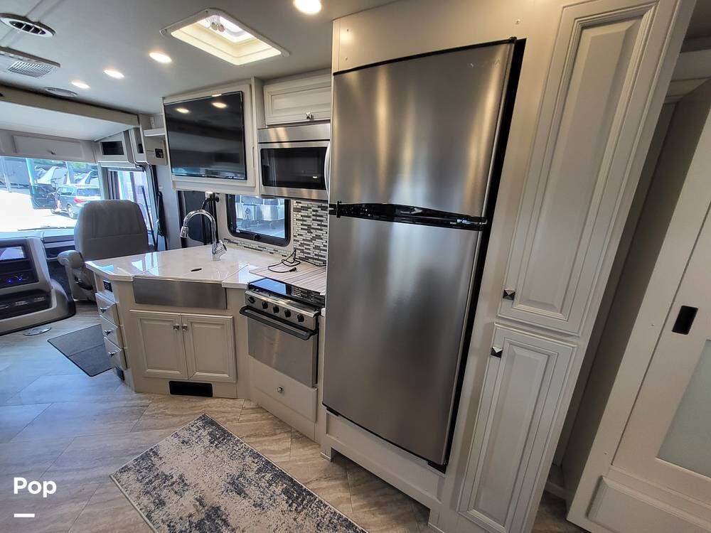 The kitchen is designed for both function and style, boasting a large stainless steel sink, convection microwave, stove, oven, refrigerator/freezer, and a spacious pantry with plenty of drawers and cabinets. A large midship flat-panel TV ties the living area together, creating a welcoming space for relaxing or entertaining.