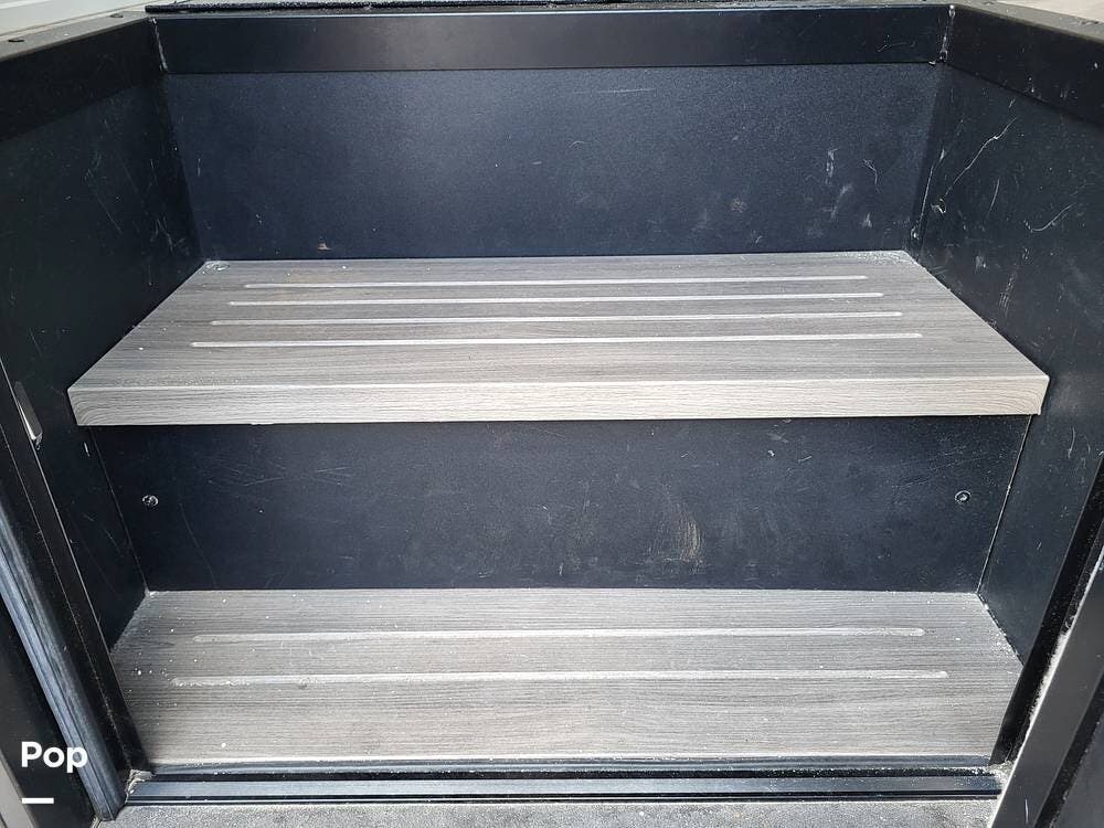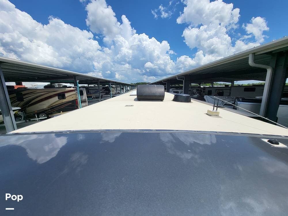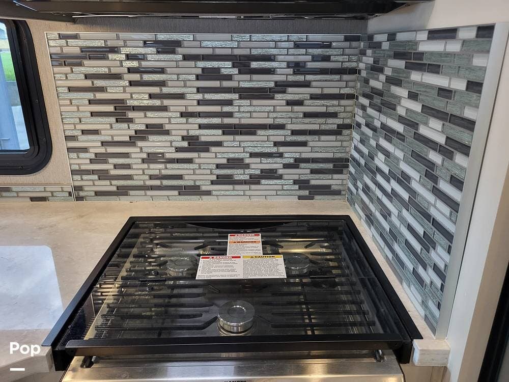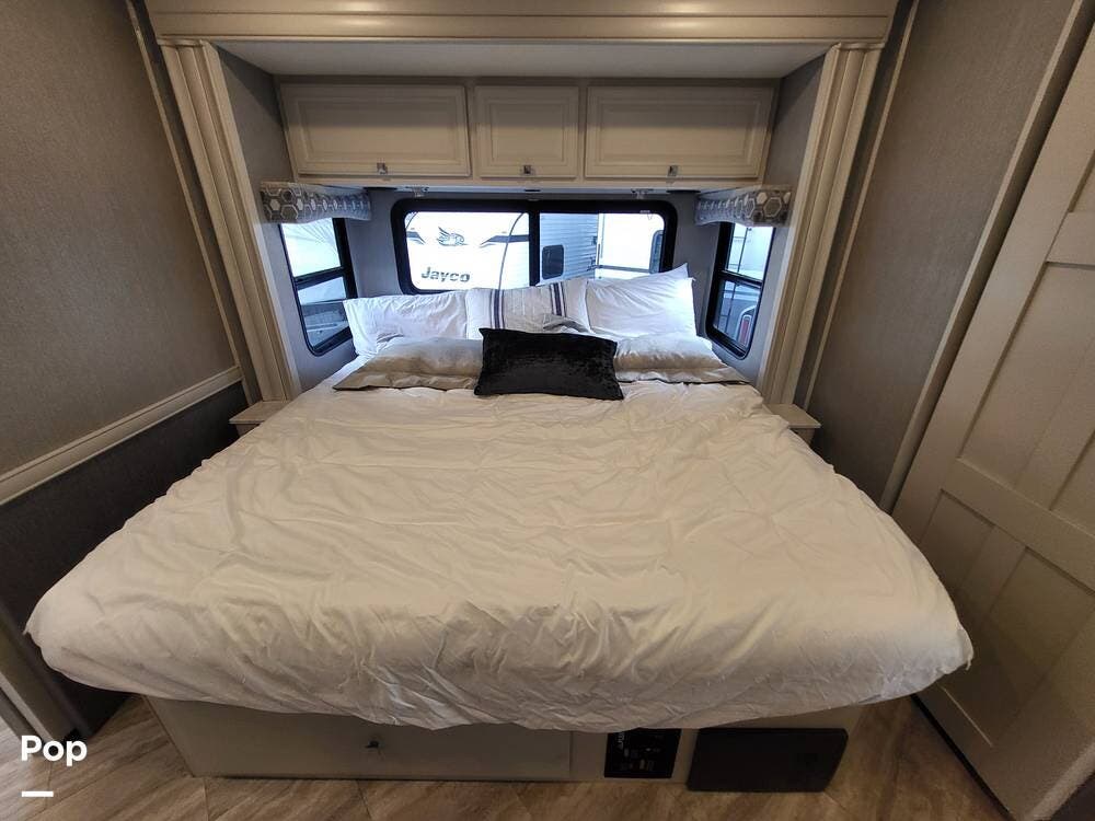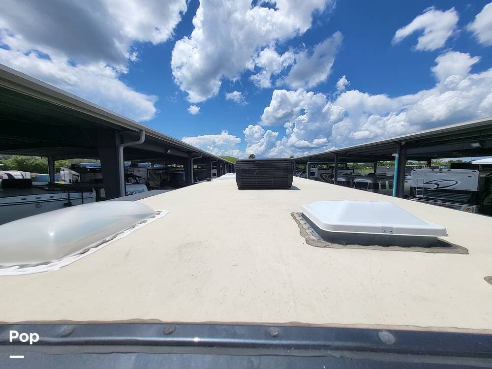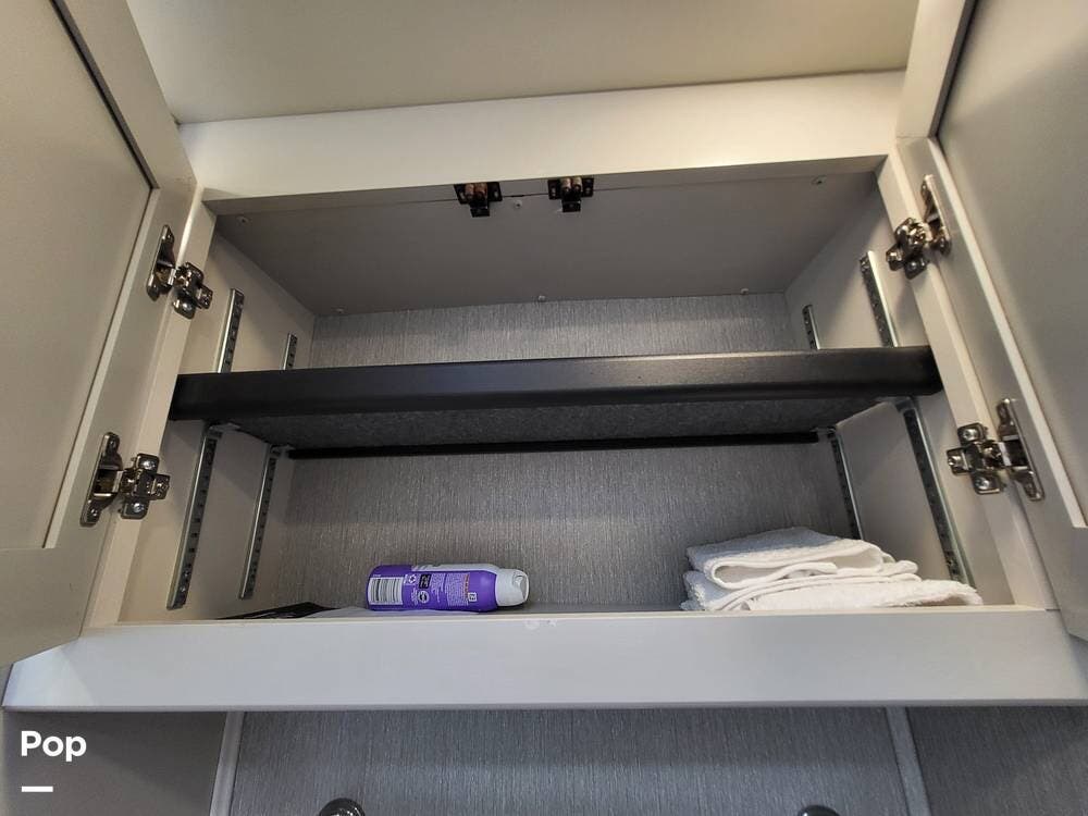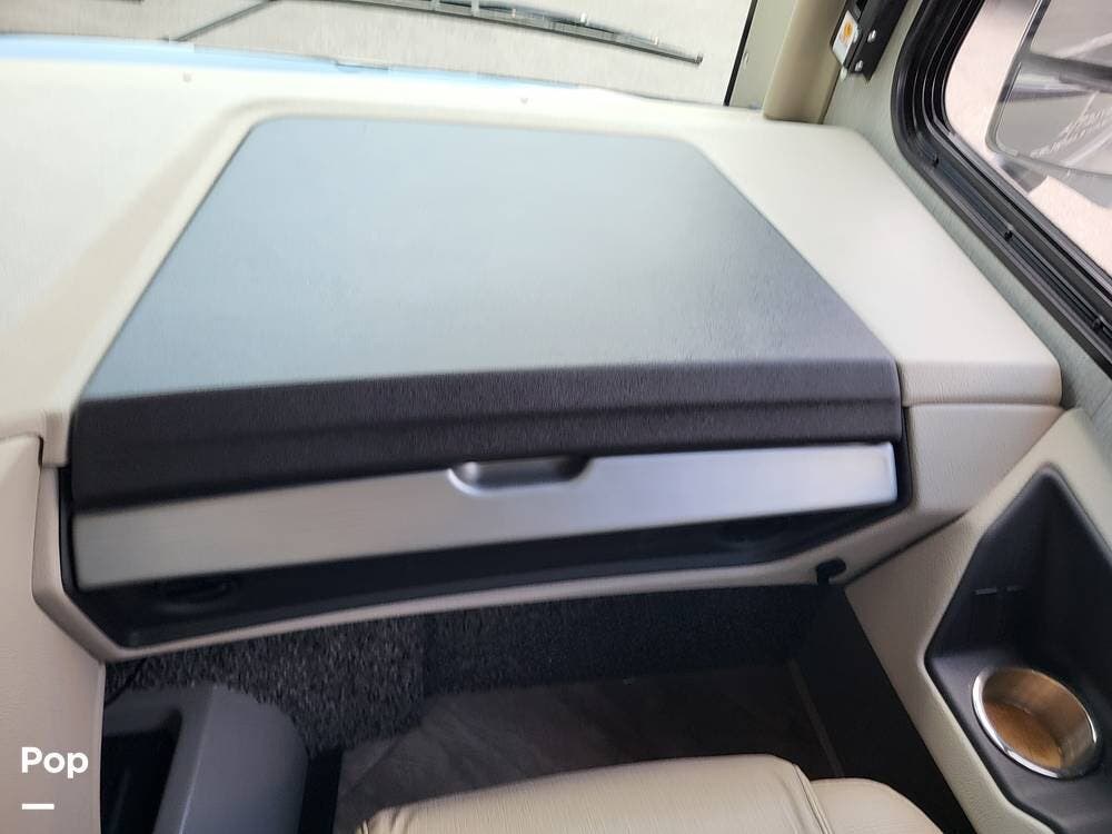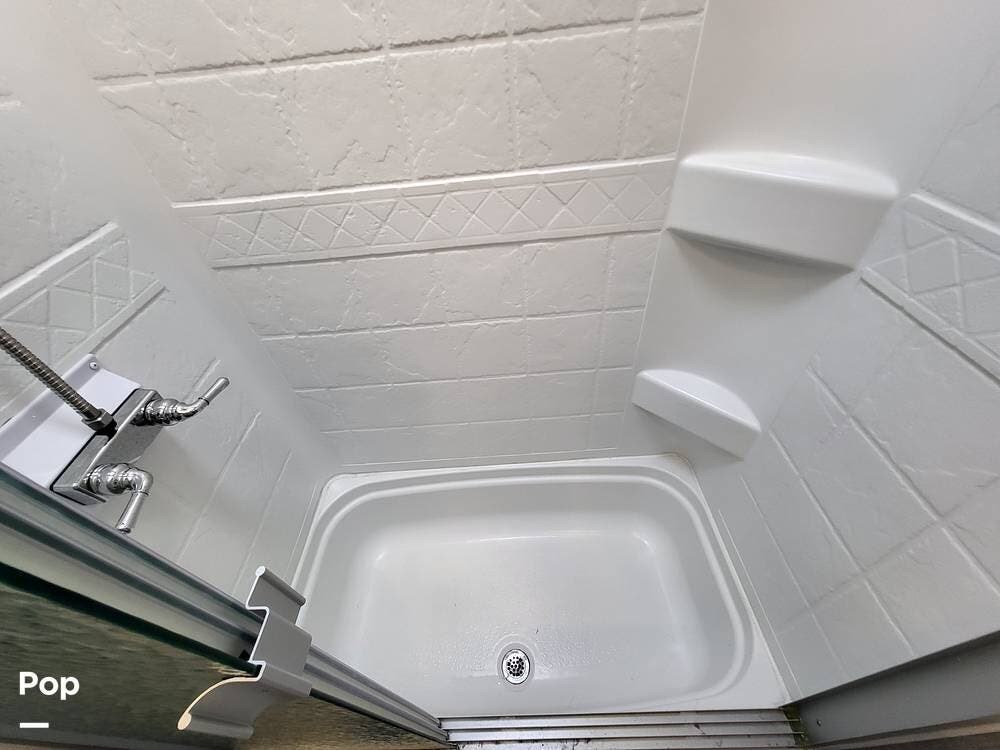 The kitchen is designed for both function and style, boasting a large stainless steel sink, convection microwave, stove, oven, refrigerator/freezer, and a spacious pantry with plenty of drawers and cabinets. A large midship flat-panel TV ties the living area together, creating a welcoming space for relaxing or entertaining.