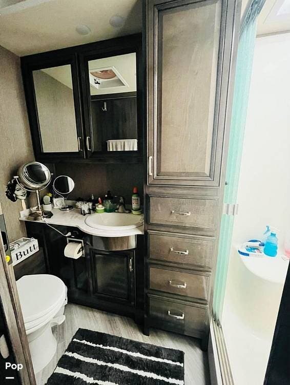 The Vacationer 35K's floorplan boasts a private master suite with his & her wardrobes and a king bed, a rear private full bathroom, and a half bath in the hallway!