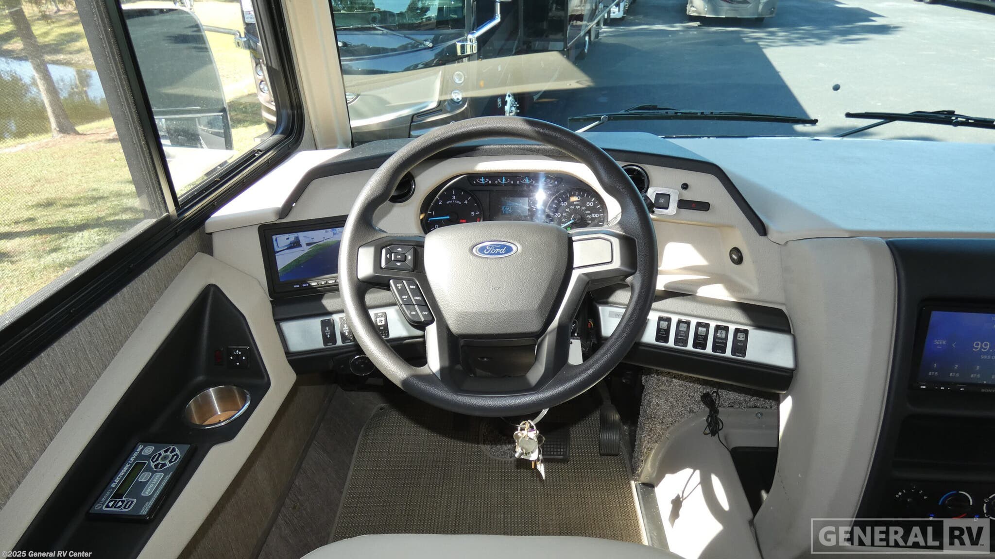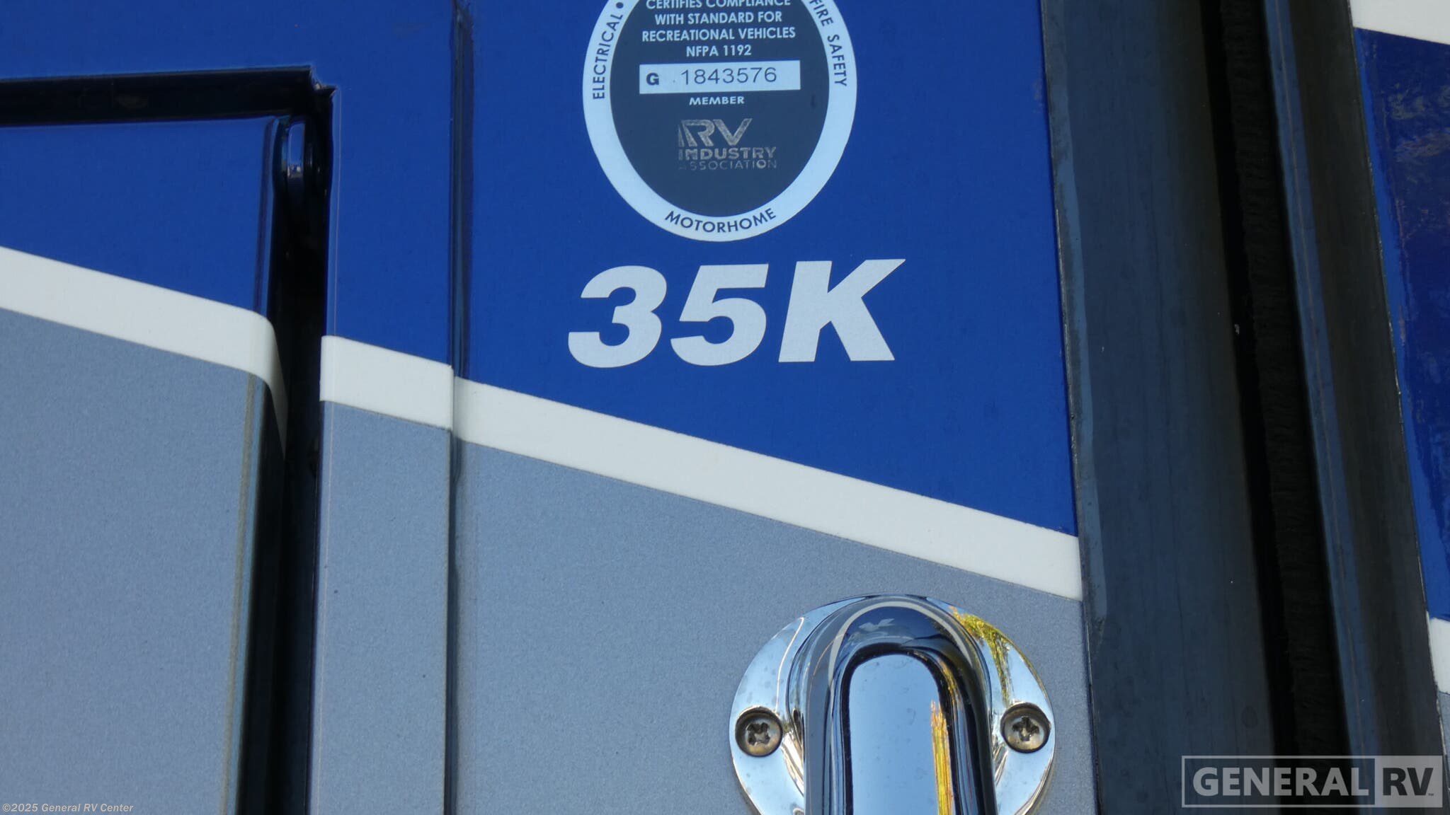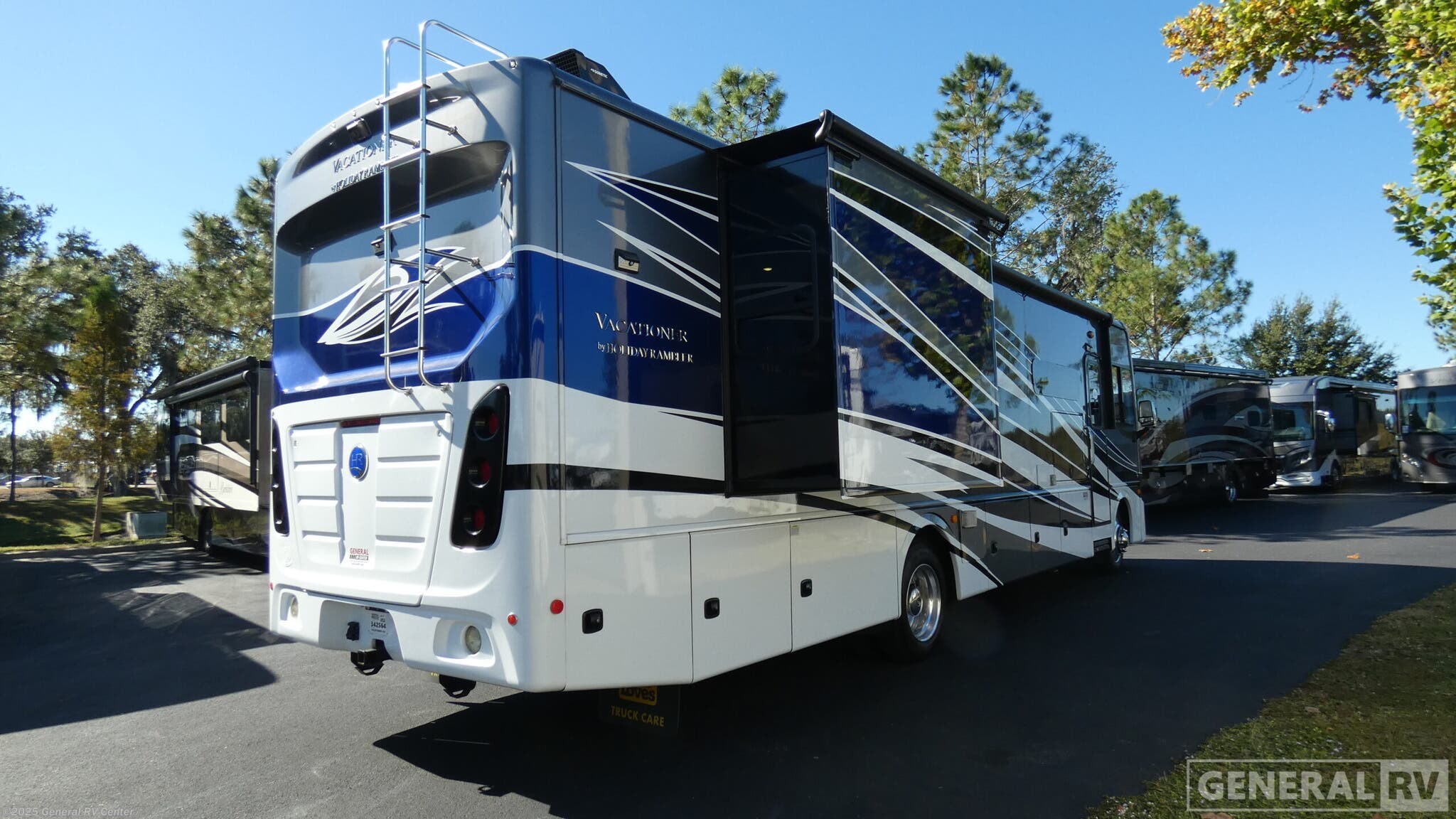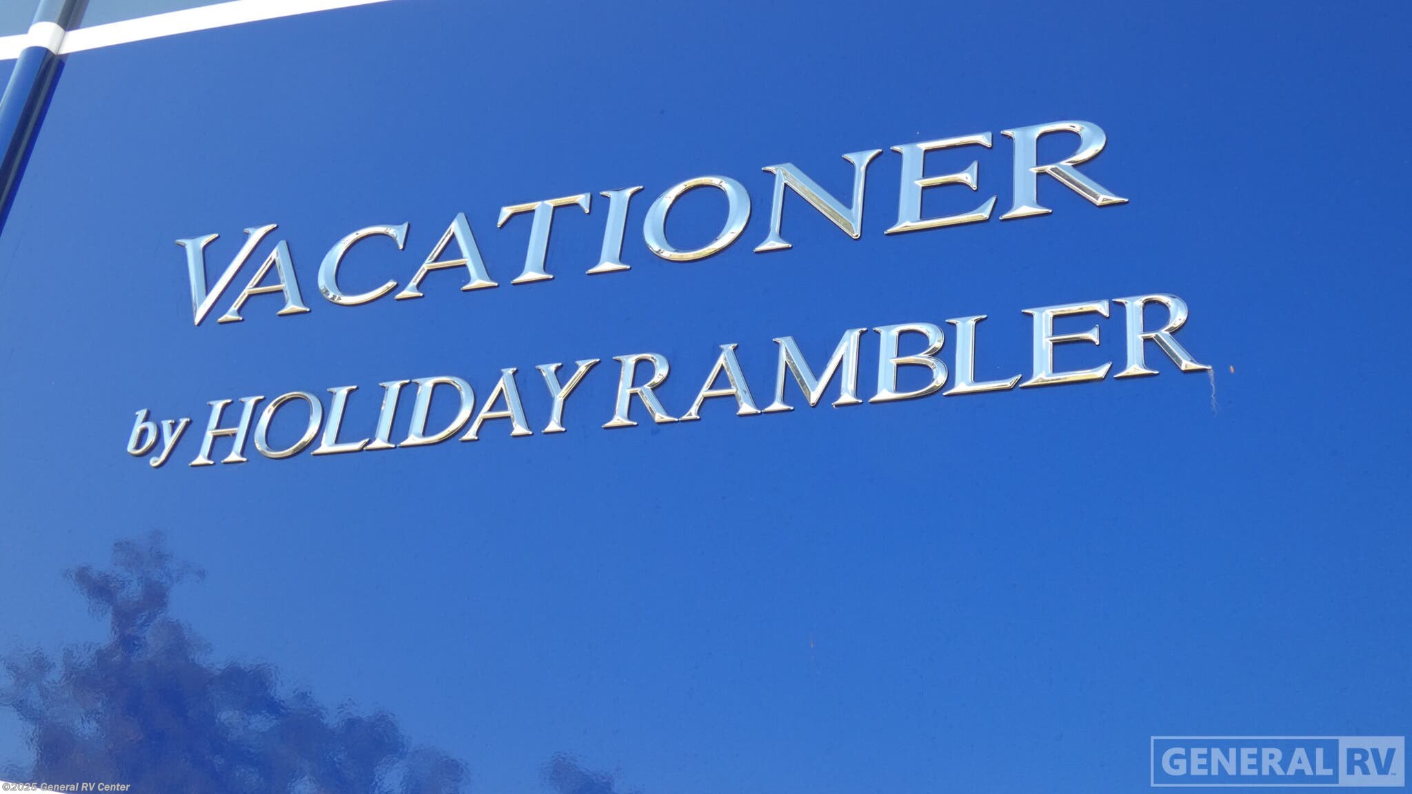 Holiday Rambler Vacationer Class A gas motorhome 35K highlights: Bath and a Half Driver/Passenger Pedestal Table Serenity Series King Bed Electric Fireplace CPAP Storage Traveling with family or a large group of friend is easy in this motorhome that includes a bath and a half, plus sleeping space for up to four people each night. Once you arrive at your destination, put out the electric awning with LED lighting while the kids stretch their legs around the campground. You all can enjoy lunch outside while the big game plays on the exterior 40" LED TV. Inside, you'll find seating space on the theater seats, the booth dinette, and the swivel captain's seats, and the 40" LED TV and electric fireplace will be perfect if the weather isn't cooperating outside. This model includes plenty of storage space for all your valuables, including dual bedroom wardrobes, a pantry for dry goods, plus an exterior pass-through for your larger camp gear! Make each trip memorable in a Vacationer Class A gas motorhome by Holiday Rambler. The new 7.3L Triton V8, 350 HP engine features 468 lb./ft. torque with 6-speed Torq-Shift automatic transmission with overdrive and tow/haul mode so you can conquer any excursion. Outside, you'll find frameless dual pane windows, a pass-through storage for all of your belongings, plus an eye-catching premier full body paint. Each model is constructed with an aerodynamic front cap with hood and automotive headlights, a powder coated steel frame chassis, and aluminum welded interlocking frames for a durable motorhome made to last. Inside, the MultiPlex wiring control system with mobile app will allow you to manage your units functions with ease, and the dual 15,000 BTU A/C units are sure to keep you comfortable during those hot summer months. You will appreciate adjustable shelves throughout the kitchen for all of your necessities, C-Pap machine prep in the bedroom for your convenience, 120V/USB ports to charge your gadgets, plus many more interior amenities!