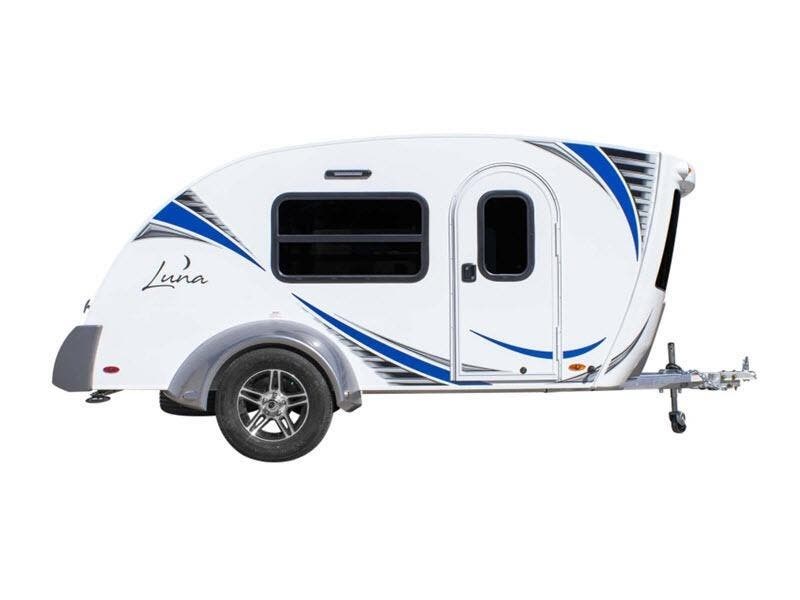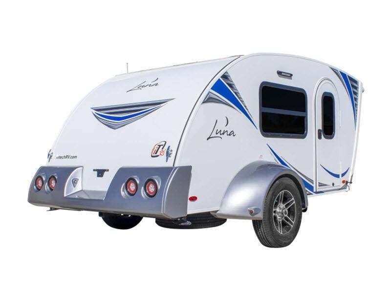 Each Luna teardrop trailer by inTech RV is constructed with an all-aluminum, all-tube, cage frame, a one piece fiberglass roof, plus bubble foil R7 insulation to provide a durable unit made to last. You will always stay cool with the 8,000 BTU A/C and the MaxxAir vent fan. Each model includes an outside kitchen with a 40qt. 12V cooler to store your cold food, a stainless steel cooktop, plus plenty of storage space for all your necessities. Inside, you'll enjoy the Infinity Woven flooring, two tinted windows with shades and screens, a Bluetooth stereo with four speakers and a 32" TV, plus USB ports and outlets to keep your phone and tablet charged. You'll appreciate the 1,775 lbs. to 1,850 lbs. dry weights for easy towing and there are many optional features to choose from, like the Sunseeker awning, the windshield covering, a fireplace, plus more! Choose your favorite layout today