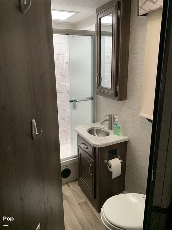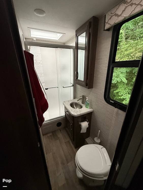There are 2 slide outs, one for the Master Queen bed, and one for the dining room, making the interior very spacious. There is a separate indoor shower, which is roomy too, so this RV could be easily used as a home, second home, or investment property.