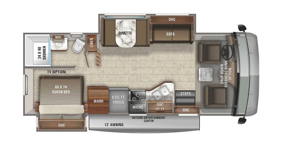 Once you're on board, you'll see how comfortably and ergonomically this RV was designed. Family members, as well as guests, will love the intuitive layout with its handy swivel power driver's and passenger's seat, convertible dinette sleeper, sleeper-sofa, power drop-down over-cab bed, flat-panel TVs inside and out, microwave, stove with cooktop cover, matching front refrigerator freezer, solid countertops and master sleeping quarters with a queen-size bed with under-bed storage!