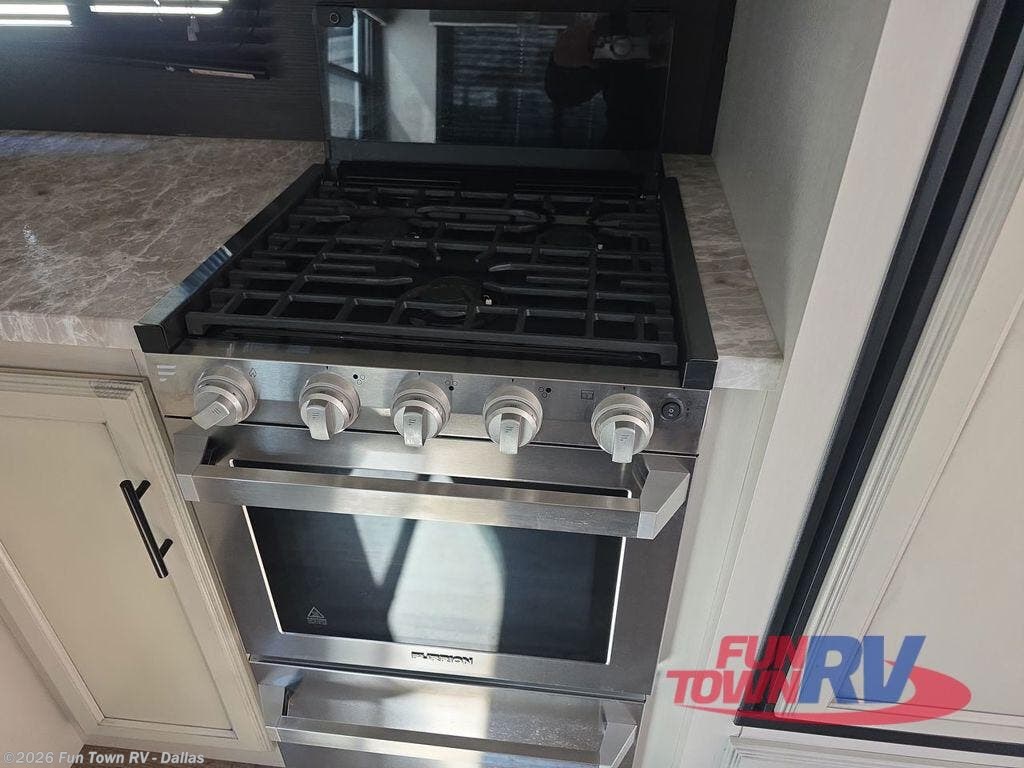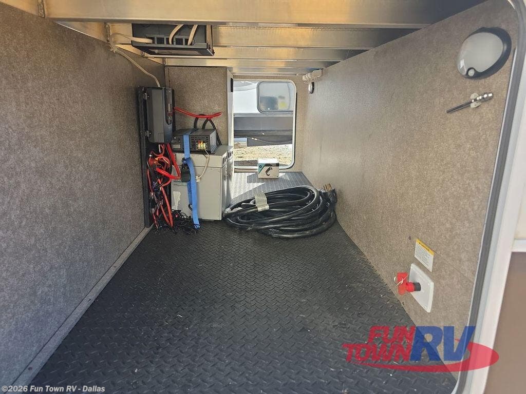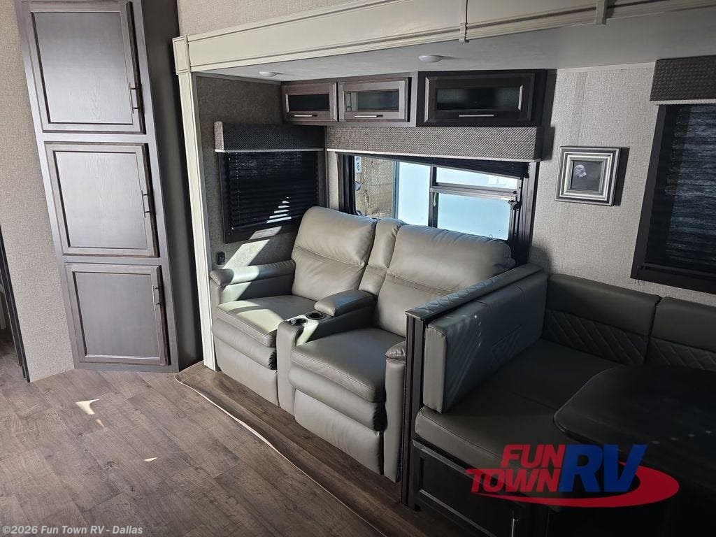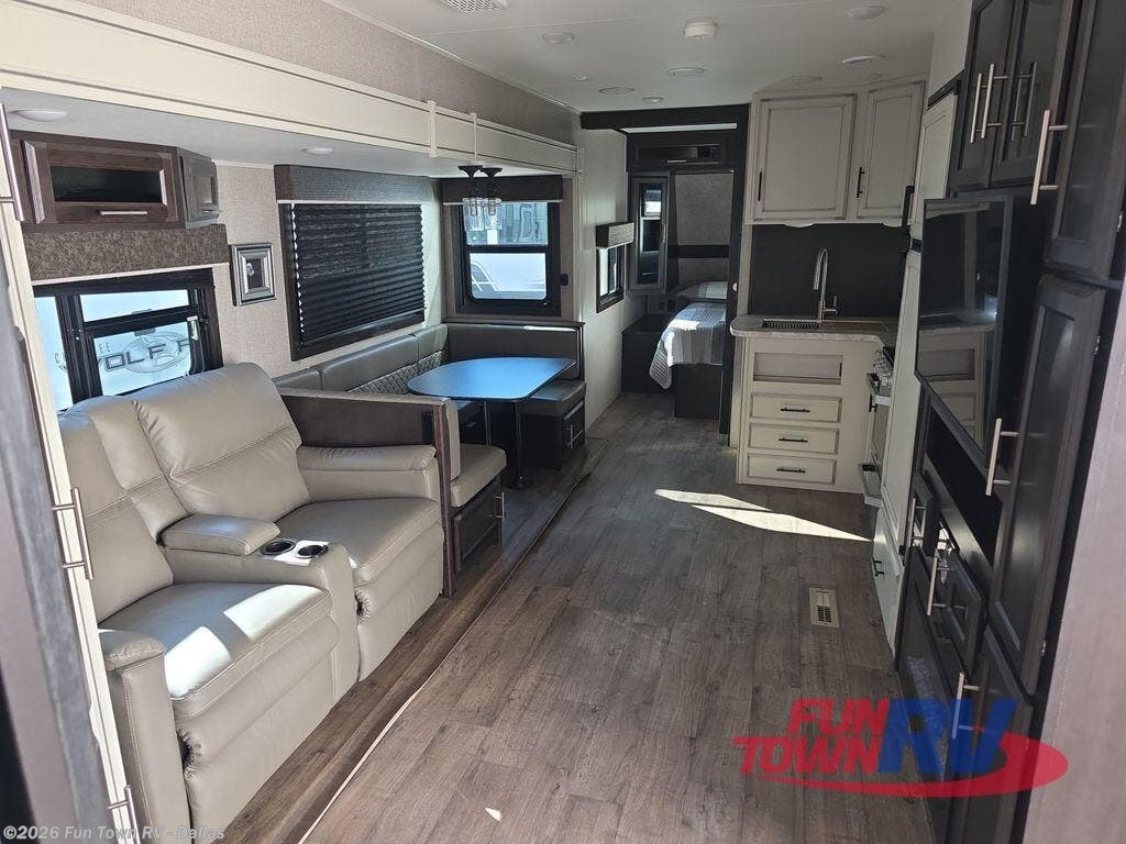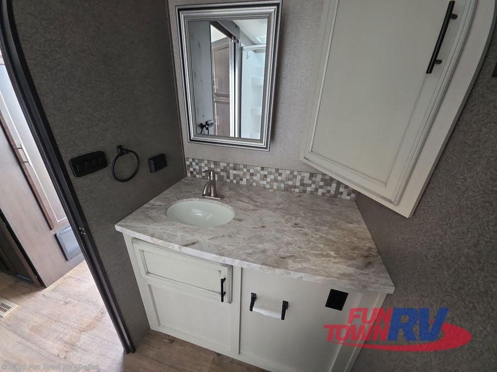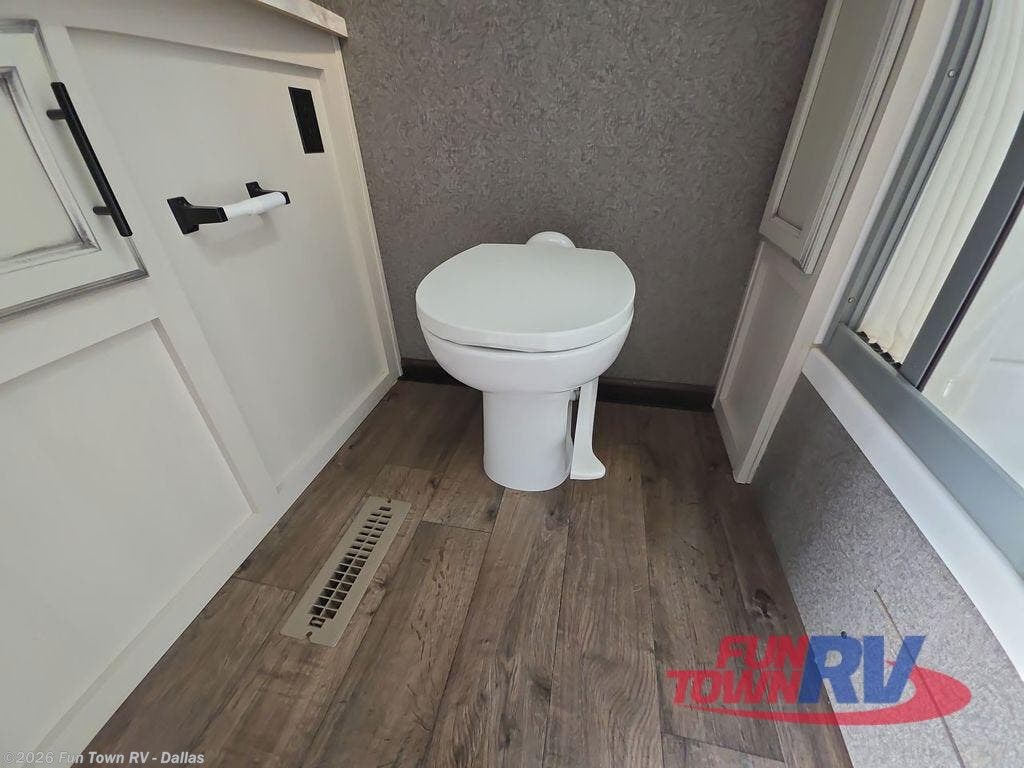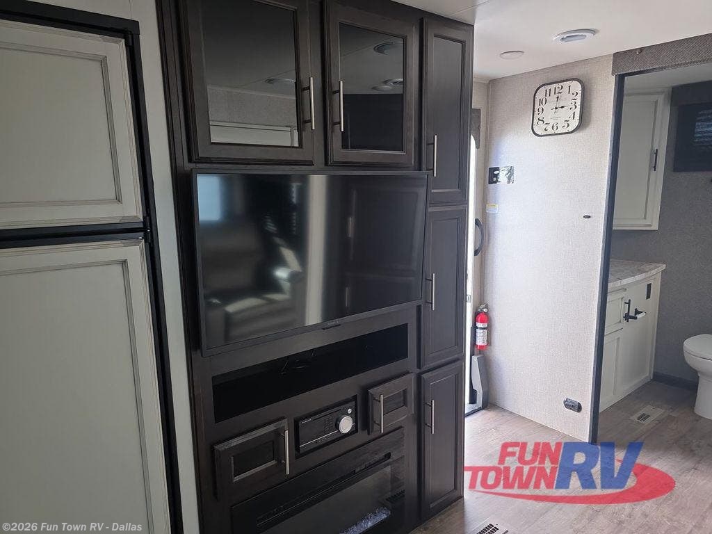 This rear bathroom floorplan is perfect for your family of six looking for fun and adventure. Once you arrive at your destination the chef of the family can prepare lunch on the outside kitchen and you can enjoy it under the 19' electric awning with LED lights. You'll also find a huge pass-through storage outside, as well as a universal docking station and strut-assist Step Above entry steps for convenience. Head inside to play a game of cards around the U-shaped dinette, or watch a show on the LED HDTV. You can choose to add the optional fireplace if you're wanting a more at-home feel. The front private bedroom includes a walk-around queen bed, three wardrobes, plus its own exterior entrance door!