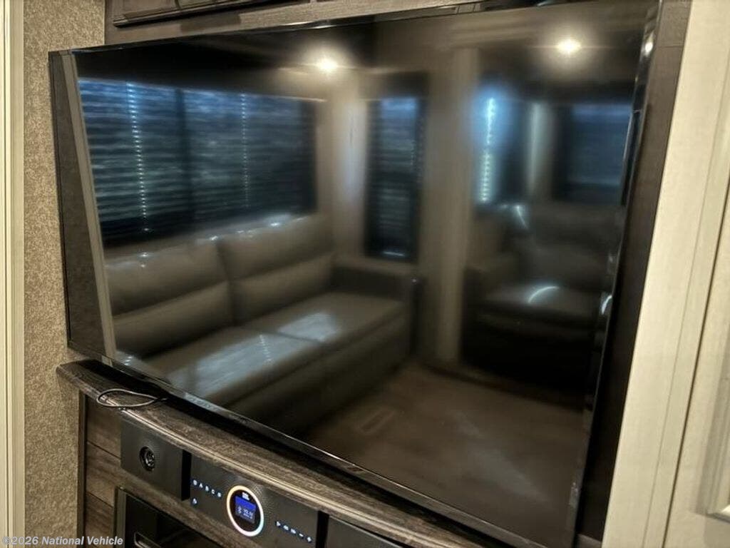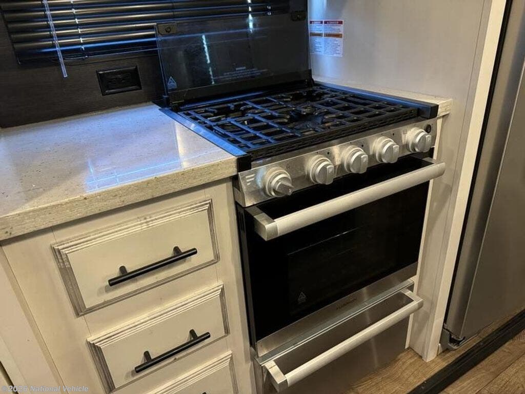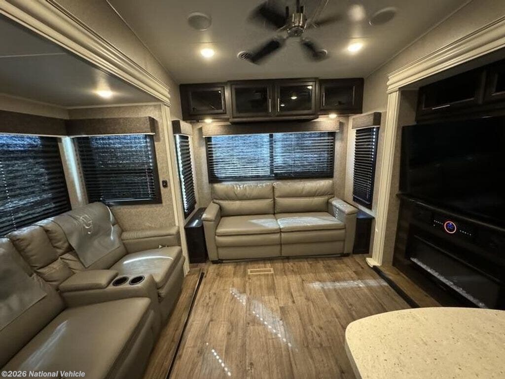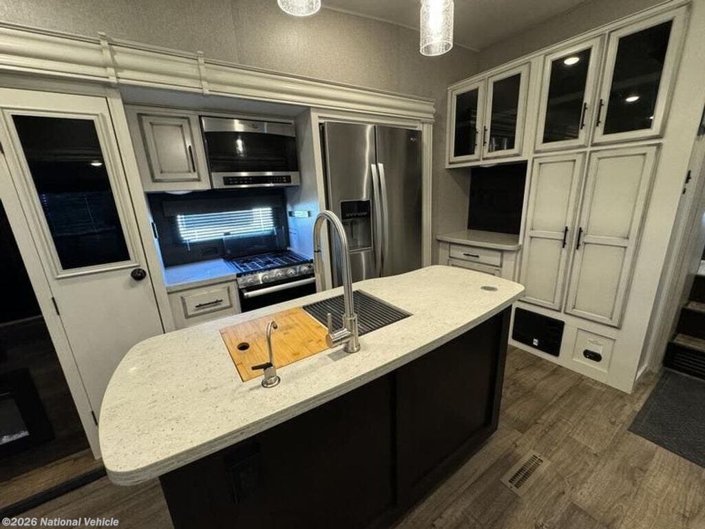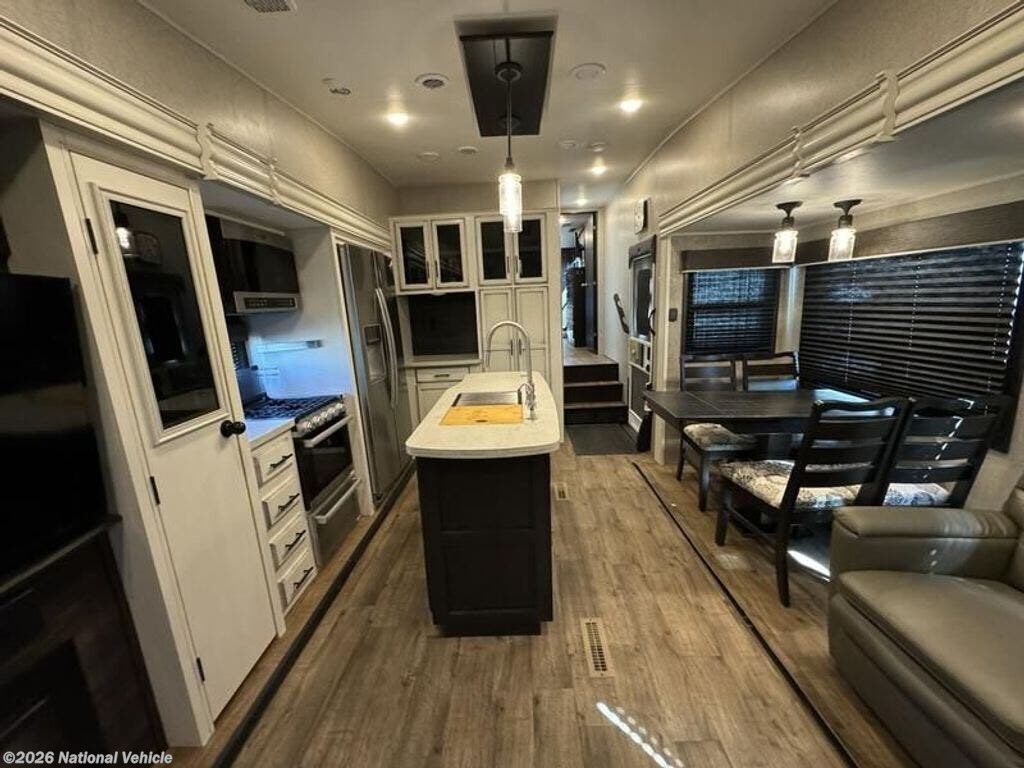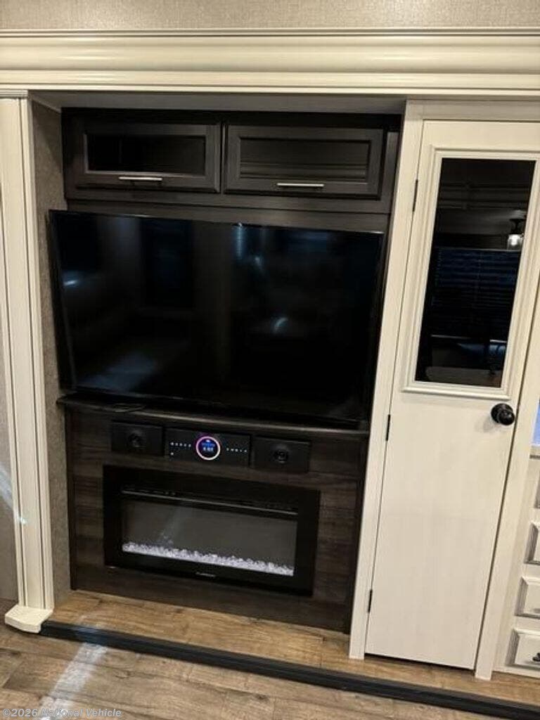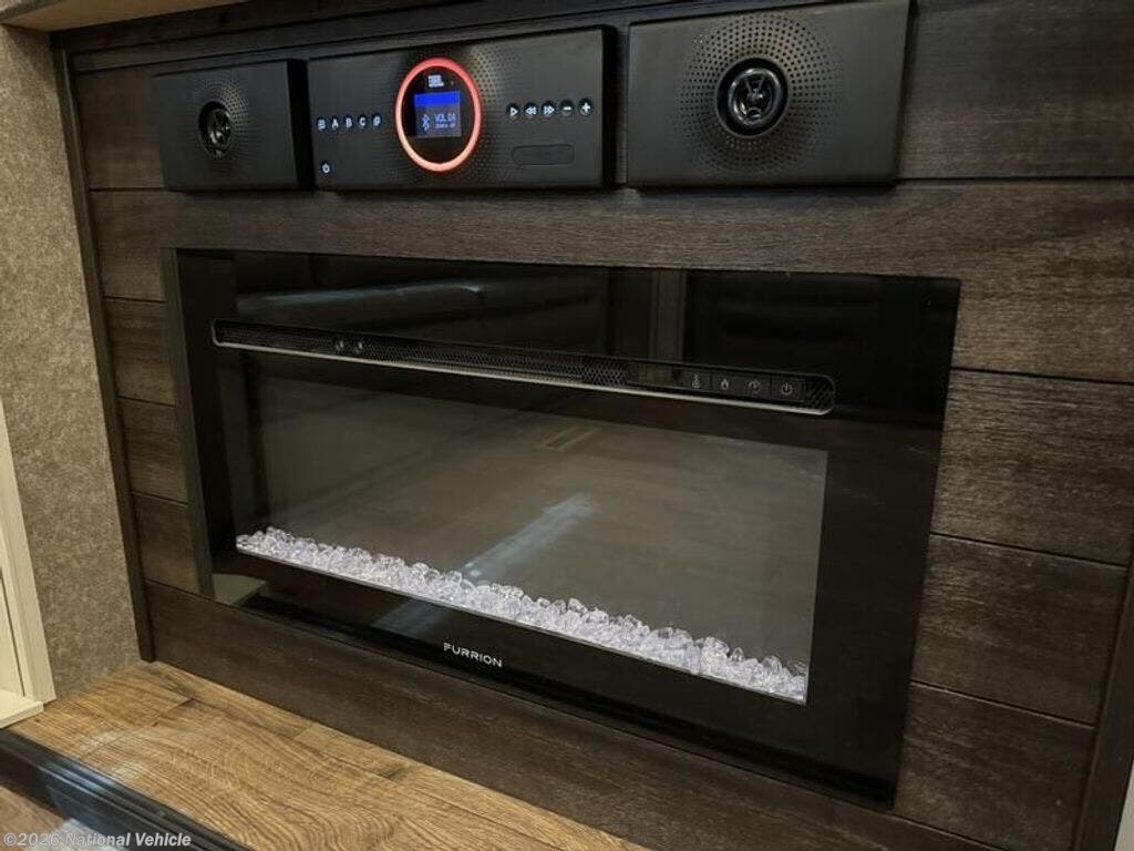 Inside, the open layout feels bright and inviting. The rear living area is perfect for relaxing with theater seating, a tri-fold sofa, and a fireplace beneath the large 50? HDTV. The kitchen is a chef?s dream, offering a residential refrigerator, 3-burner cooktop, walk-in pantry, and central island with extra prep space.