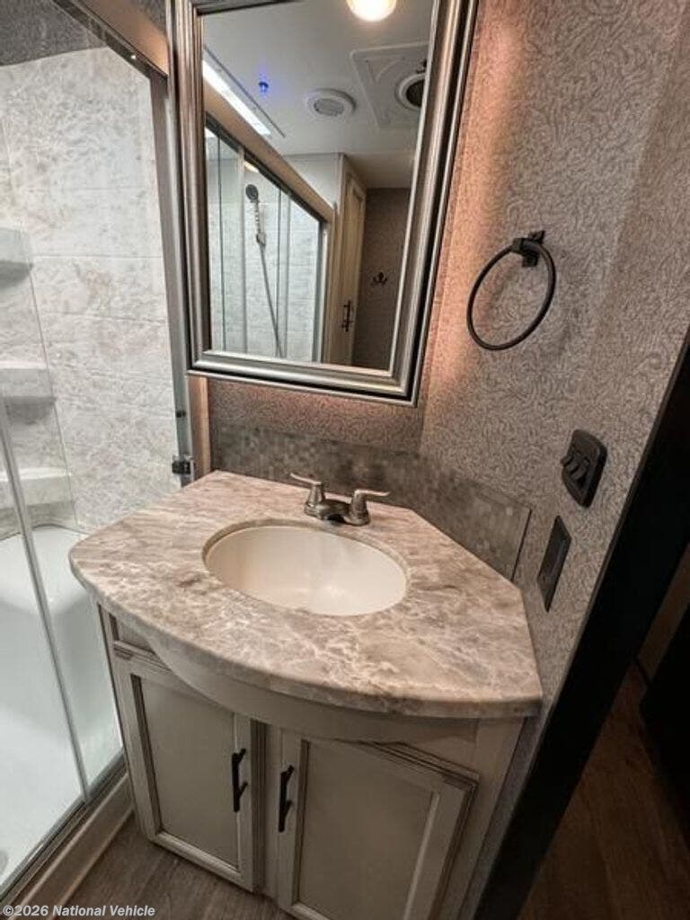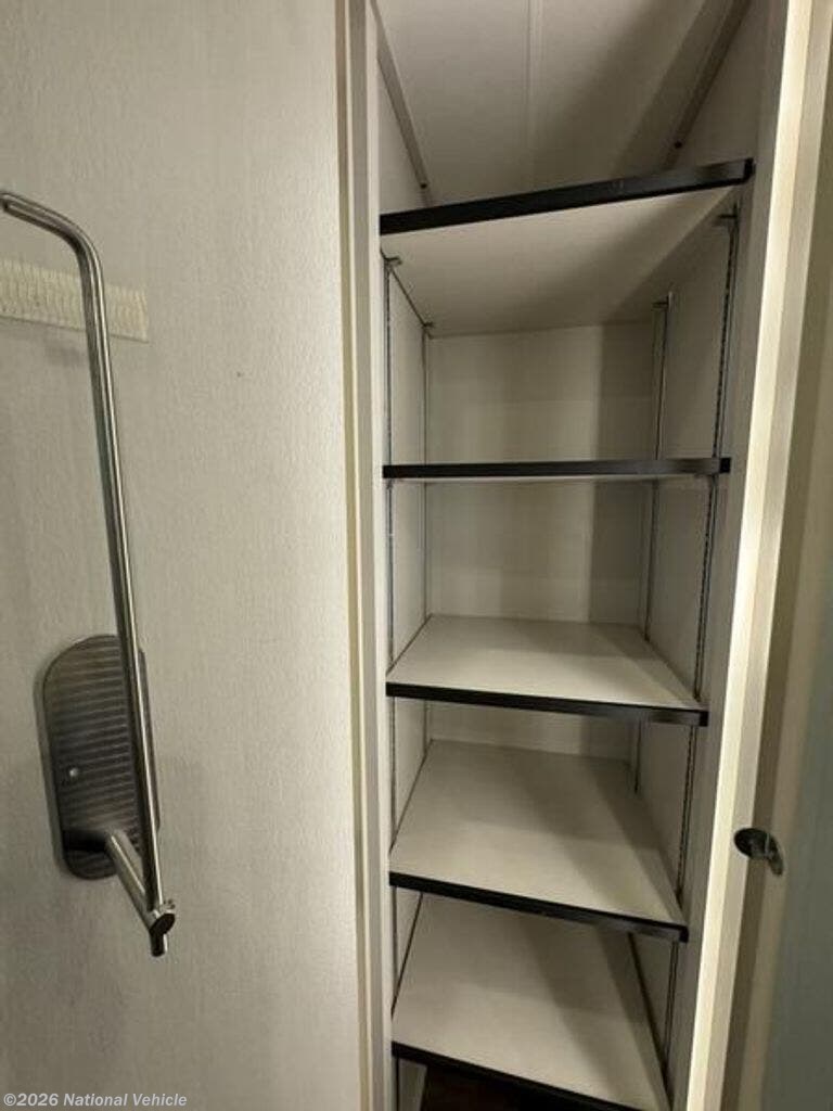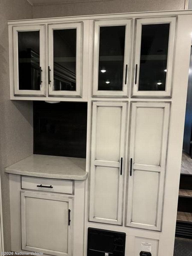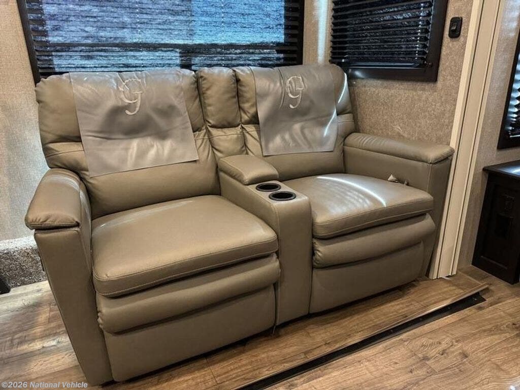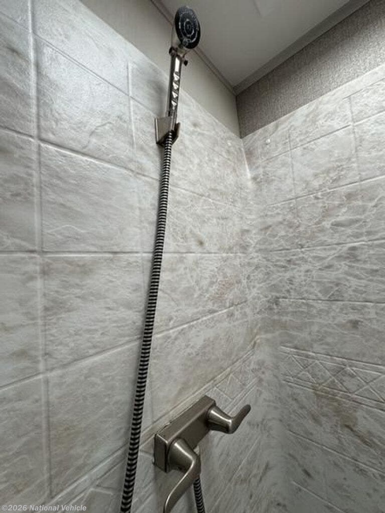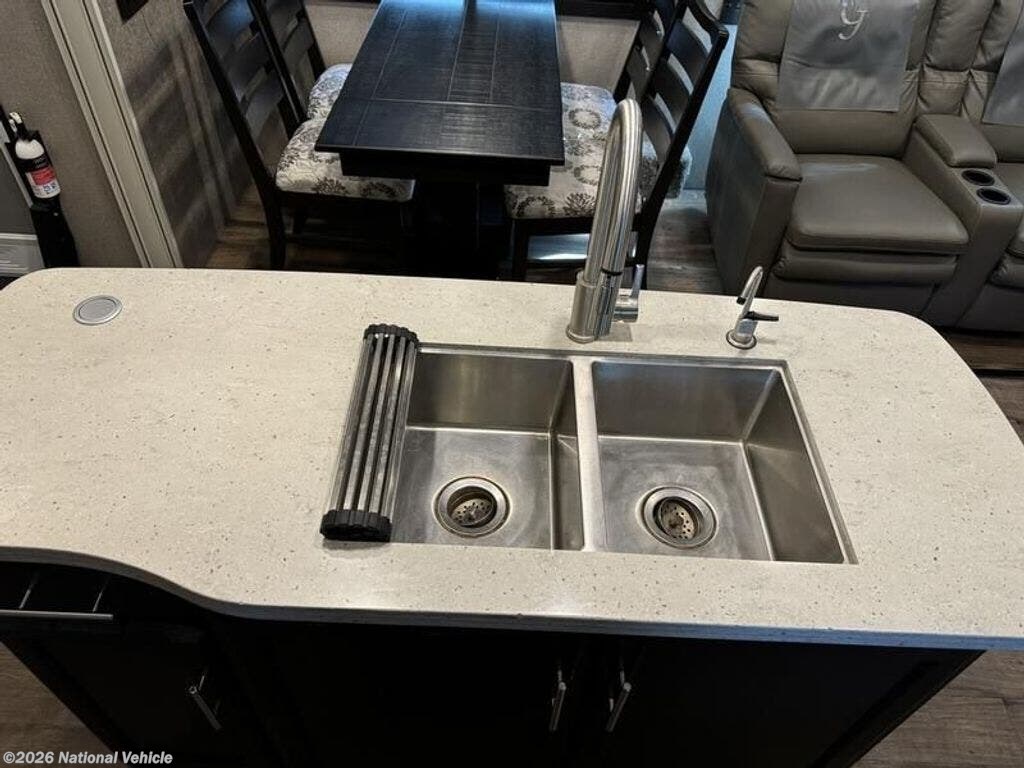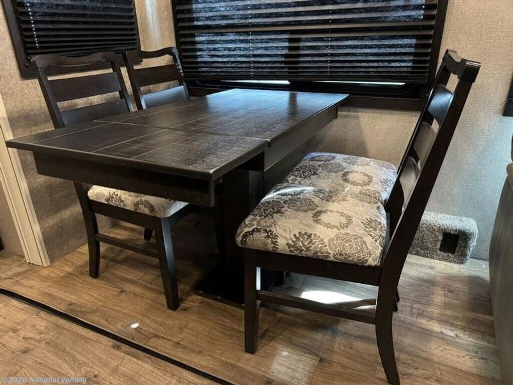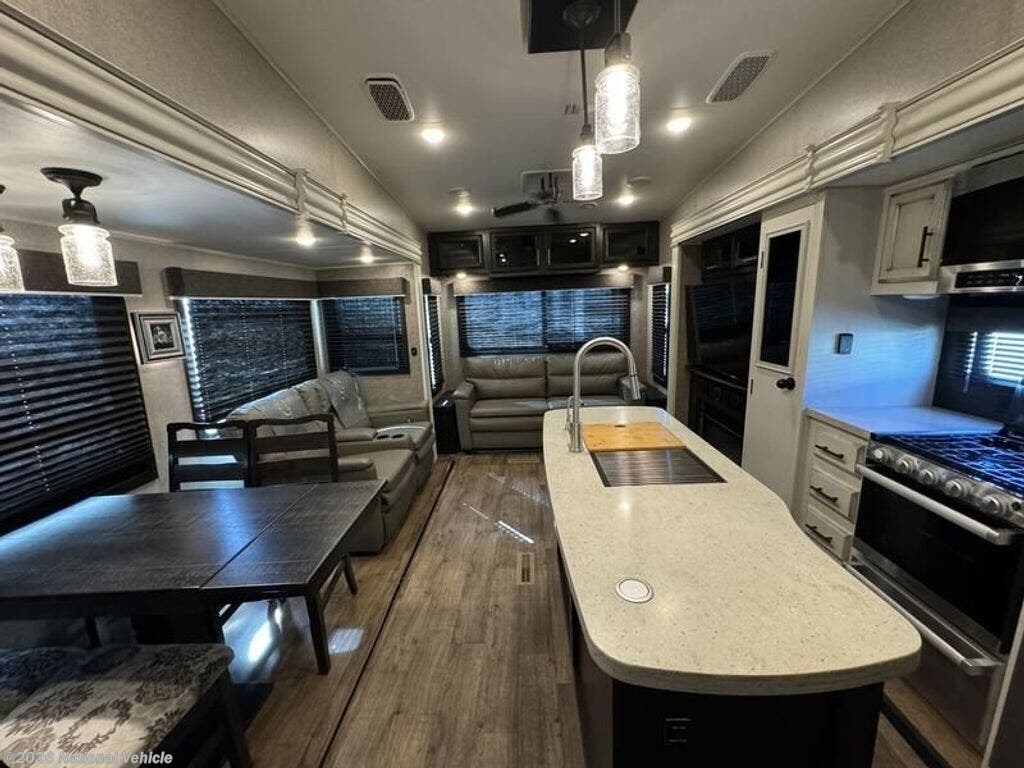 Inside, the open layout feels bright and inviting. The rear living area is perfect for relaxing with theater seating, a tri-fold sofa, and a fireplace beneath the large 50? HDTV. The kitchen is a chef?s dream, offering a residential refrigerator, 3-burner cooktop, walk-in pantry, and central island with extra prep space.