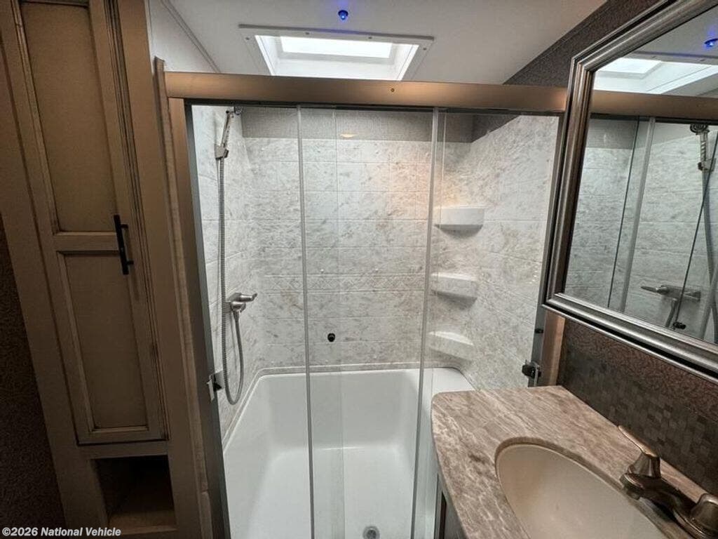 The private front bedroom features a queen bed (optional upgrade available to a king Serta mattress), full wall wardrobe with shelving, and washer/dryer prep for extended trips. A spacious bathroom with a 60? shower and built-in seat adds residential comfort.