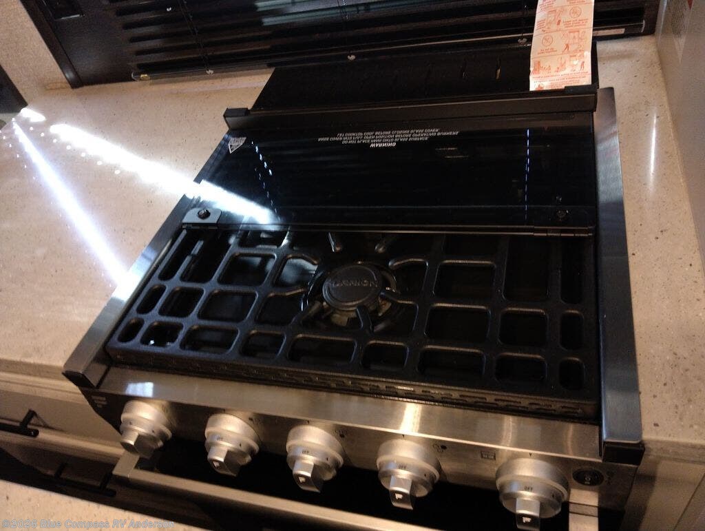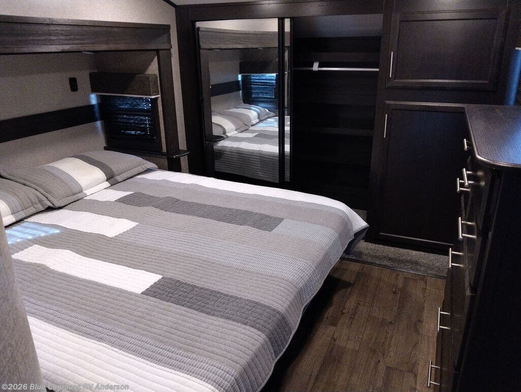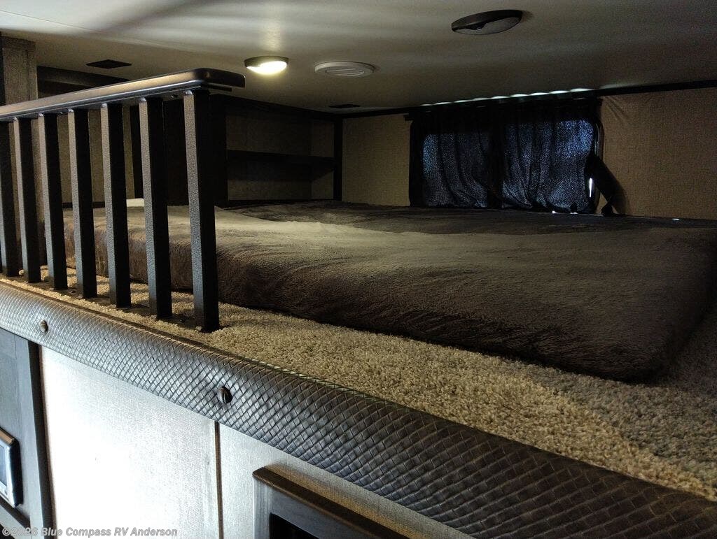 Find your favorite campsite then load up this two bedroom fifth wheel! The front private bedroom features a comfortable queen bed that can be switched out for an optional king Serta mattress, a walk-in closet with shelving and an area prepped for the optional washer and dryer. The second bedroom has a desk for you to get some work done, a hide-a-bed sofa with a top bunk and a 64" x 76" loft above it all. You can prepare your best meals in the kitchen with the island, the 21 cu. ft. residential refrigerator, and the three burner cooktop, and then comfortably enjoy eating them at the free standing table with chairs. The rear living area has a tri-fold sofa and theater seating across from an entertainment center with a fireplace and a 50" HDTV with a JBL sound system, plus there is a ceiling fan above it all to circulate the cool air from the dual Whisper Quiet air conditioners. You will stay protected underneath one of the two power awnings while you cook at the outside kitchen or prepare a beverage at the outside wet bar with a pull-out countertop!