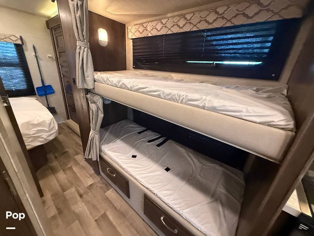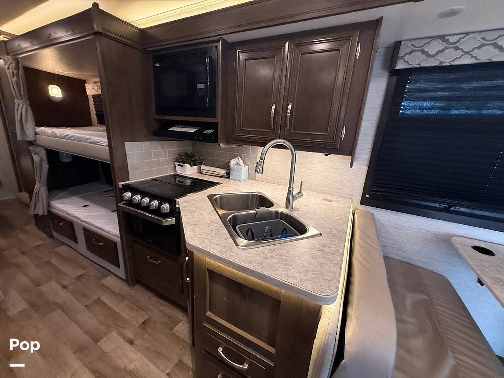 This bunk model features the popular in-wall bunks to really maximize your sleeping options. When combined with the sleeper dinette and overcab bunk, the sleeping capacity is rated at eight people.