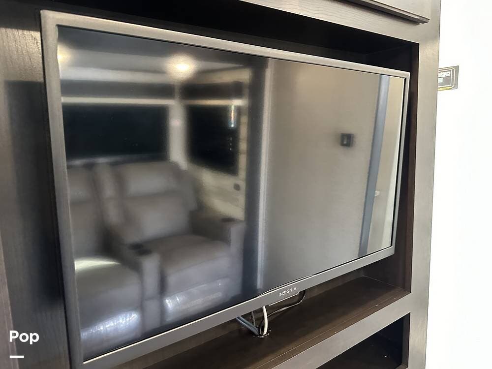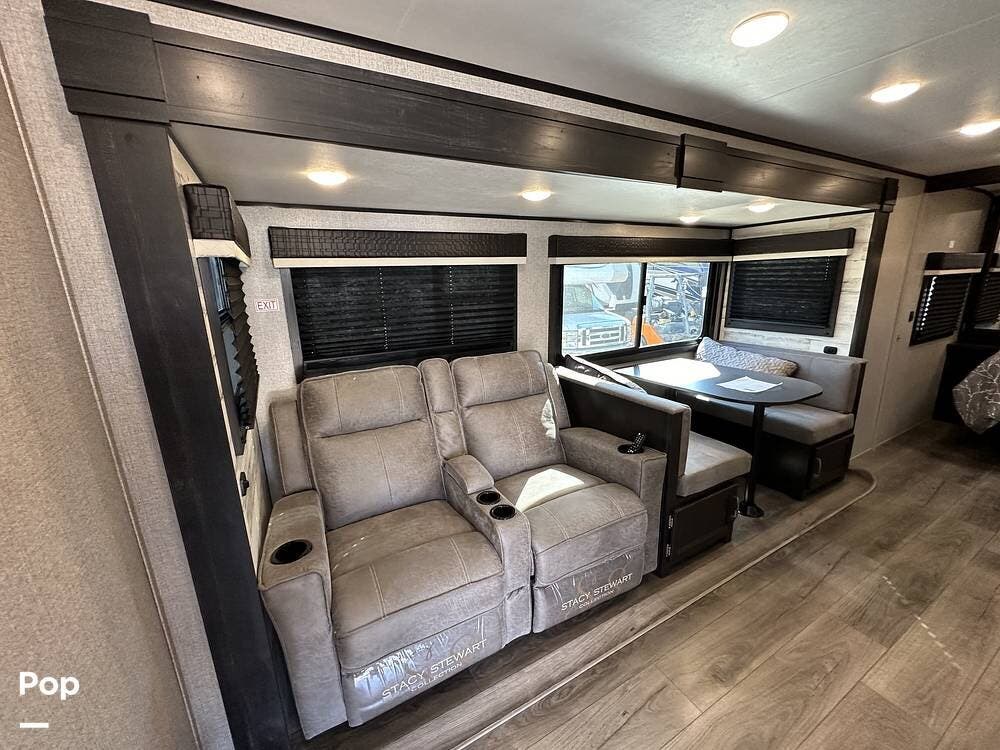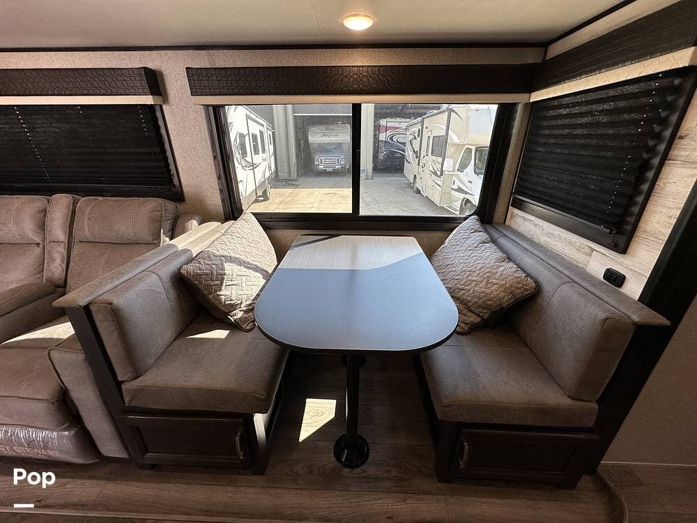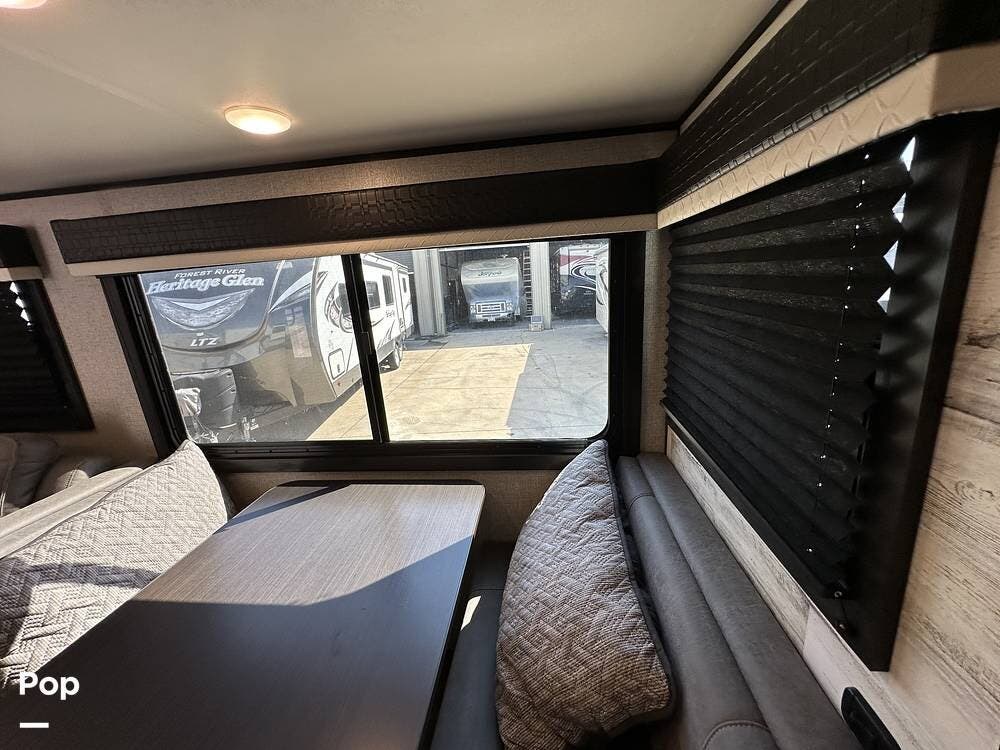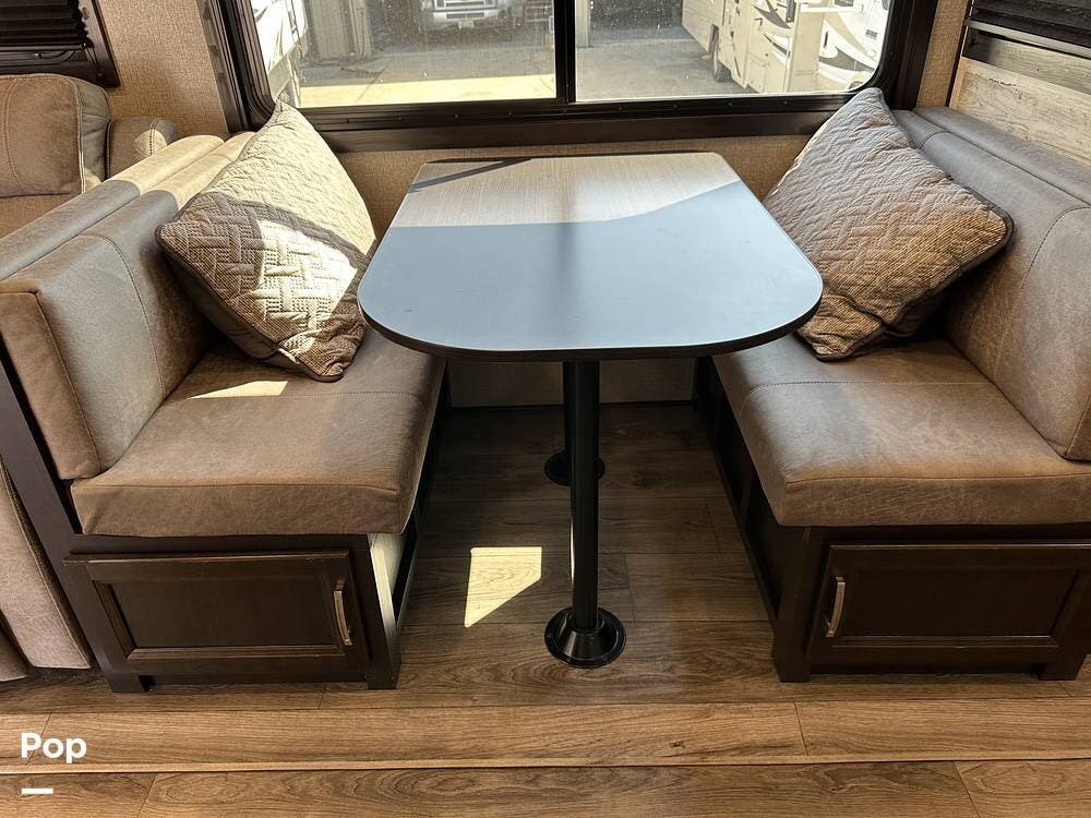 The living area has a booth dinette within the slide-out, providing comfortable, relaxing places. A large TV and plenty of storage throughout.