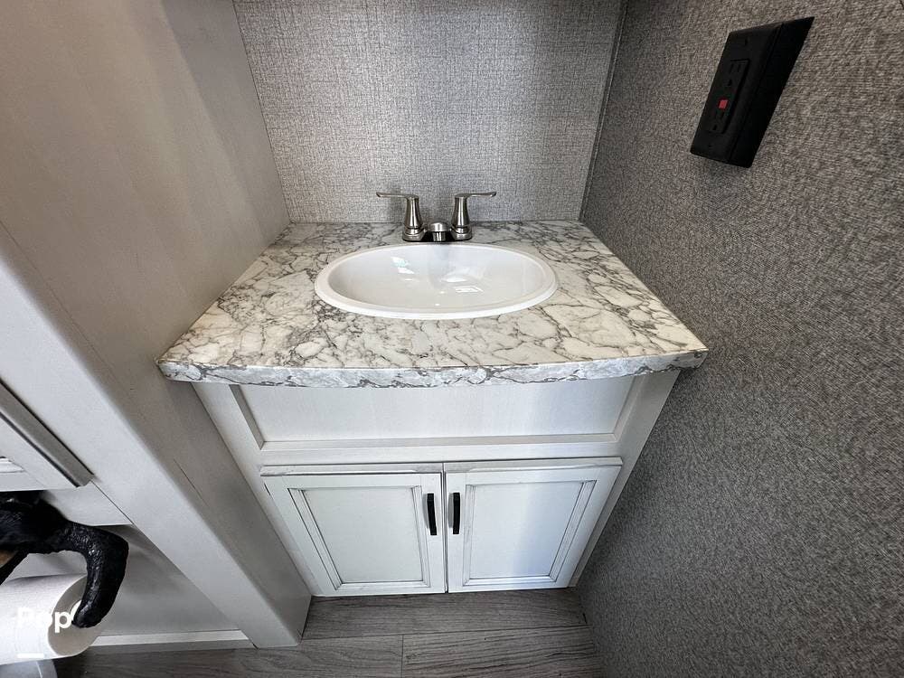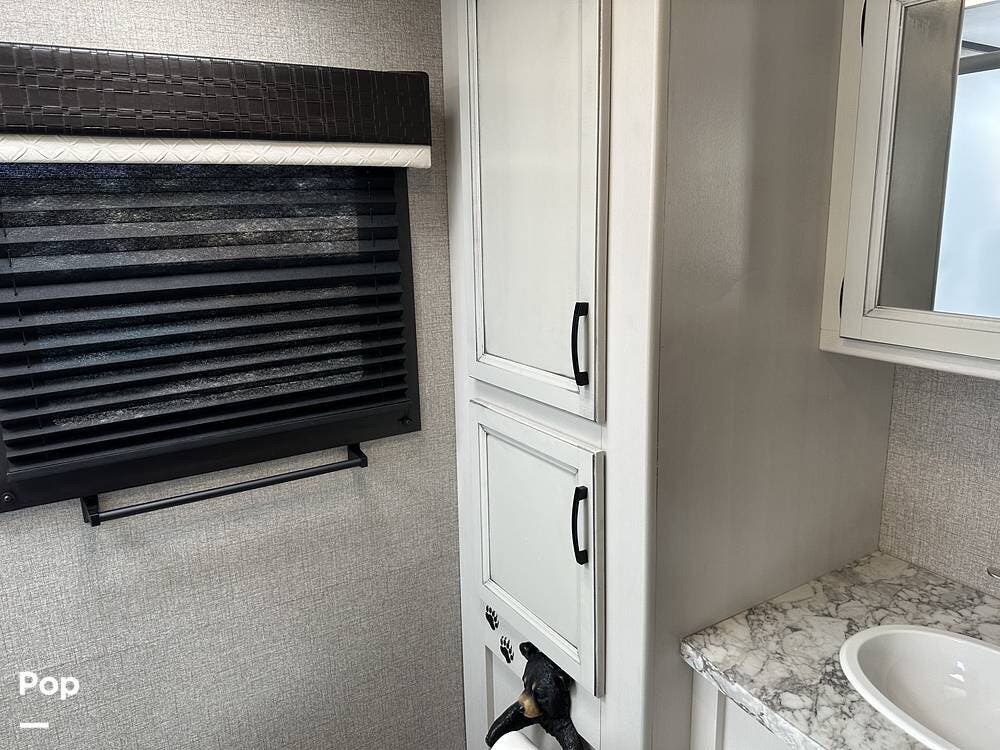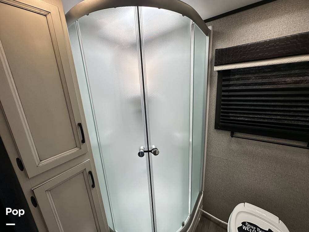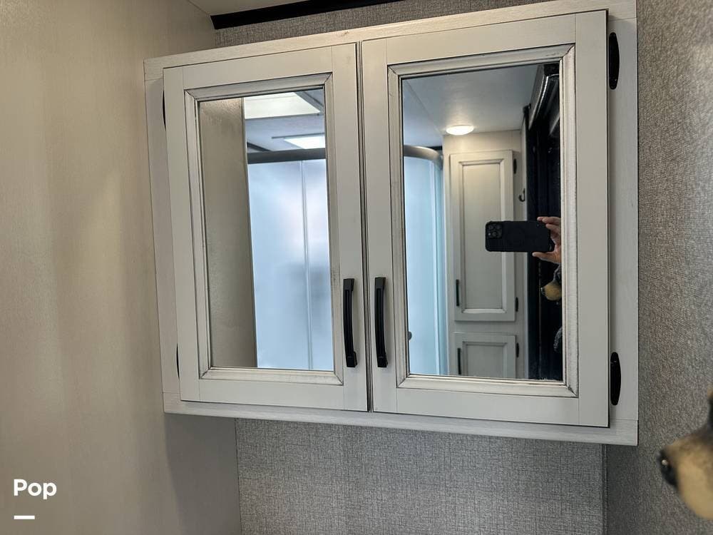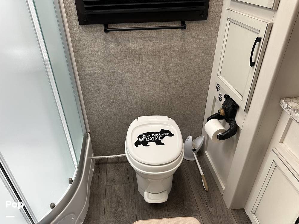 With two linen closets, a corner shower, and a nice vanity with a mirrored medicine cabinet for additional storage, this is not the typical camper bathroom.