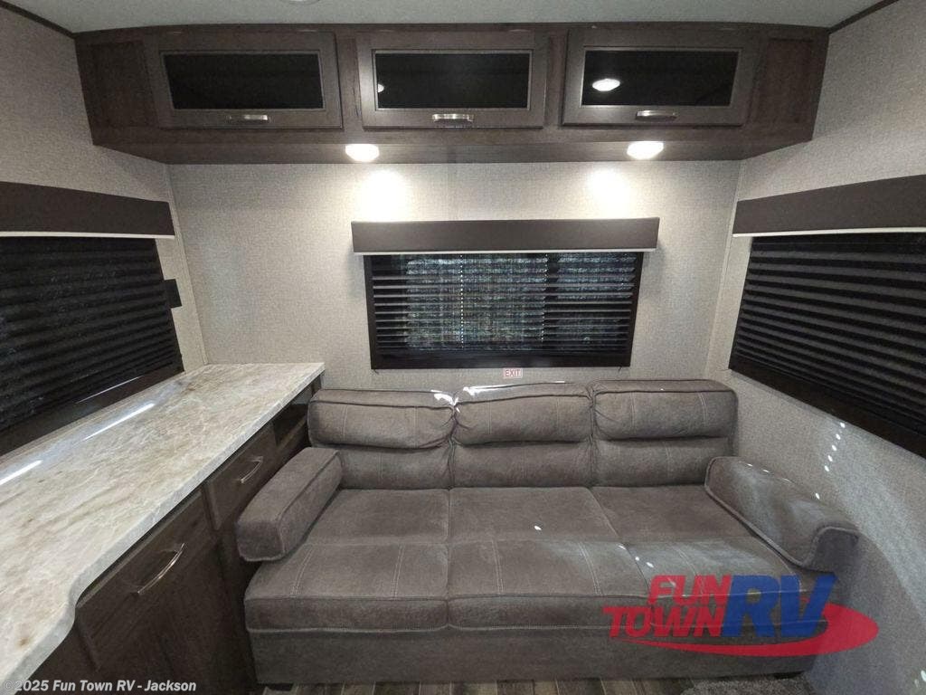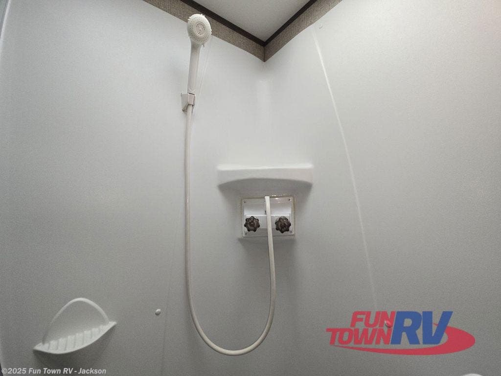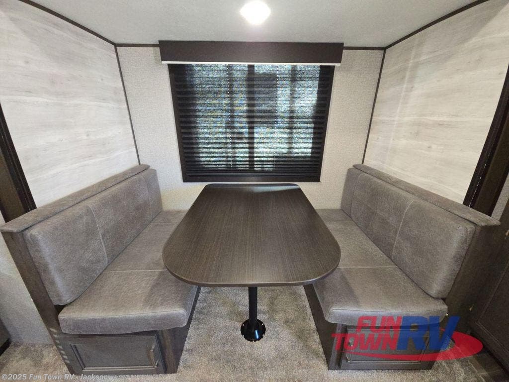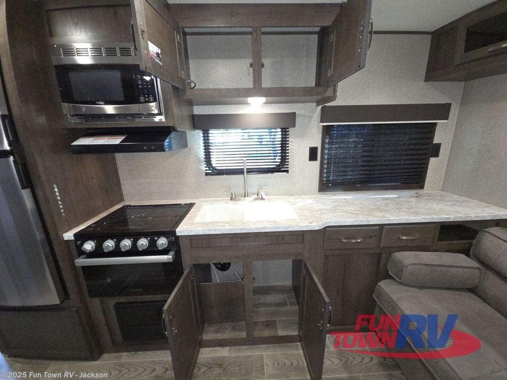Come see just how fun and easy camping can be in this travel trailer! There is a front private bedroom with a queen bed that has wardrobes on either side of it and an entrance into the dual entry bathroom. The rear living area has a large sofa and is right next to the ample counter space with the double sink and three burner range with glass top to create your best home cooked meals. The booth dinette slide helps to open up the living area for more walking around space. The exterior has many convenient features like the outside shower and the pass-through storage area, plus you can choose to add the optional Chil N' Stor feature to enjoy a cold drink without having to run inside for one!