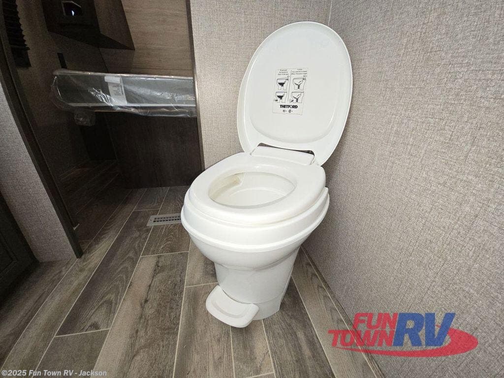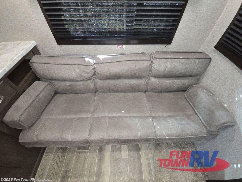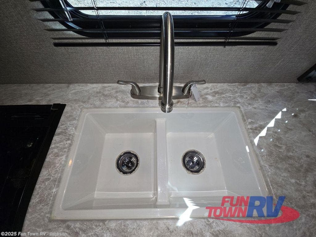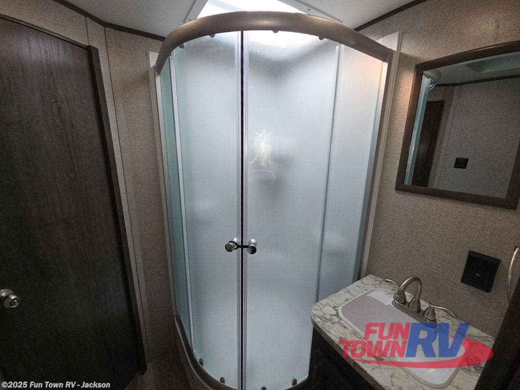 Come see just how fun and easy camping can be in this travel trailer! There is a front private bedroom with a queen bed that has wardrobes on either side of it and an entrance into the dual entry bathroom. The rear living area has a large sofa and is right next to the ample counter space with the double sink and three burner range with glass top to create your best home cooked meals. The booth dinette slide helps to open up the living area for more walking around space. The exterior has many convenient features like the outside shower and the pass-through storage area, plus you can choose to add the optional Chil N' Stor feature to enjoy a cold drink without having to run inside for one!