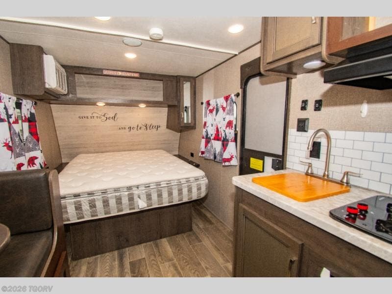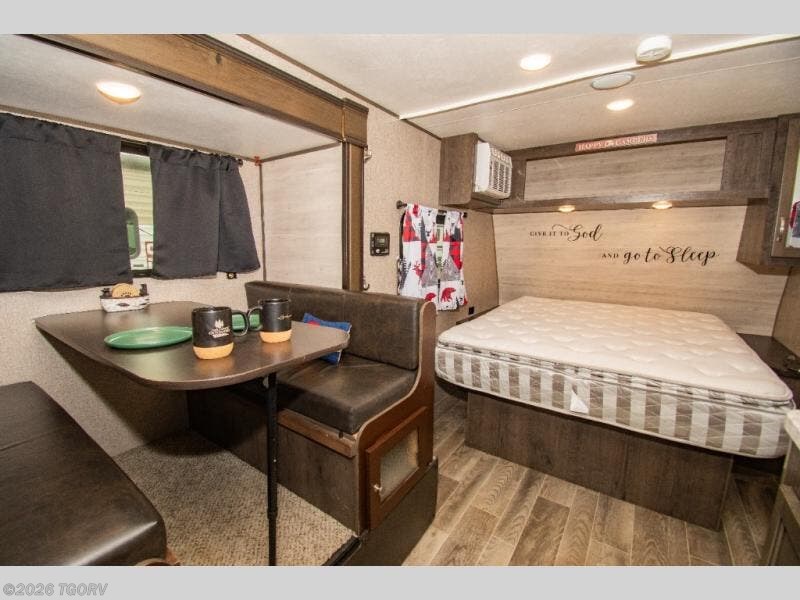 Load up and head out to your favorite local park in this Jay Flight SLX 7 travel trailer. The chef of the family will have more space to cook a meal thanks to the slide out, and the full rear bath will add privacy if someone needs it. You and your spouse will feel right at home on the front RV queen bed that includes a privacy curtain, and an overnight guest or two children can sleep on the booth dinette. This model also includes outside storage for your tool box and yard games plus a 10' power awning with LED lights so that you can play a game of cards in the evening at the picnic table!