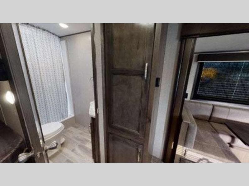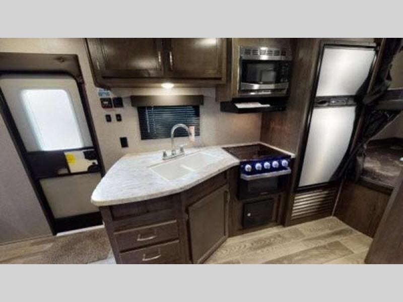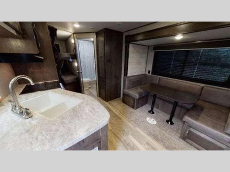 This Jayco bunkhouse travel trailer is designed with families in mind. The rear double bunk beds provide a cozy sleeping area for kids, while the front private bedroom with a queen bed gives parents their own space. The convertible U-shaped dinette offers additional sleeping, making it easy to bring friends along.