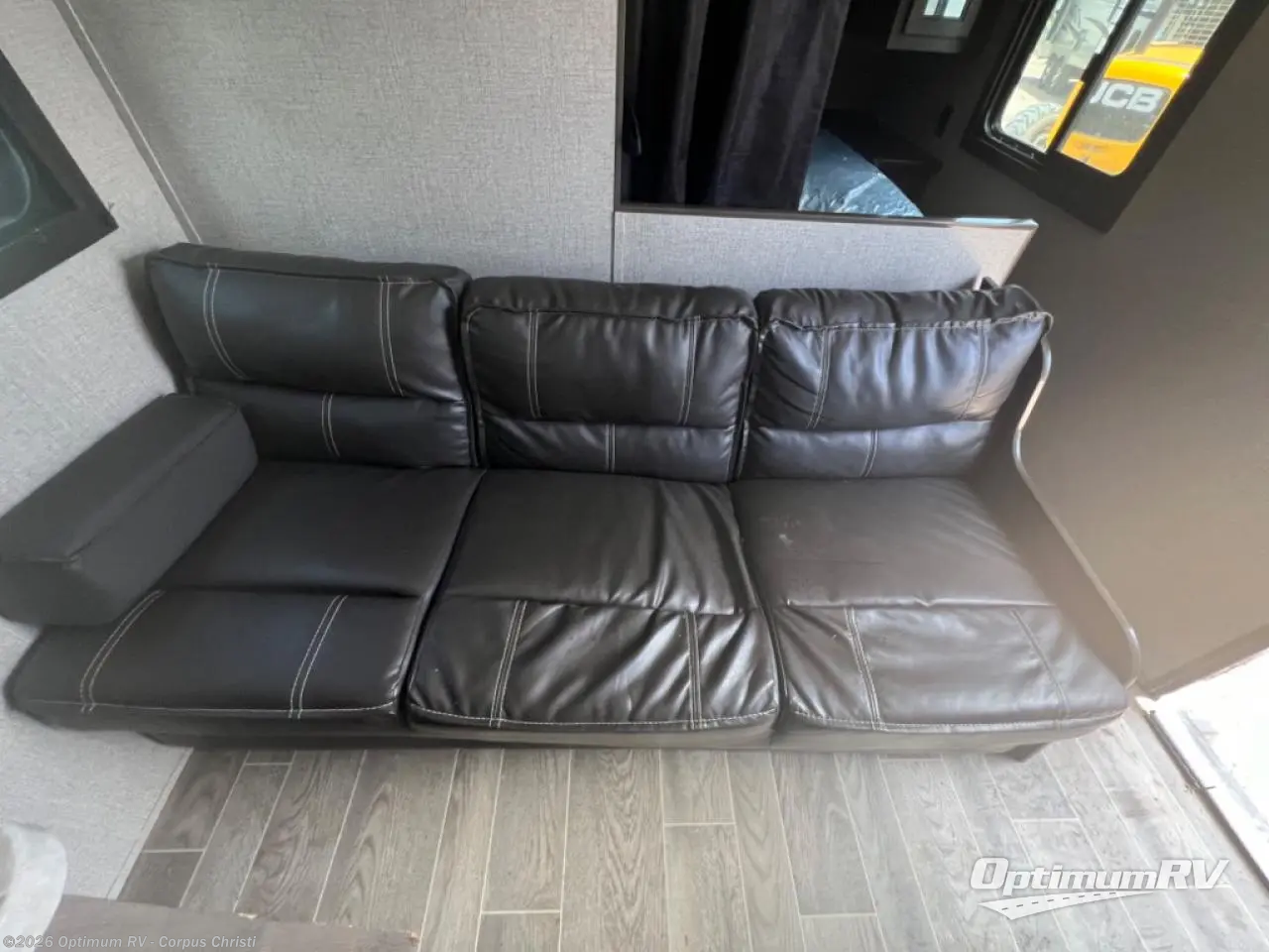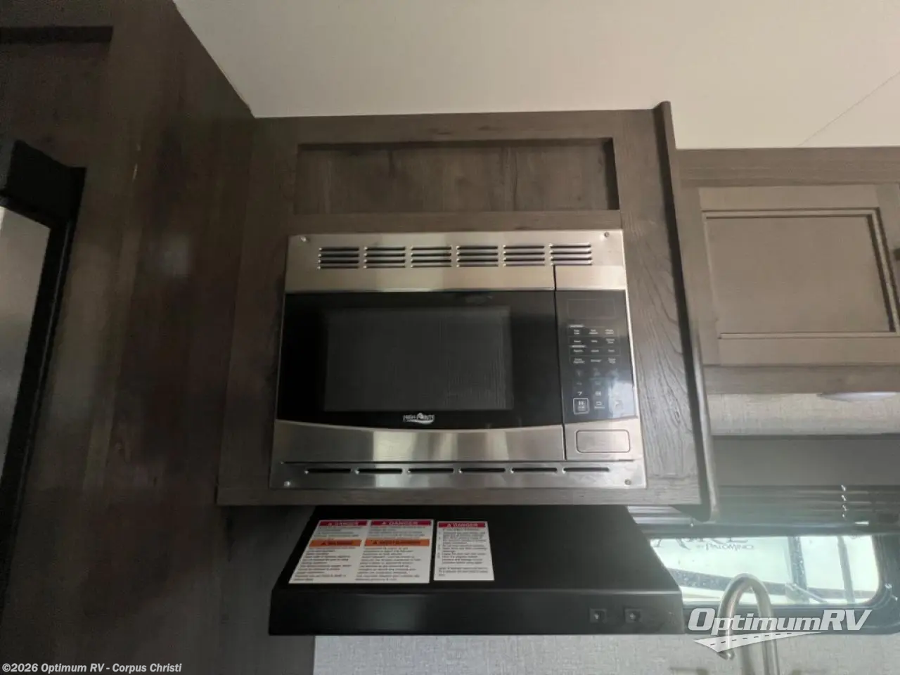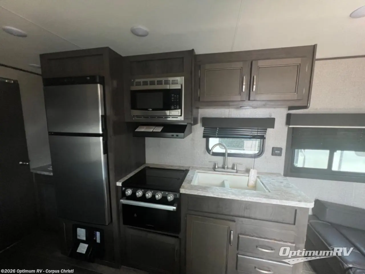 The whole family can head to the campground with this travel trailer! Everyone will start each day feeling re-charged and ready to go after sleeping on the rear corner double bunk beds and the front queen bed, plus the sofa and the booth dinette can also transform into extra sleeping spaces for any friends that want to tag along. The rear corner bathroom comes with a tub/shower that has a skylight above for natural lighting and a wood trimmed mirror to make you feel more at home. There is plenty of storage inside and out between the overhead cabinets, the wardrobes, and the exterior pass-through storage area. You can also add the optional Chil N' Stor feature to the exterior so that you can enjoy a nice, cold beverage without having to go inside to get one!