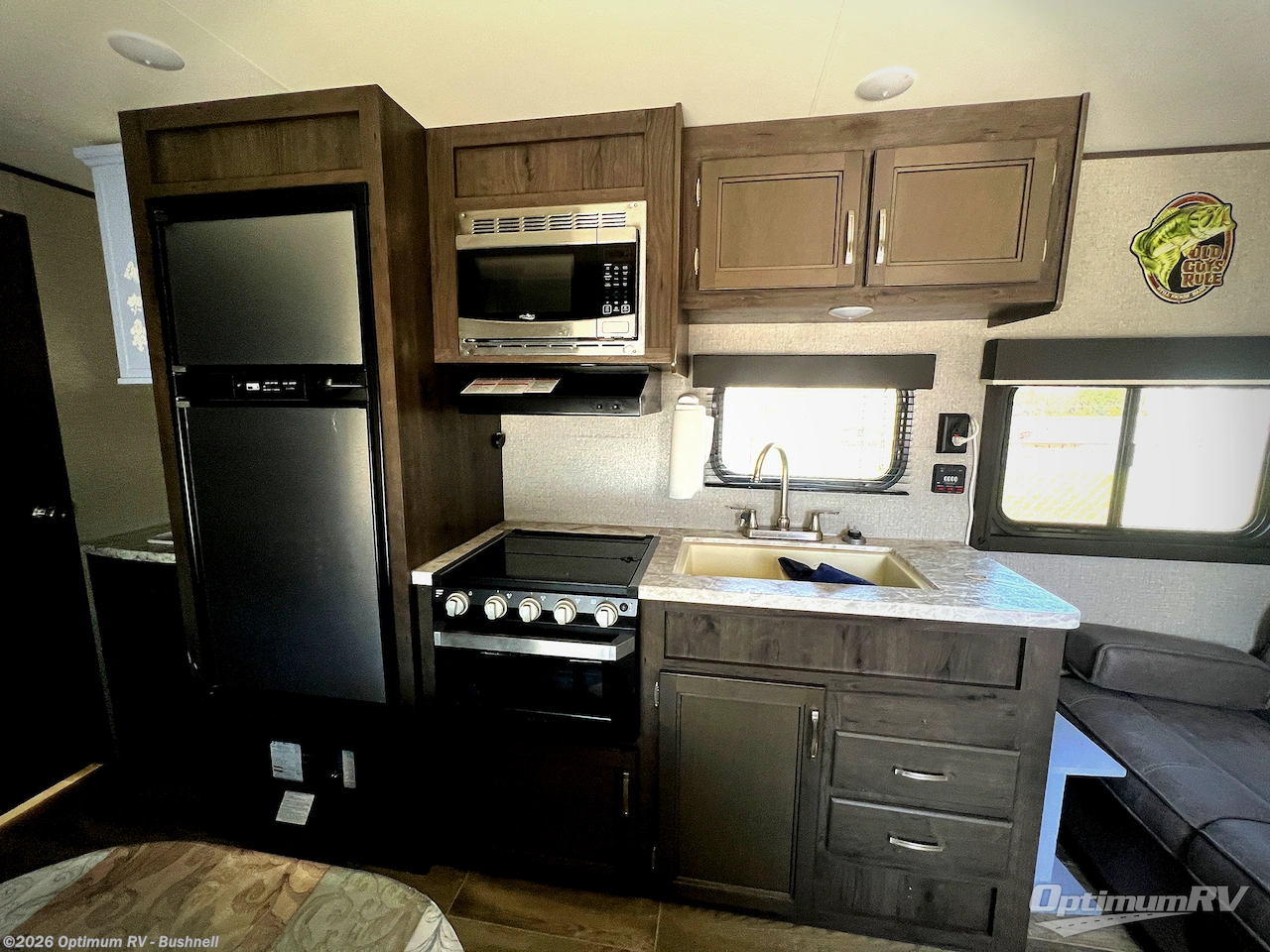 The whole family can head to the campground with this travel trailer! Everyone will start each day feeling re-charged and ready to go after sleeping on the rear corner double bunk beds and the front queen bed, plus the sofa and the booth dinette can also transform into extra sleeping spaces for any friends that want to tag along. The rear corner bathroom comes with a tub/shower that has a skylight above for natural lighting and a wood trimmed mirror to make you feel more at home. There is plenty of storage inside and out between the overhead cabinets, the wardrobes, and the exterior pass-through storage area. You can also add the optional Chil N' Stor feature to the exterior so that you can enjoy a nice, cold beverage without having to go inside to get one!