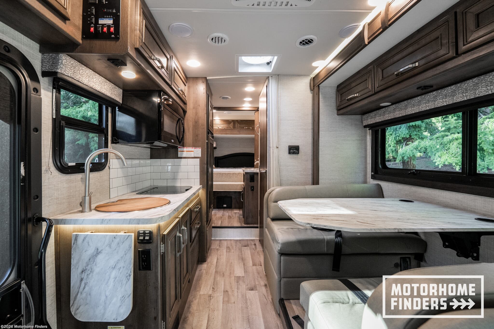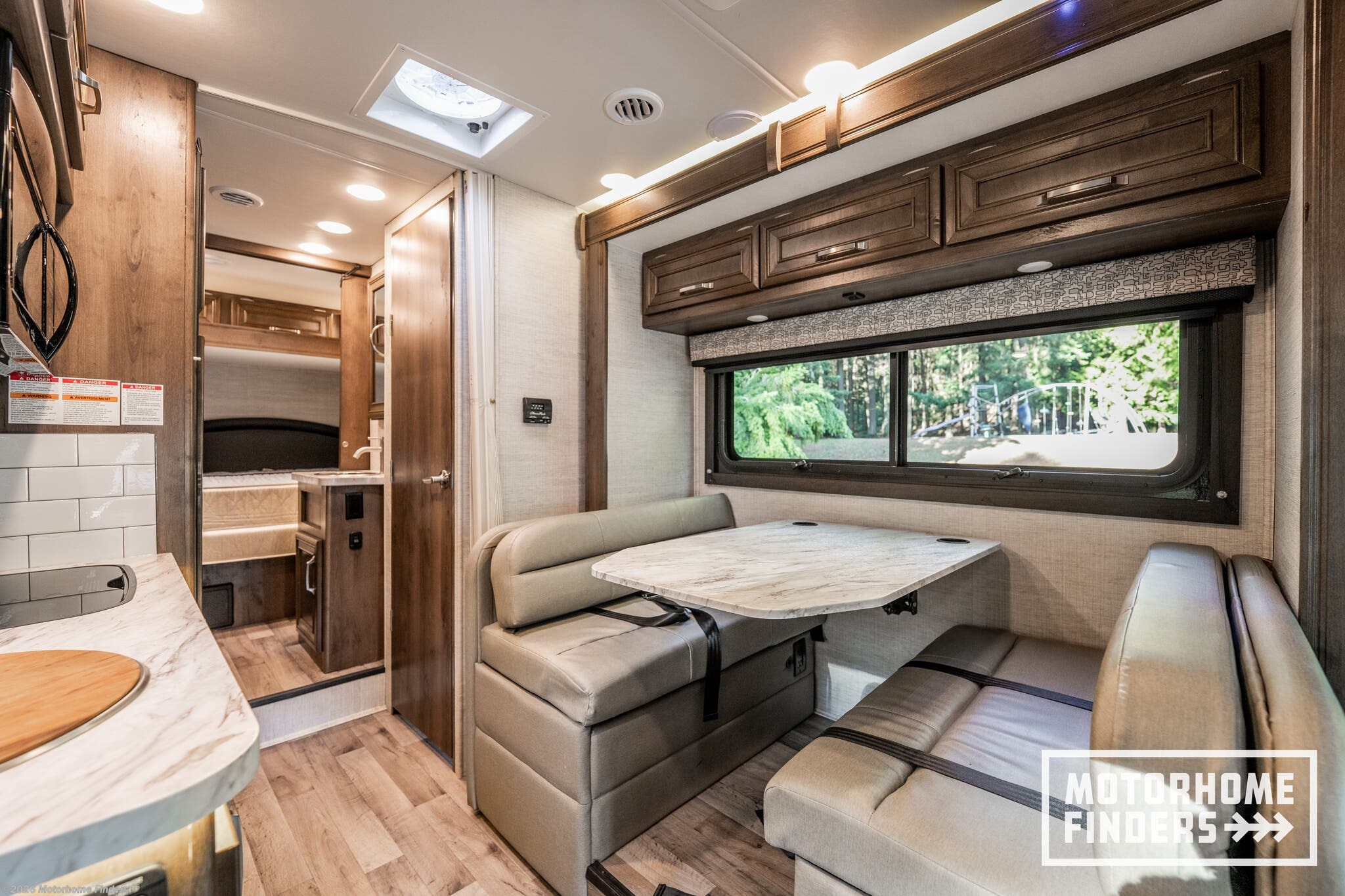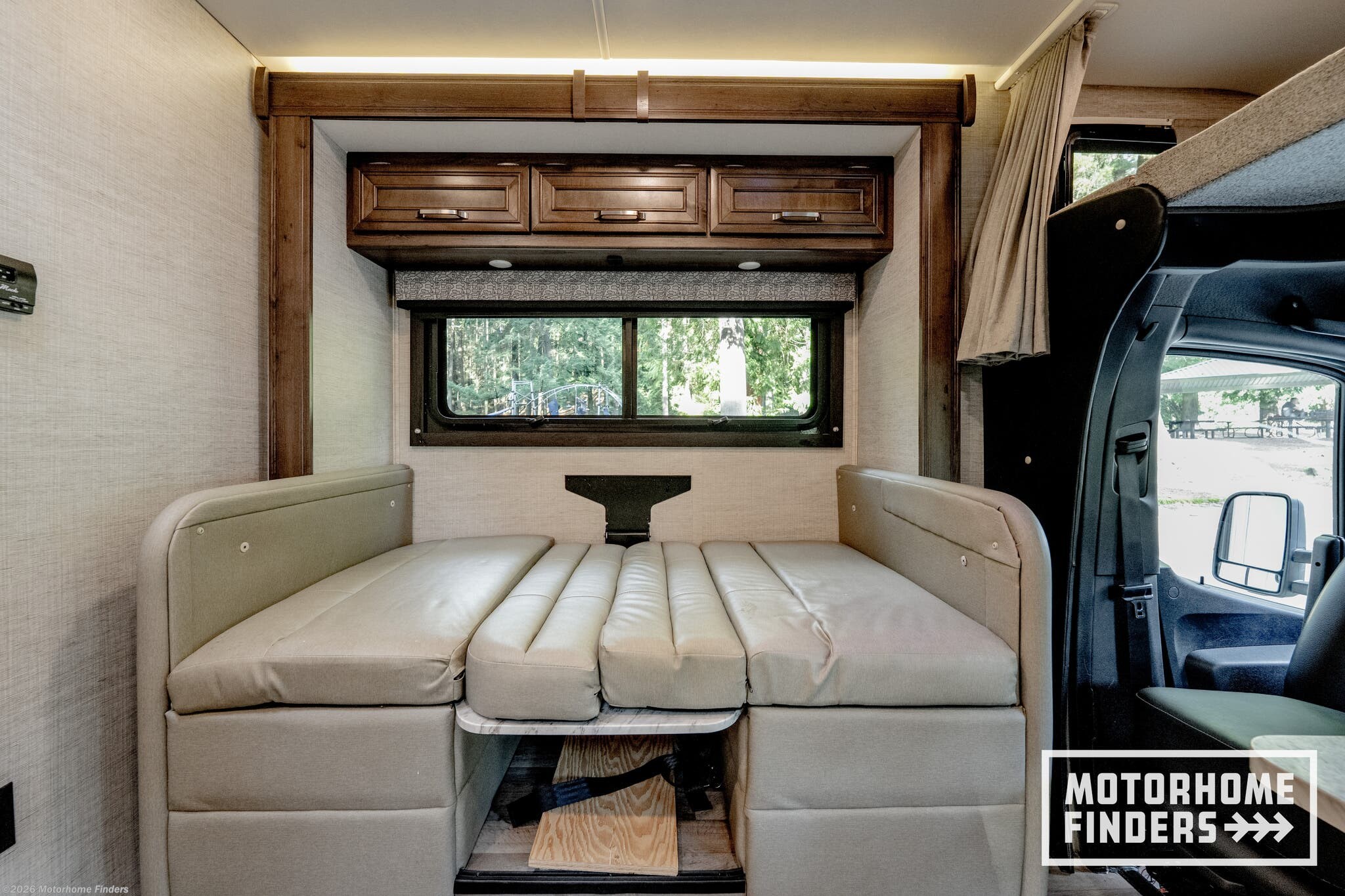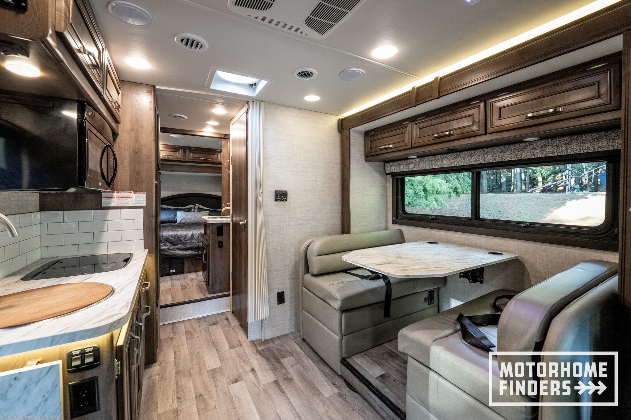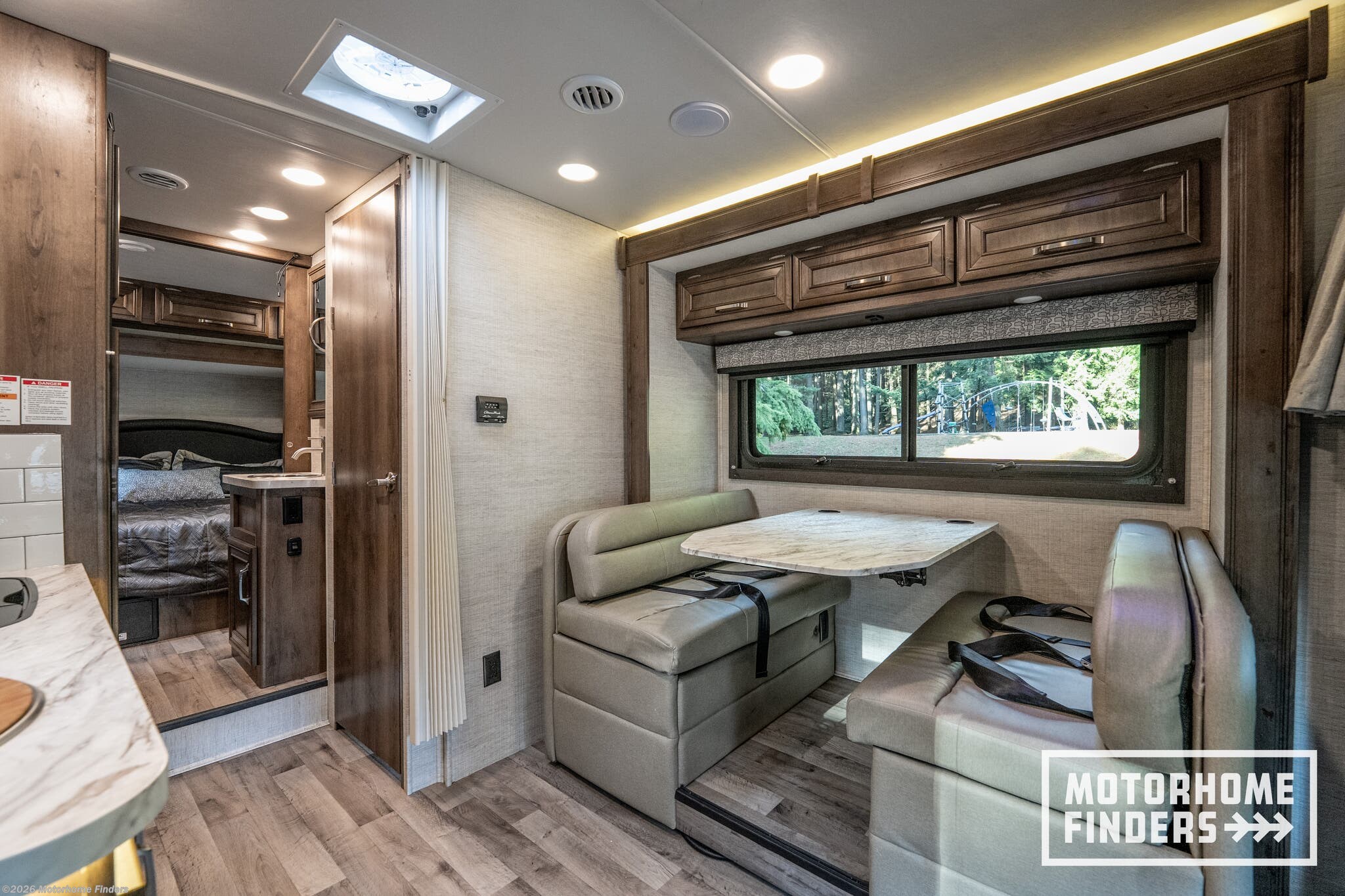 Legless dinette table – Easy access and flexible seating without floor obstructions, converts to sleeping area for added convenience