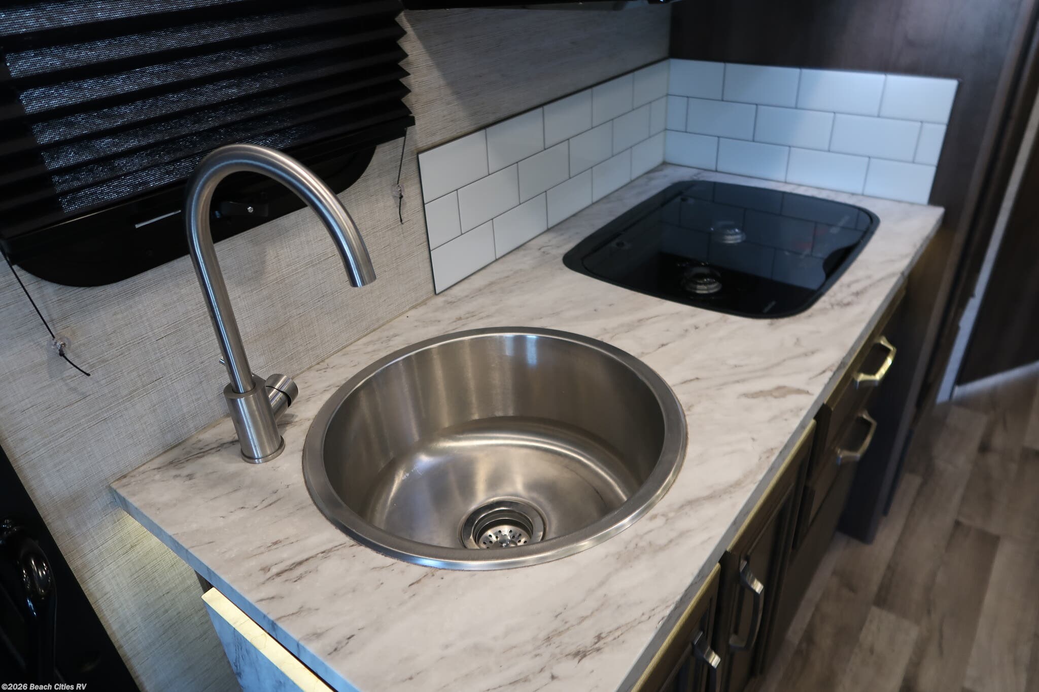 The Rv has the very desired 24L floorplan. At only 25'2" in length, it features a full wall slide out with and dinette that converts into a bed, a rear queen bed, OH bunk, full kitchen with sink, microwave, stovetop and large refrigerator.