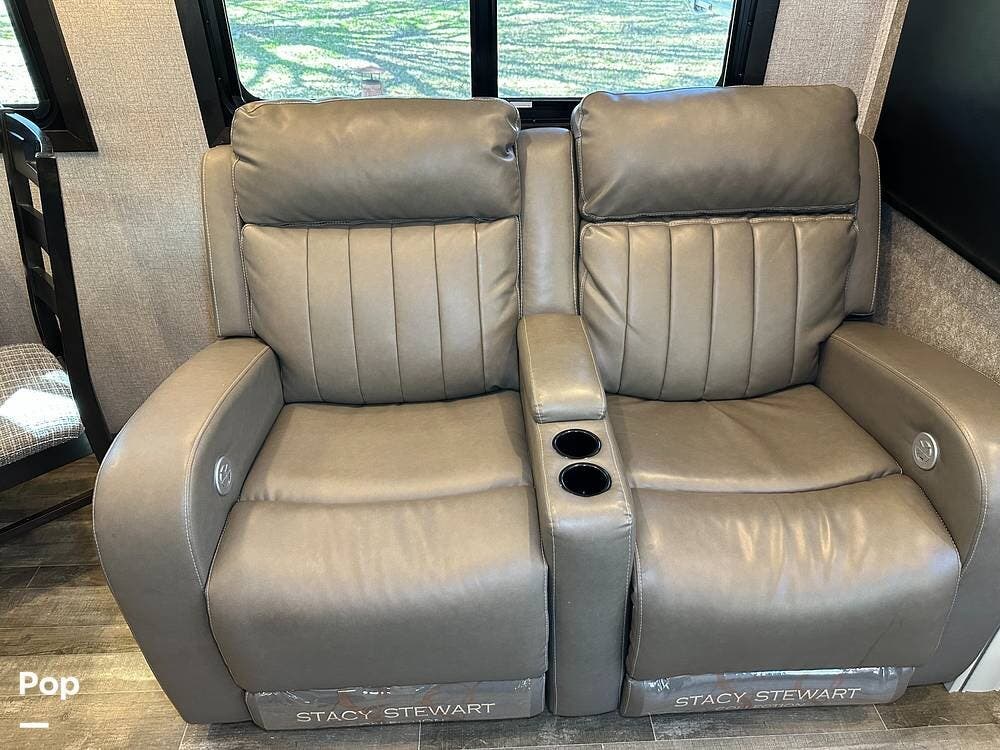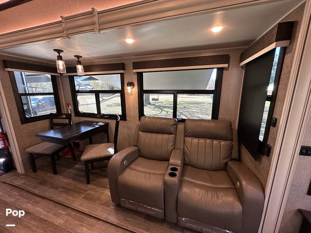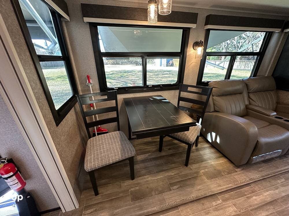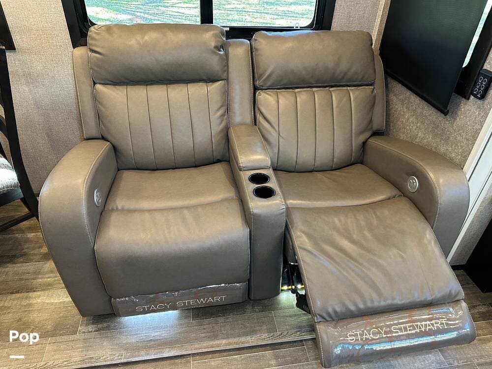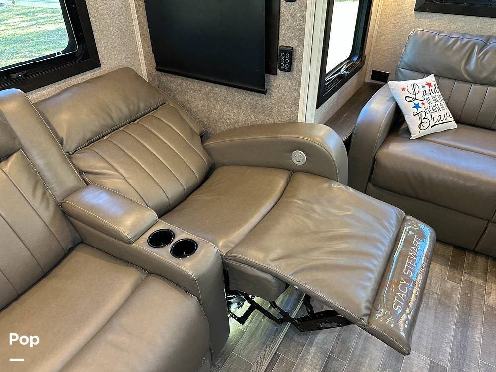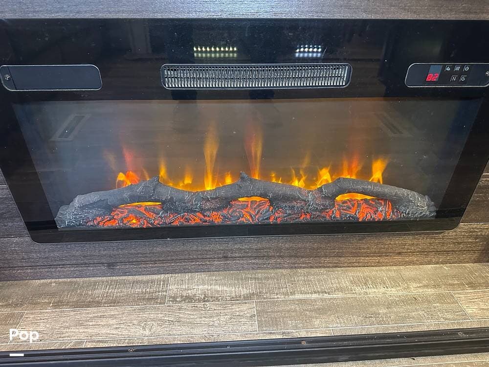 Relaxation is primo in this unit. You can relax in the heated massage recliners while streaming on your smart TV. Sleeps up to 4 people. She has a trifold foldaway bed, theater seating, a table and four chairs, and an entertainment center with a fireplace in the living area.