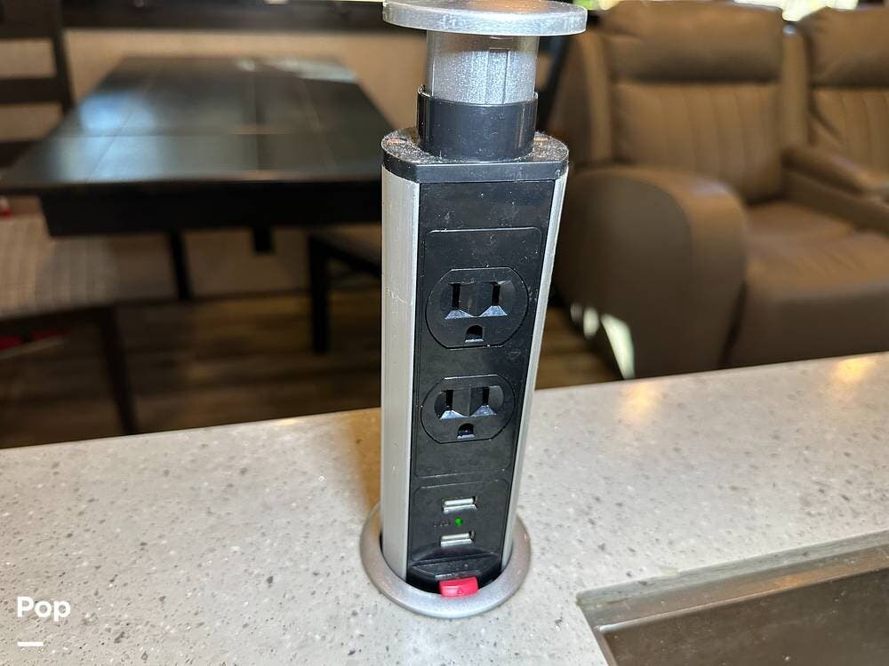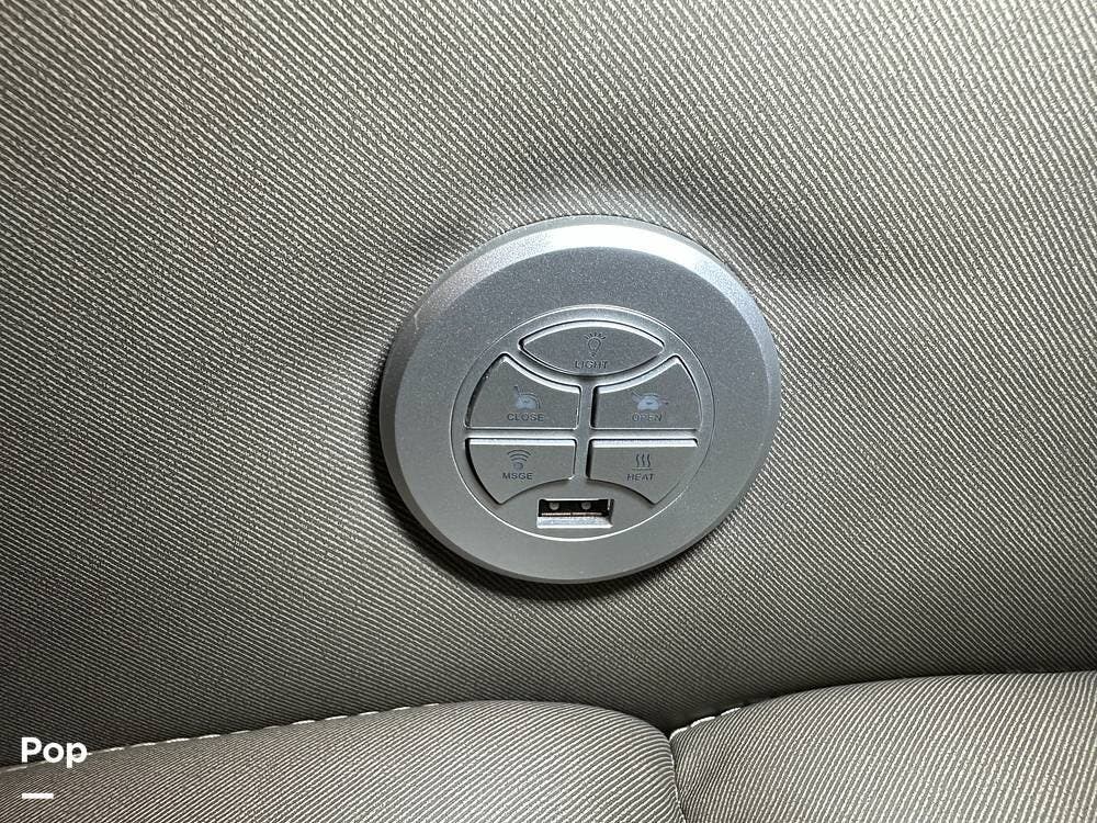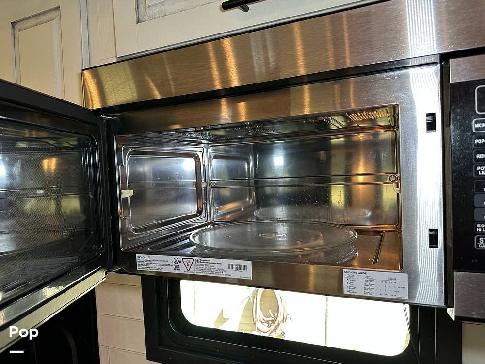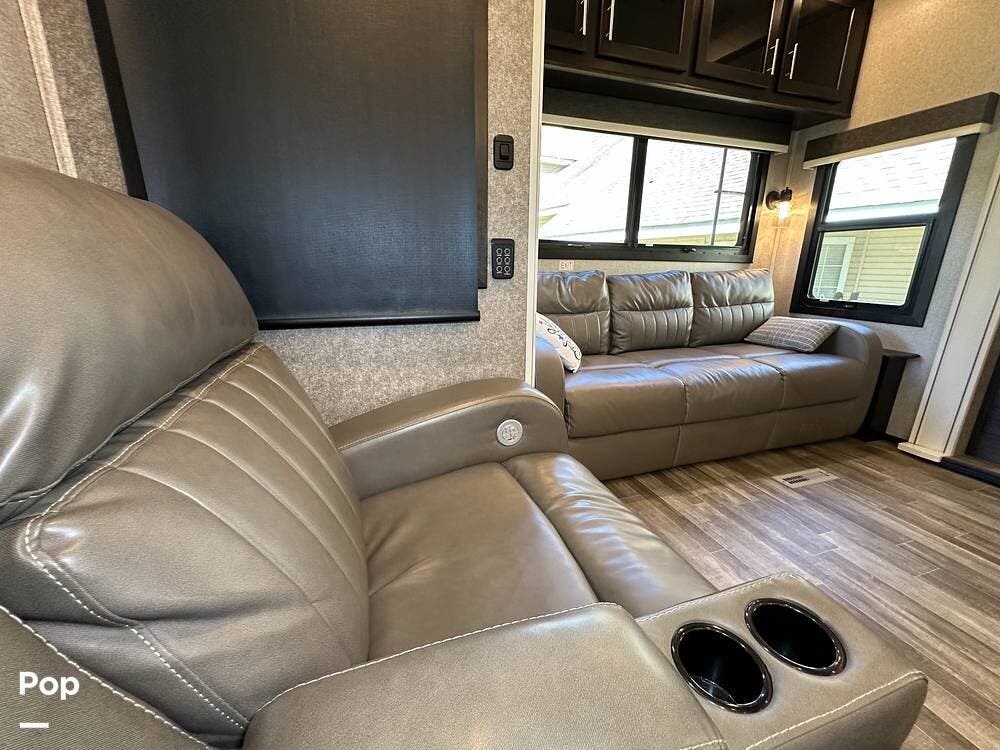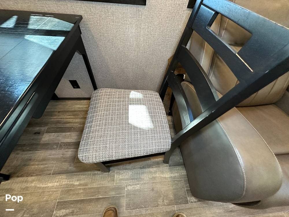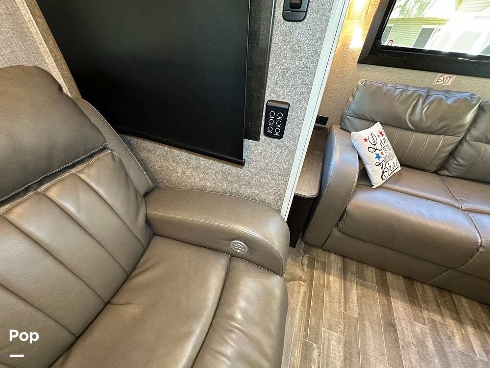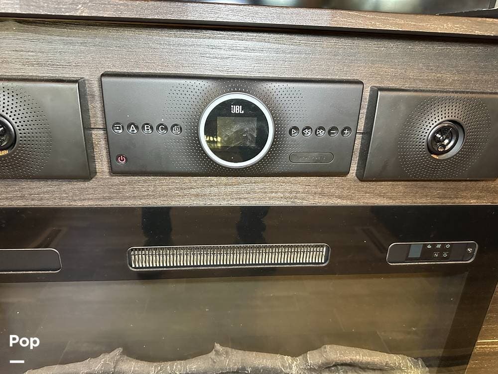 Relaxation is primo in this unit. You can relax in the heated massage recliners while streaming on your smart TV. Sleeps up to 4 people. She has a trifold foldaway bed, theater seating, a table and four chairs, and an entertainment center with a fireplace in the living area.