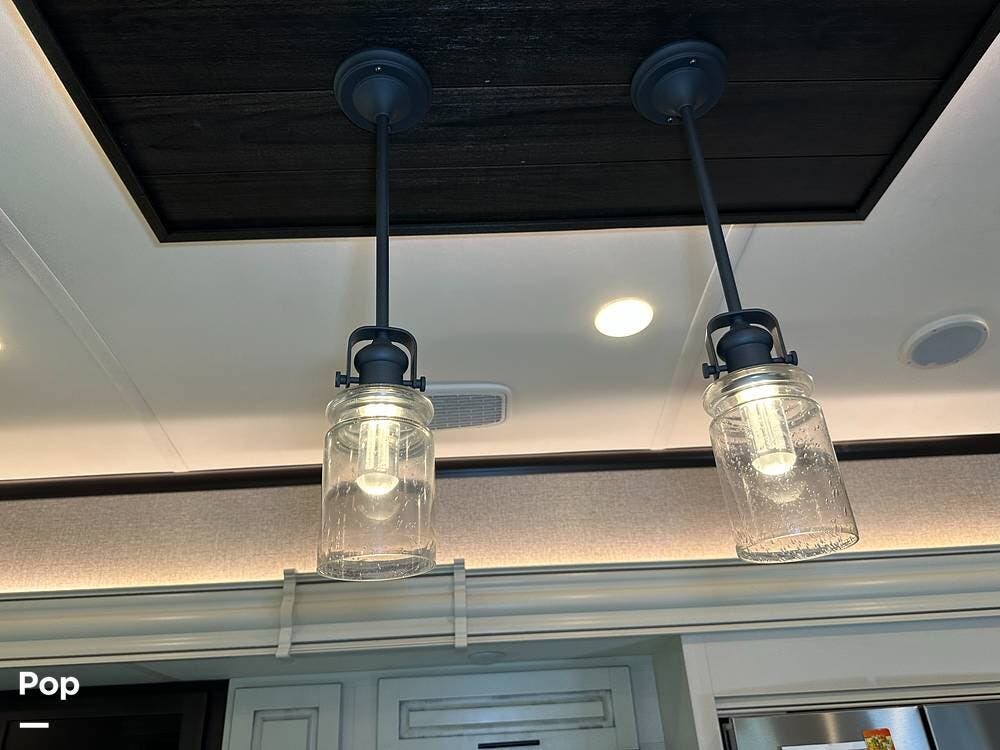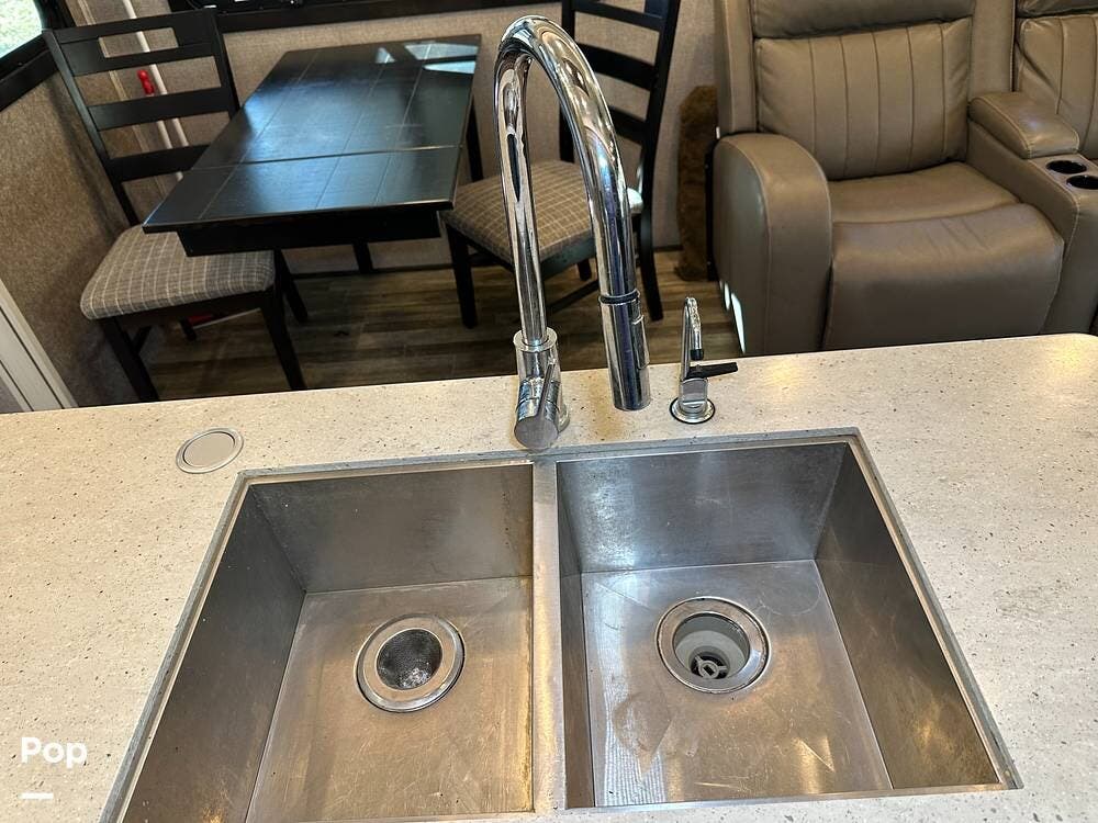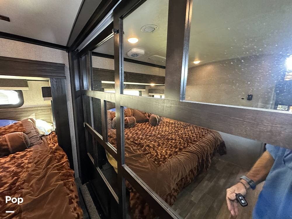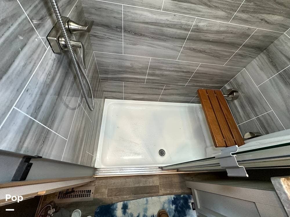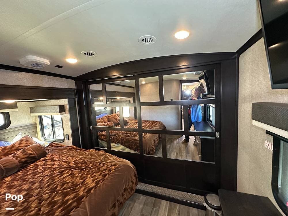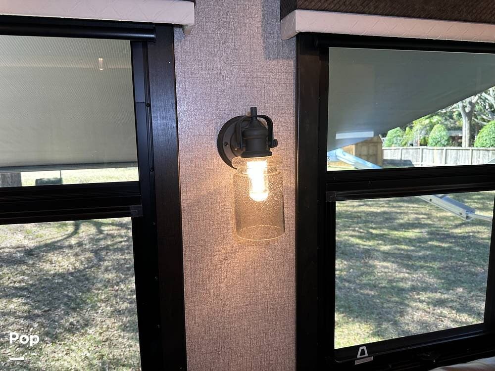 Relaxation is primo in this unit. You can relax in the heated massage recliners while streaming on your smart TV. Sleeps up to 4 people. She has a trifold foldaway bed, theater seating, a table and four chairs, and an entertainment center with a fireplace in the living area.