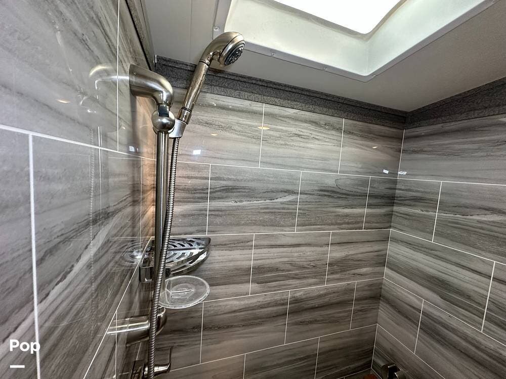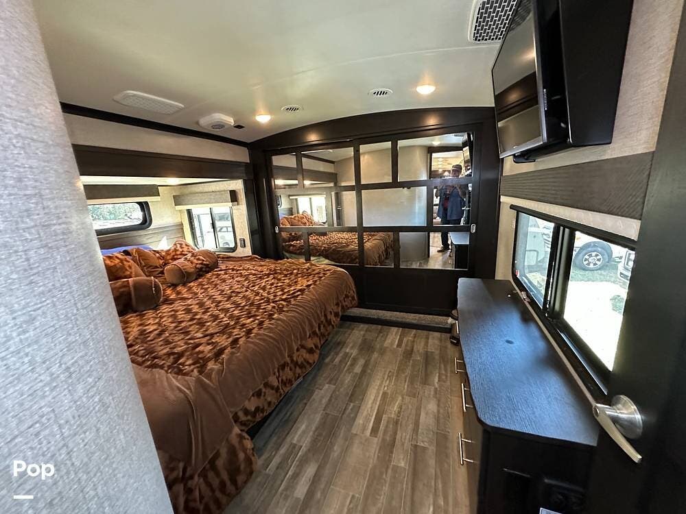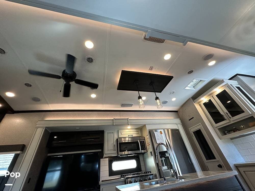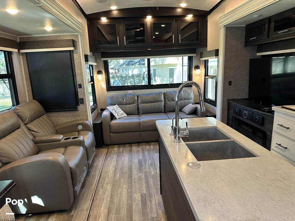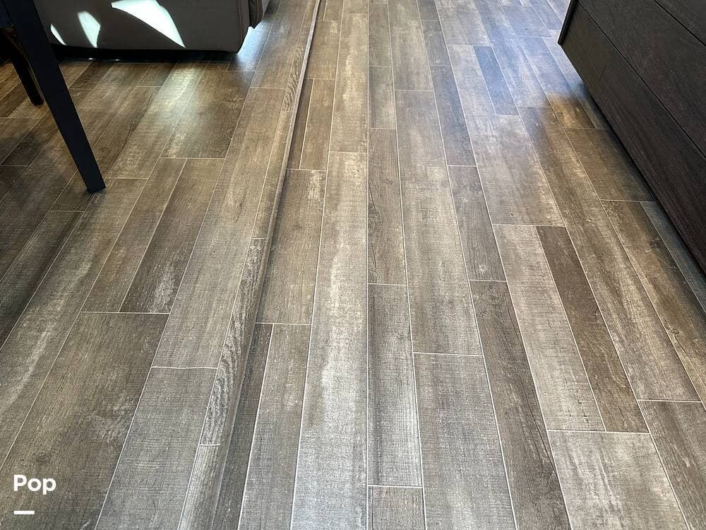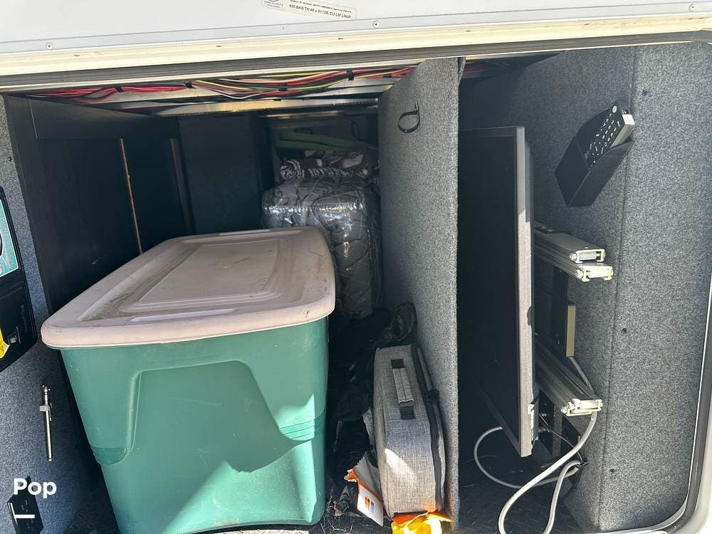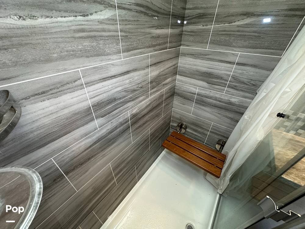 Relaxation is primo in this unit. You can relax in the heated massage recliners while streaming on your smart TV. Sleeps up to 4 people. She has a trifold foldaway bed, theater seating, a table and four chairs, and an entertainment center with a fireplace in the living area.