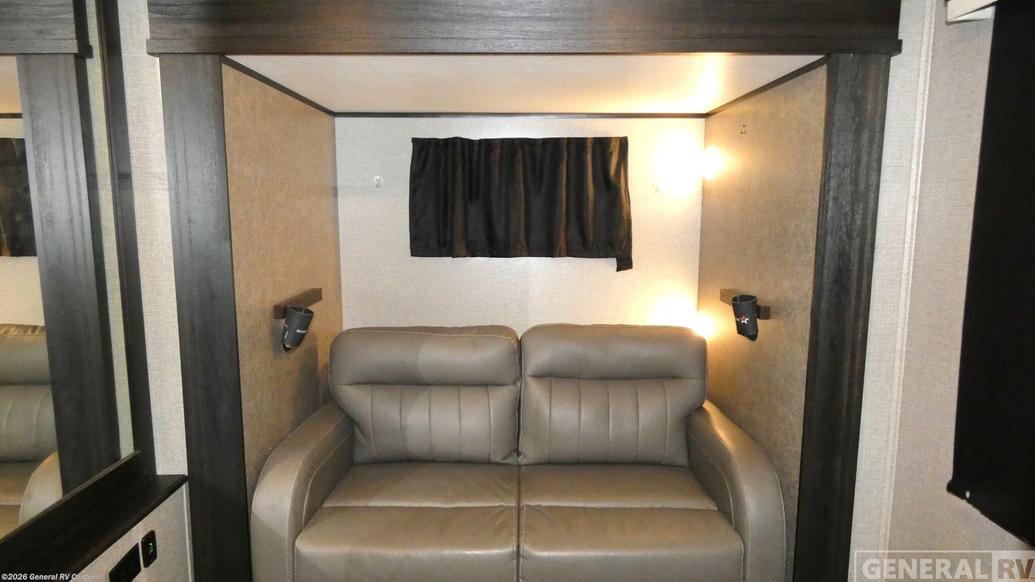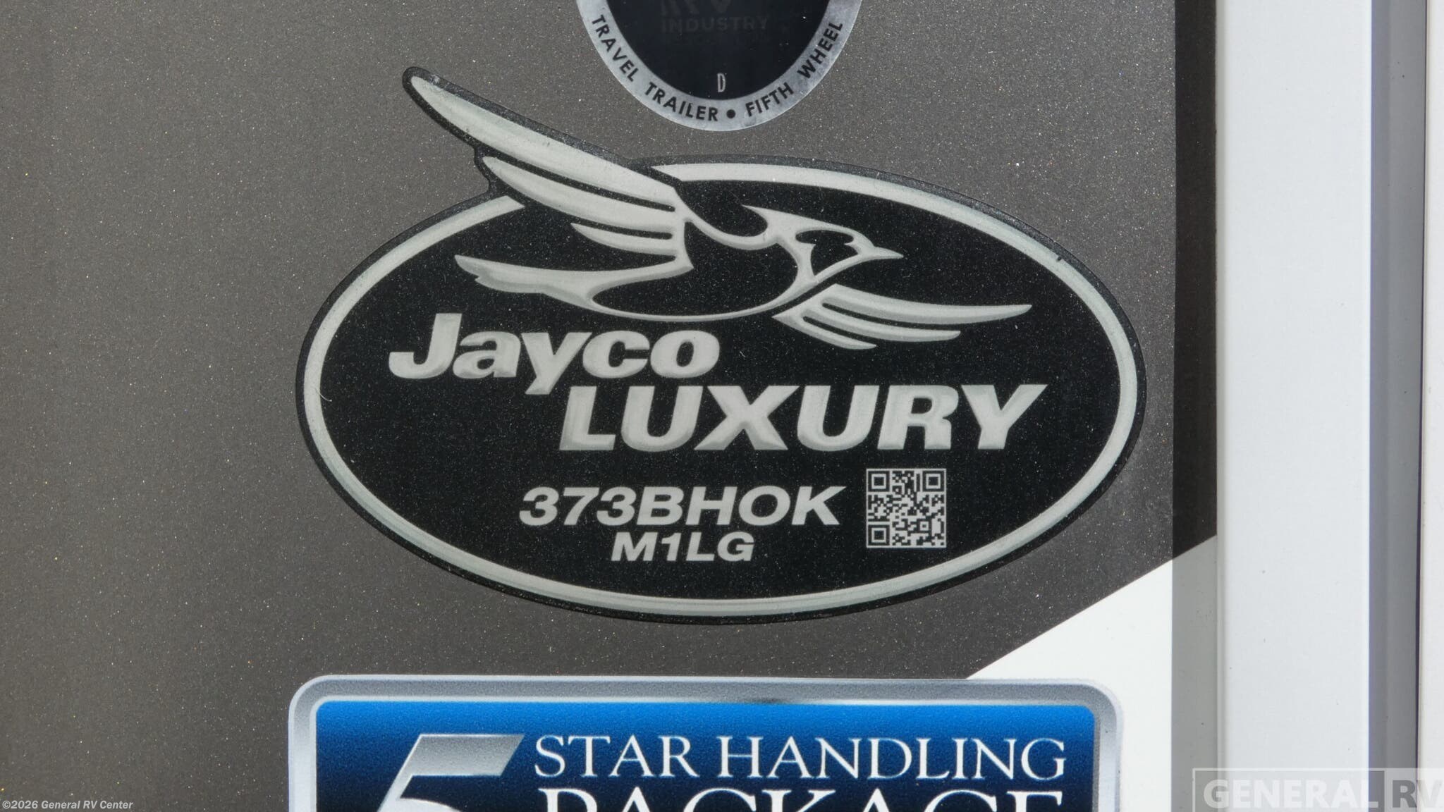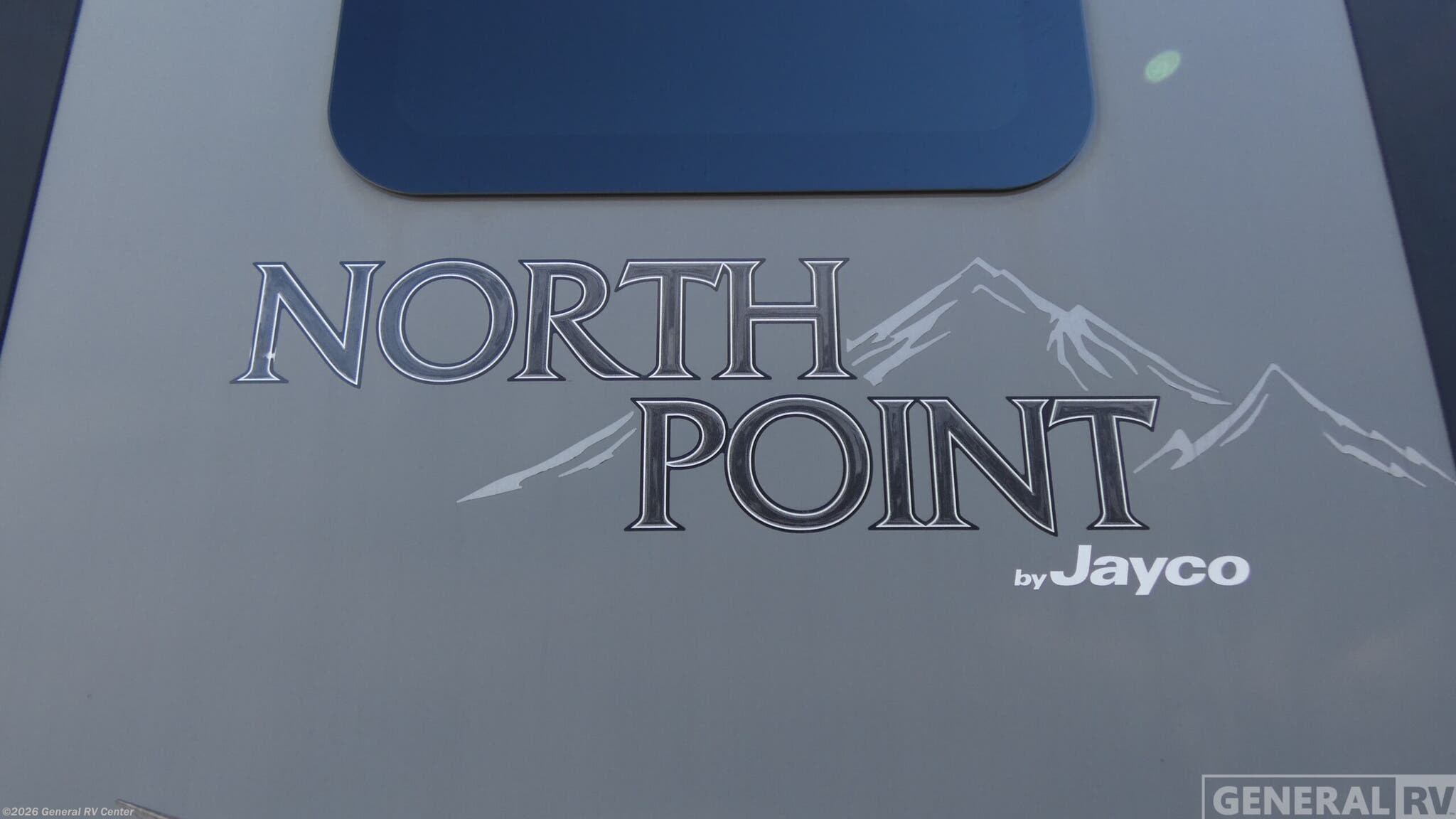 Jayco North Point fifth wheel 373BHOK highlights: Bonus Room Overhead Loft Loft Stairs/Ladder Kitchen Island Full and Half Bath Outside Kitchen Experience a "hybrid unit" couples coach with this bath and a half fifth wheel! The rear bonus room can be utilized as a bunkhouse with it's tri-fold sofa and removable table, all of which is in a slide out. The oversized loft/storage area above offers the industry's first loft stairs/ladder for easy access. The walk-through half bath is convenient for everyone on this side of the fifth wheel, and the full bathroom next to the front bedroom provides a shower with a seat for everyone to get cleaned up before bedtime. The queen bed, the walk-in closet with hamper and a prepped space for a washer/dryer, plus the flip-top dresser and 32" TV provide a nice oasis after a full day outdoors. The main area is spacious with dual slides and offers a free standing dinette and theater seats, full kitchen amenities, plus a kitchen island with dishwasher prep and a fireplace! These Jayco North Point fifth wheels offer sleeping spaces and luxurious features to accommodate all types and sizes of groups! You will have generations of family fun with construction features like the Stronghold VBL™ aluminum framed, vacuum bond laminated walls and a Magnum Truss™ XL6™ roof system with a one-piece, seamless DiFlex II material which is the strongest tested roof in the industry. There are three mandatory packages to make your traveling experience even better. One of the packages is a five star handling package which includes Dexter axles with Nev-R-Adjust brakes, Dexter heavy-duty shackles with wet bolt fasteners and bronze bushings to resist the wear and tear of towing, Goodyear beast tires, a MORryde rubberized suspension system, and a MORryde pin box so you can travel forward, backward, and side-to-side for a smoother tow. Come choose your favorite model today!