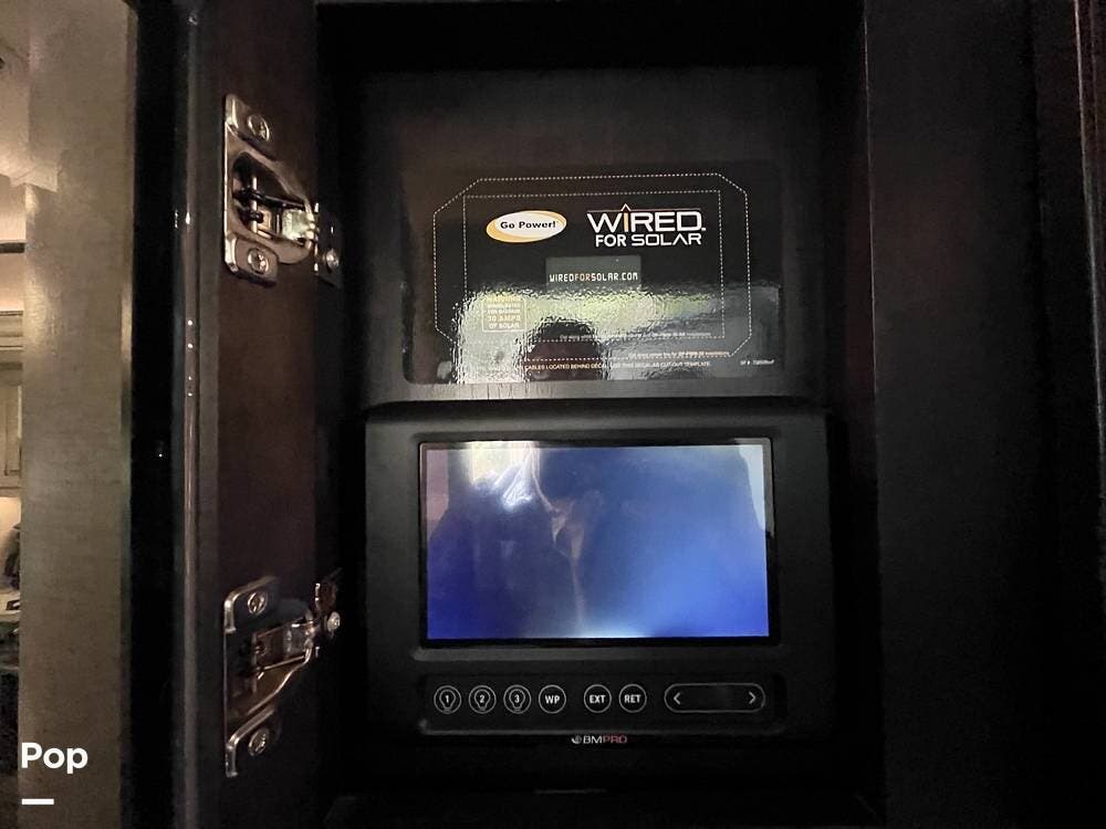 Luxury features include a Max Air ceiling vent with a rain sensor and auto-closing, a central vacuum system, four upgraded smart TVs, solar prep, 6-point leveling, and slide-out awnings.