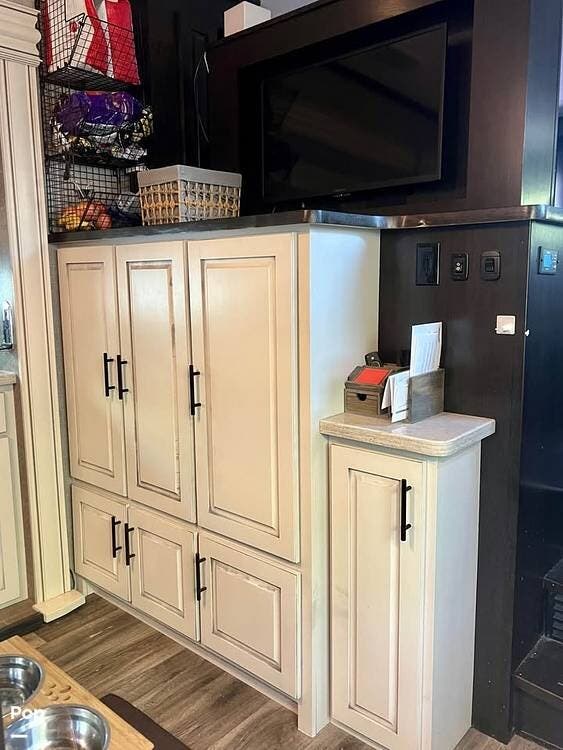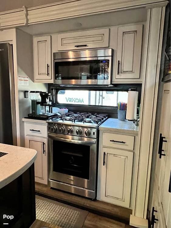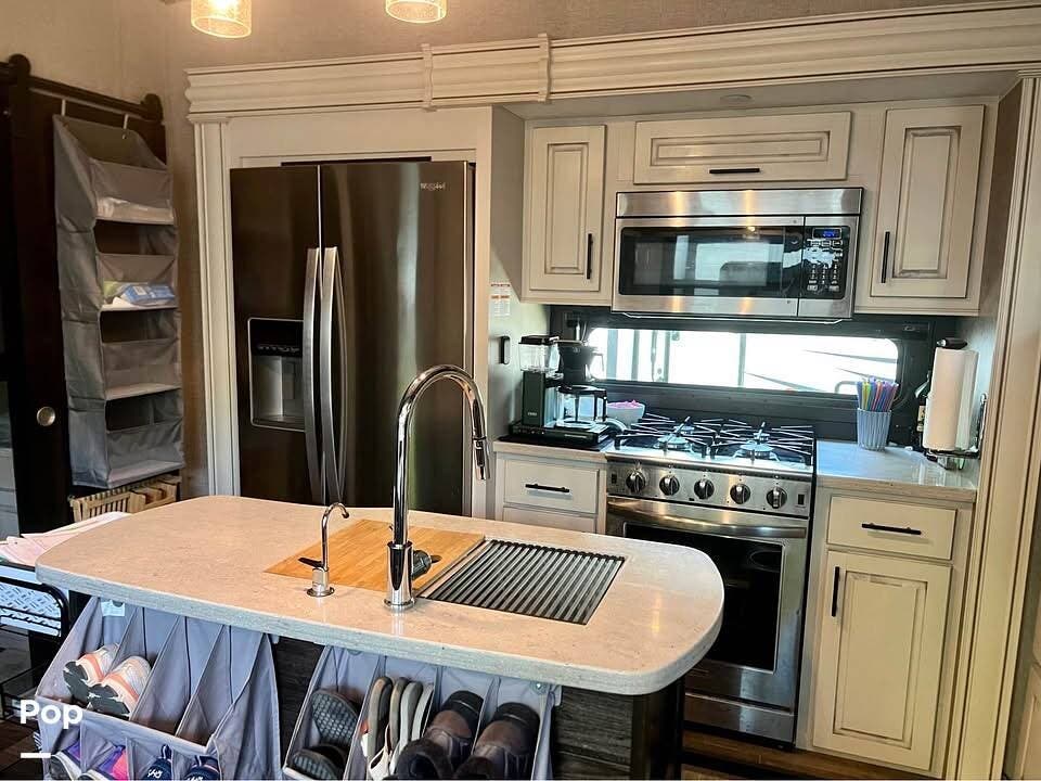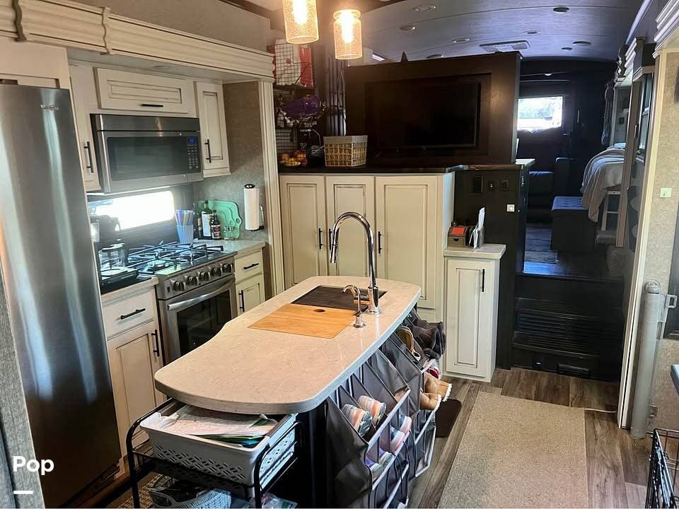 The front living room features opposing slides, creating a spacious feel. Relax on the theater seats and enjoy the entertainment center with a fireplace.