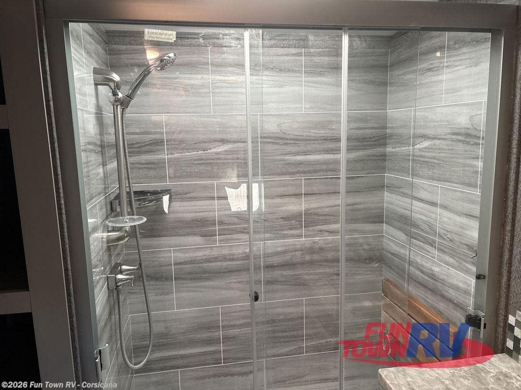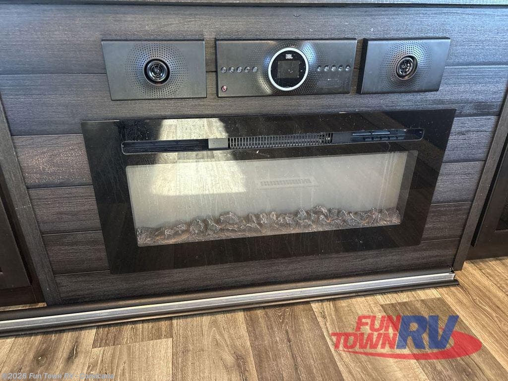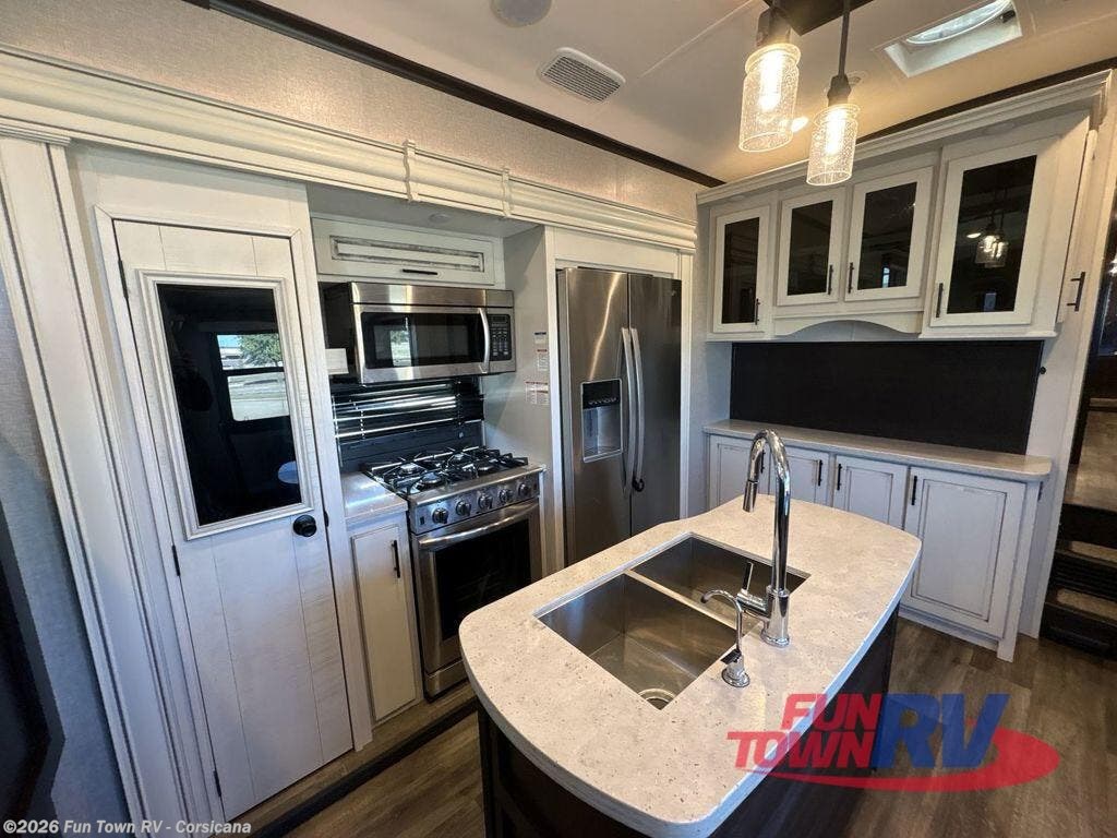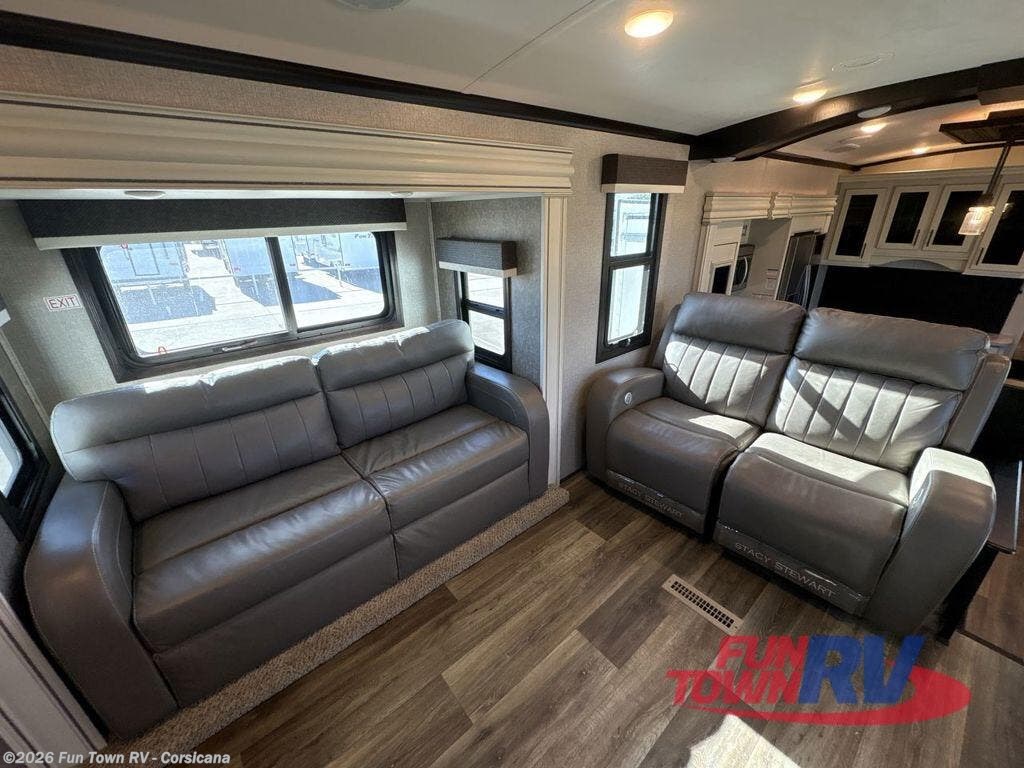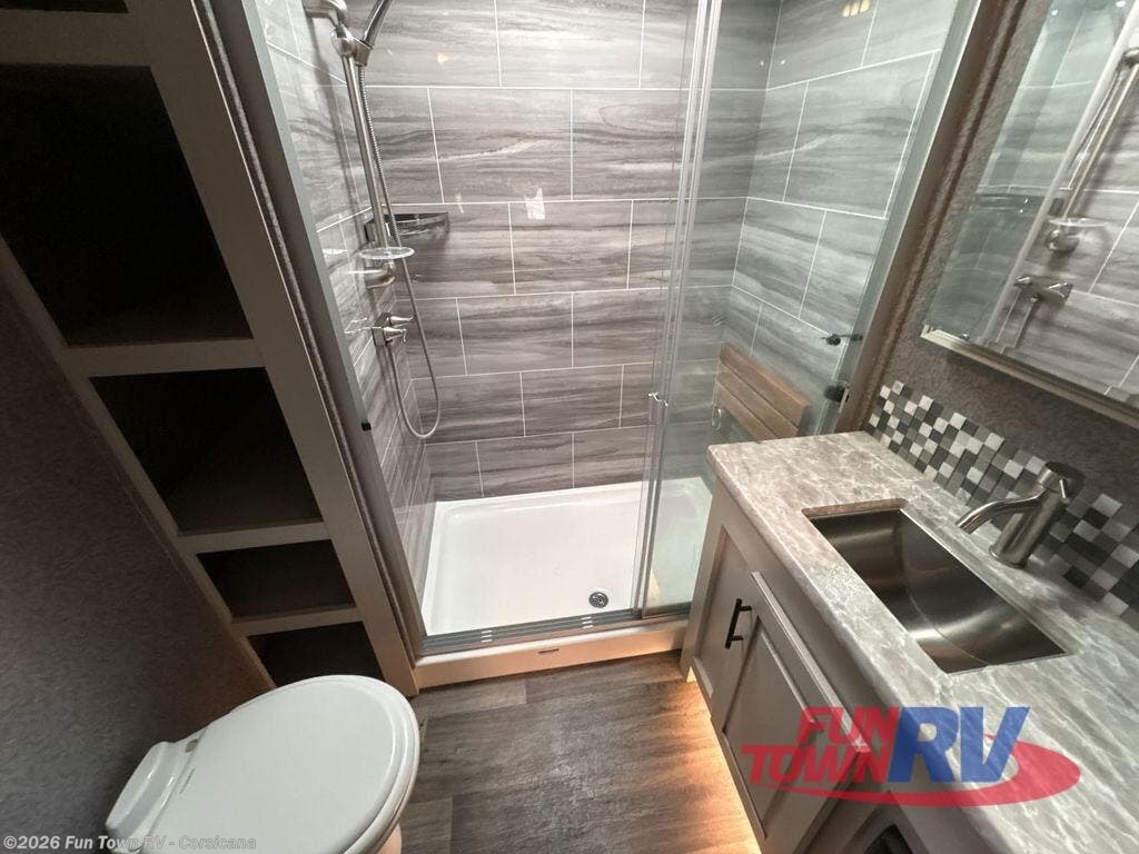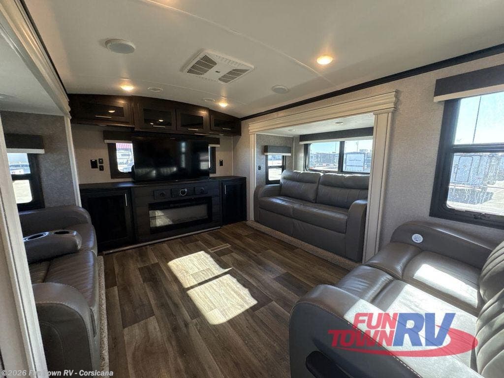 The raised rear living room in this fifth wheel increases the outside storage area so you can bring along all of your favorite outdoor gear! There are also opposing tri-fold hide-a-bed sofas, theater seats with heated massage, and an entertainment center with a fireplace and a TV on a lift. The chef of the group will love cooking indoors with the full-size pantry, the 21 cu. ft. residential refrigerator, the kitchen island with dishwasher prep, sink and 22" Blackstone griddle. The full bathroom is packed with at home features like the walk-in shower with shampoo/soap holder, the linen closet, and the overhead cabinets to keep your toiletries hidden away. The front private bedroom has a queen bed for you to rest on, a flip-top dresser with a TV, and a walk-in closet with a hamper and an area prepped to add the optional washer and dryer!