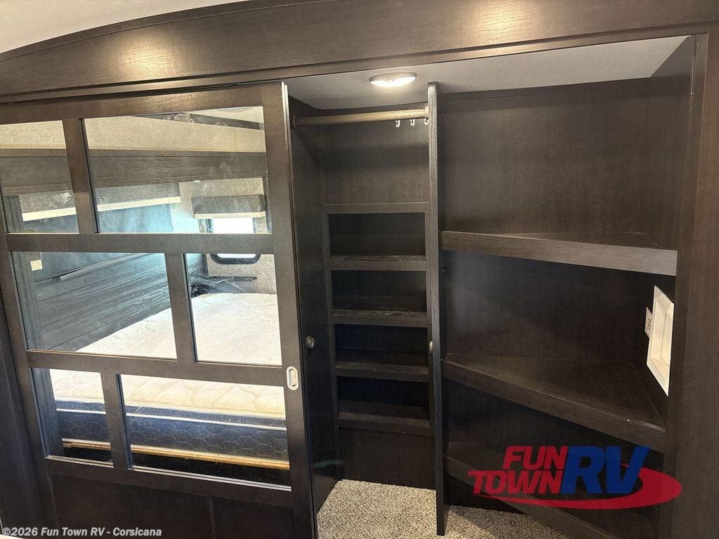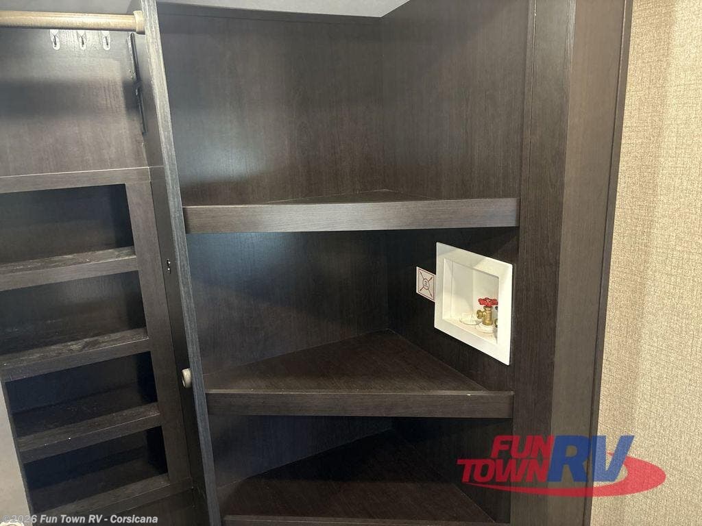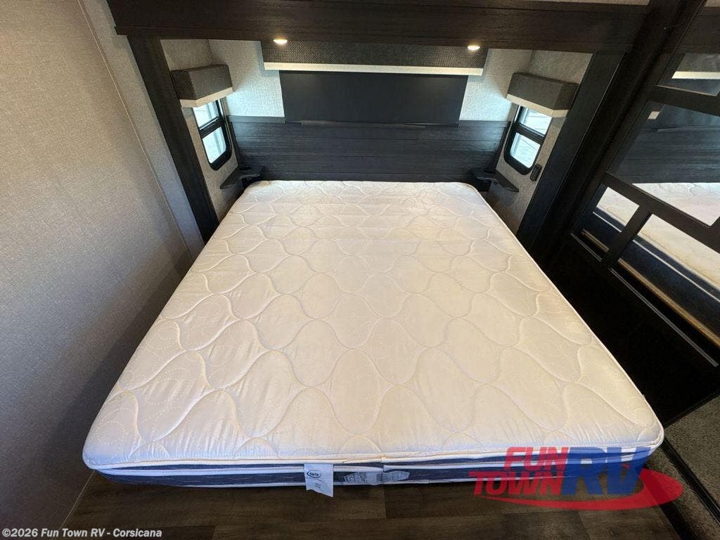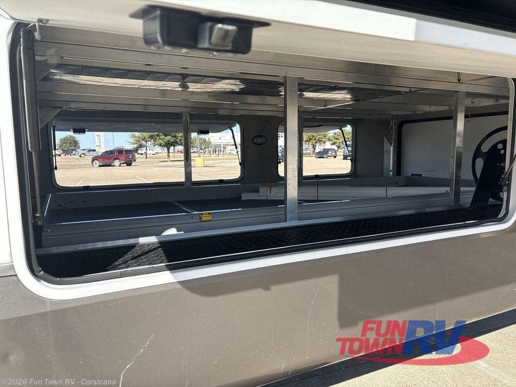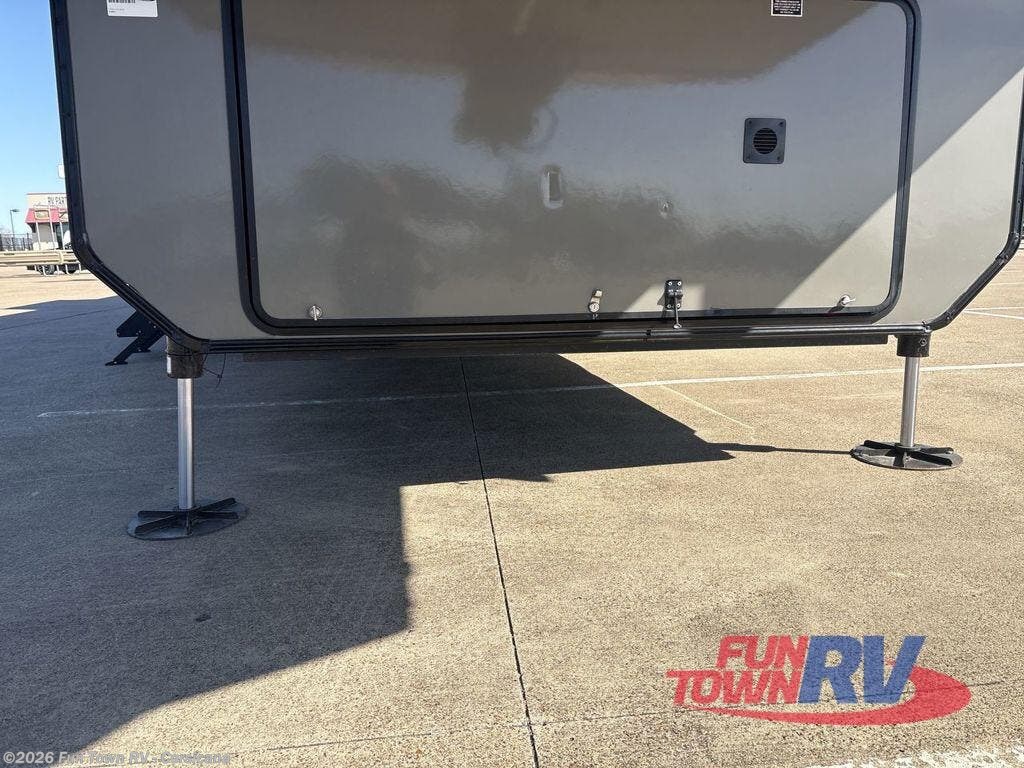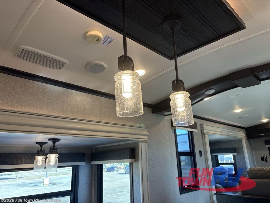 The raised rear living room in this fifth wheel increases the outside storage area so you can bring along all of your favorite outdoor gear! There are also opposing tri-fold hide-a-bed sofas, theater seats with heated massage, and an entertainment center with a fireplace and a TV on a lift. The chef of the group will love cooking indoors with the full-size pantry, the 21 cu. ft. residential refrigerator, the kitchen island with dishwasher prep, sink and 22" Blackstone griddle. The full bathroom is packed with at home features like the walk-in shower with shampoo/soap holder, the linen closet, and the overhead cabinets to keep your toiletries hidden away. The front private bedroom has a queen bed for you to rest on, a flip-top dresser with a TV, and a walk-in closet with a hamper and an area prepped to add the optional washer and dryer!