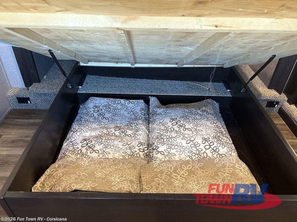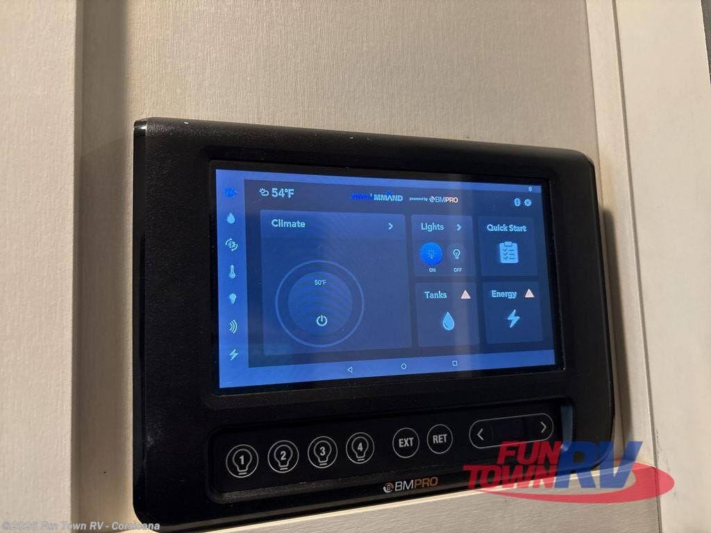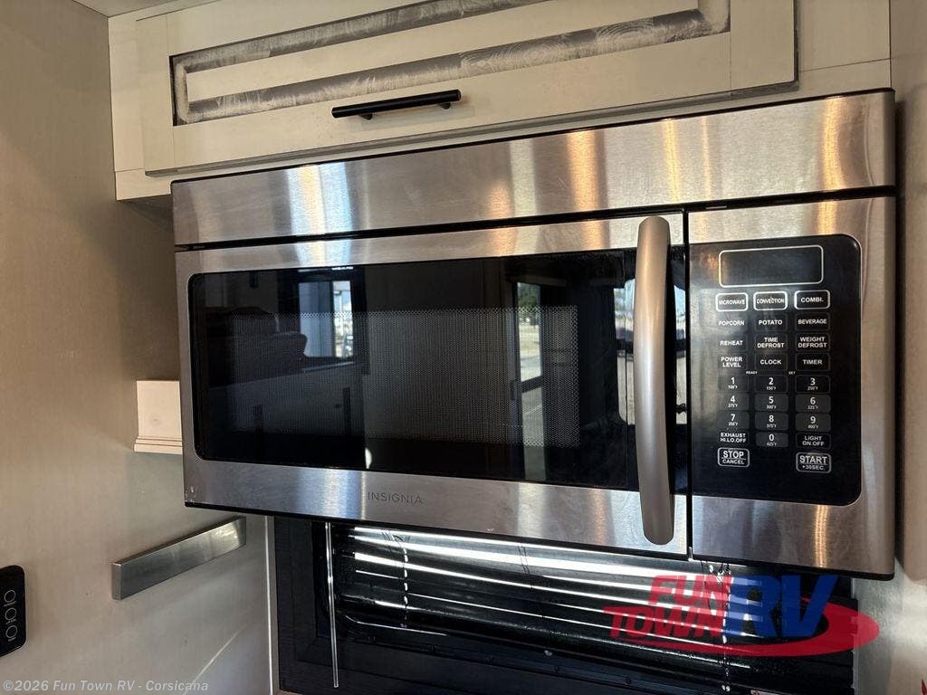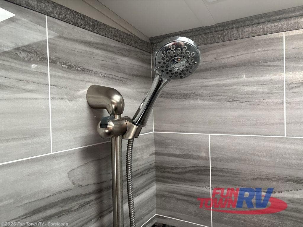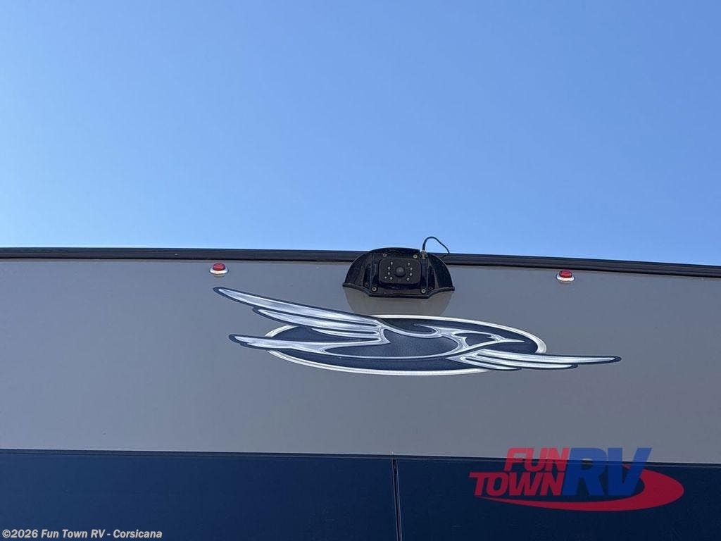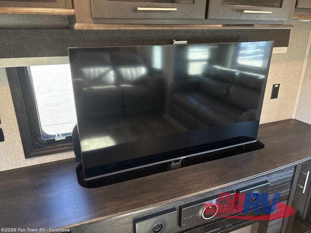 The raised rear living room in this fifth wheel increases the outside storage area so you can bring along all of your favorite outdoor gear! There are also opposing tri-fold hide-a-bed sofas, theater seats with heated massage, and an entertainment center with a fireplace and a TV on a lift. The chef of the group will love cooking indoors with the full-size pantry, the 21 cu. ft. residential refrigerator, the kitchen island with dishwasher prep, sink and 22" Blackstone griddle. The full bathroom is packed with at home features like the walk-in shower with shampoo/soap holder, the linen closet, and the overhead cabinets to keep your toiletries hidden away. The front private bedroom has a queen bed for you to rest on, a flip-top dresser with a TV, and a walk-in closet with a hamper and an area prepped to add the optional washer and dryer!