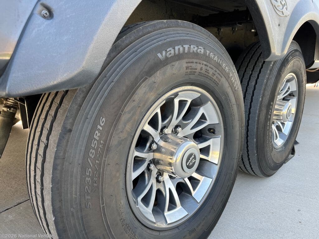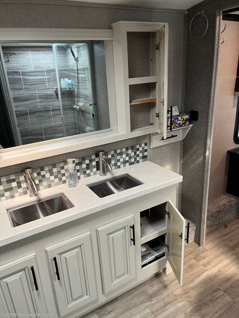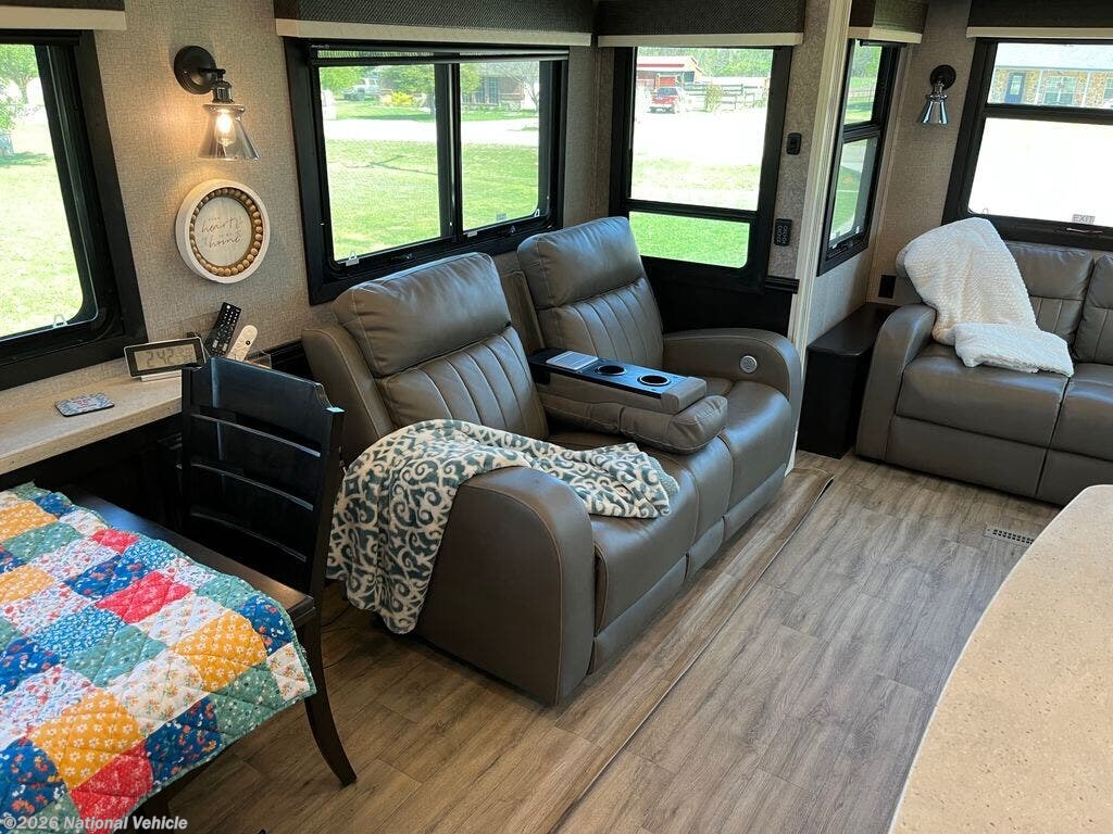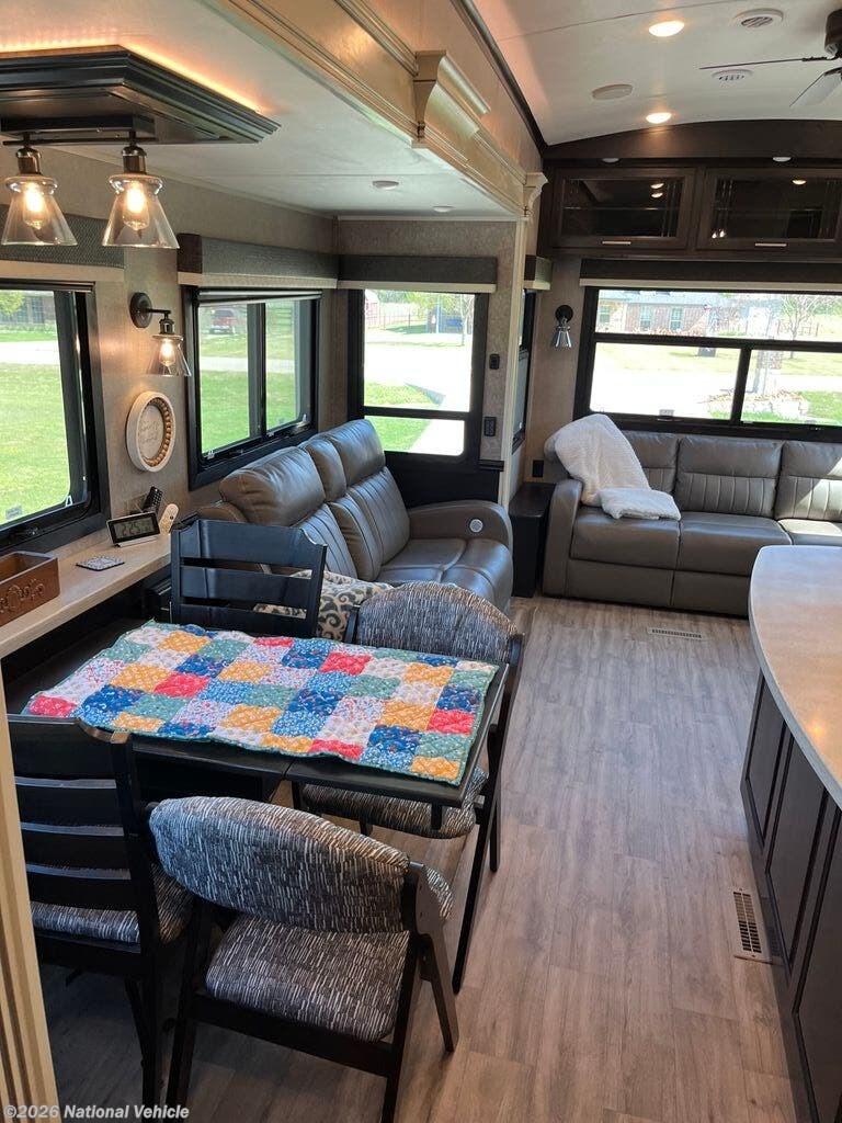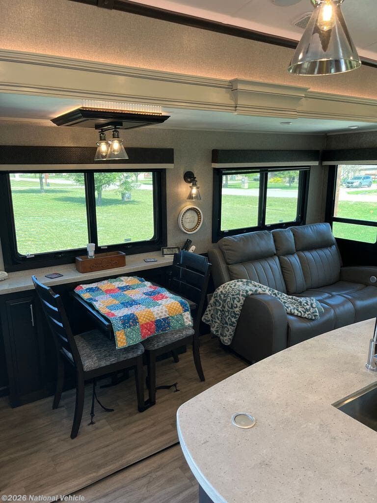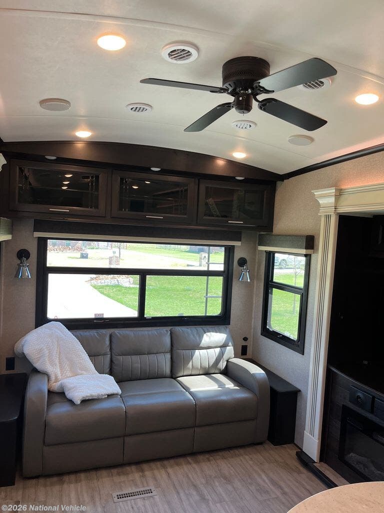 Inside, you?ll find a beautiful residential-style interior with Corian countertops, a large kitchen island, and solid cabinetry, along with a ceiling fan in the living area for added comfort. The living space features theatre seating with heat and massage, a sofa bed, electric fireplace with heat, and a table with chairs, creating a true home-like environment.