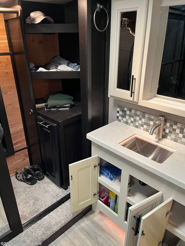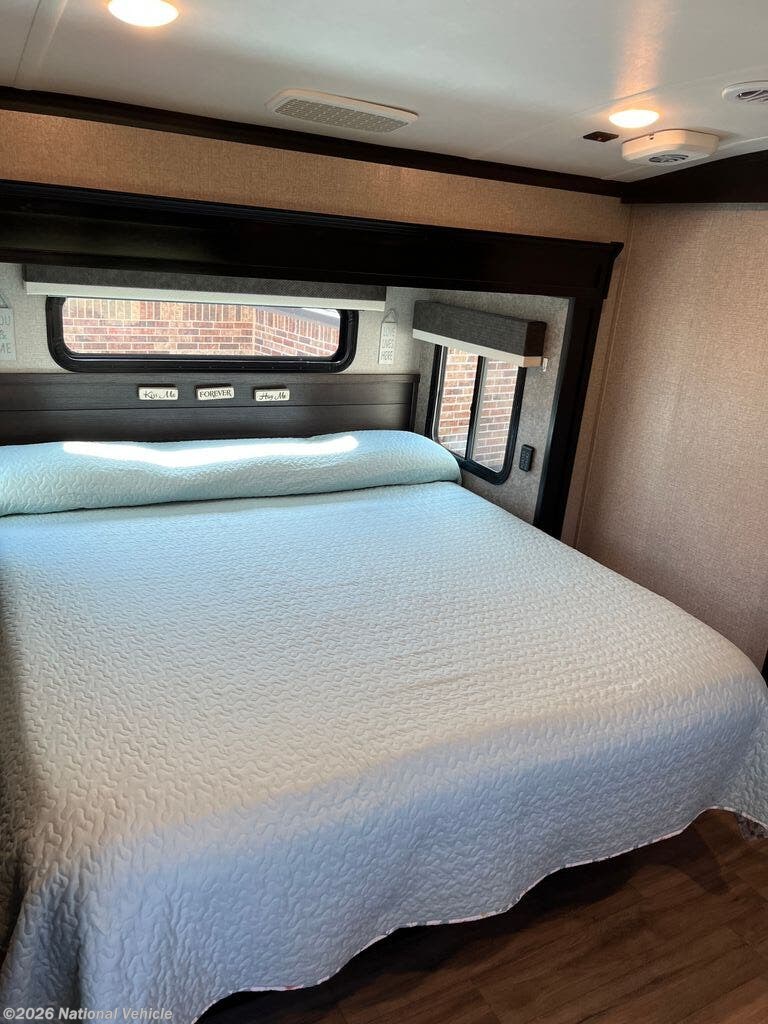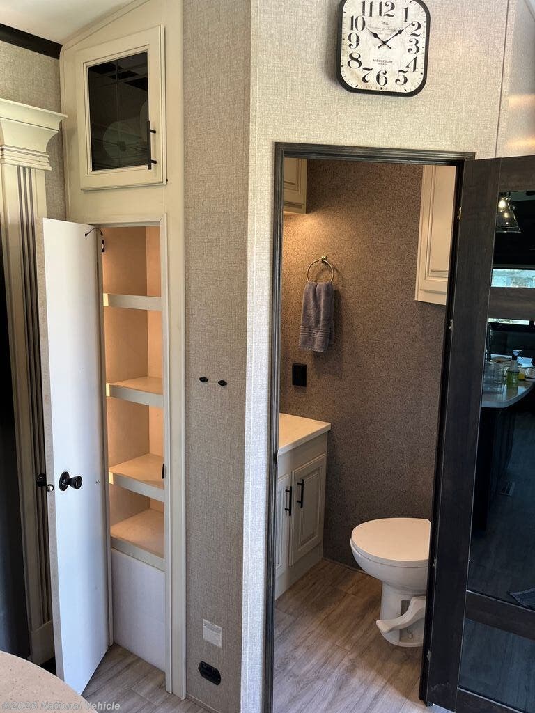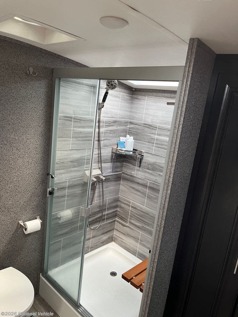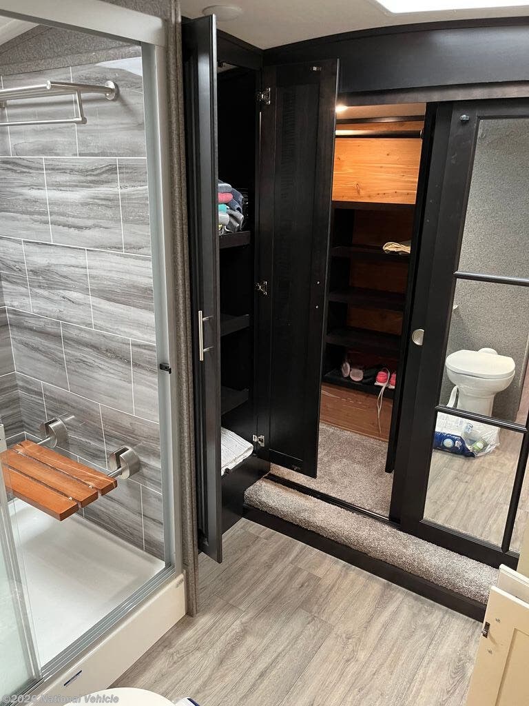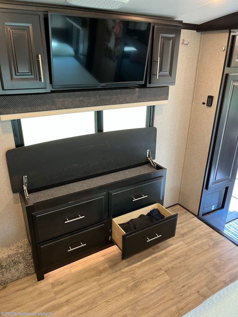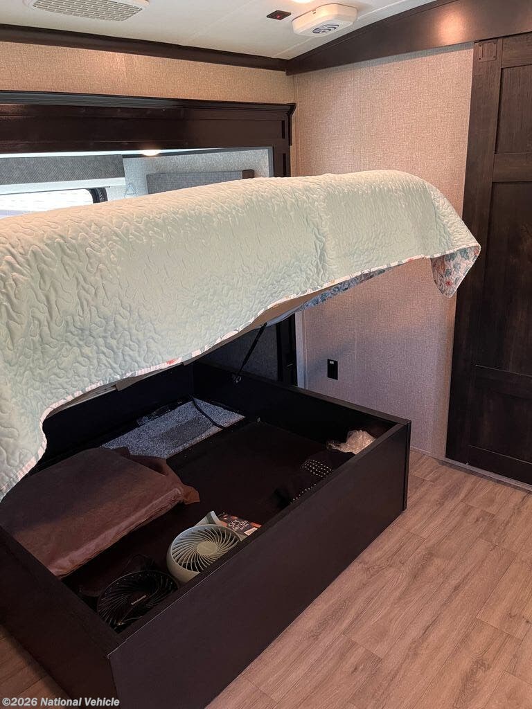 Inside, you?ll find a beautiful residential-style interior with Corian countertops, a large kitchen island, and solid cabinetry, along with a ceiling fan in the living area for added comfort. The living space features theatre seating with heat and massage, a sofa bed, electric fireplace with heat, and a table with chairs, creating a true home-like environment.
