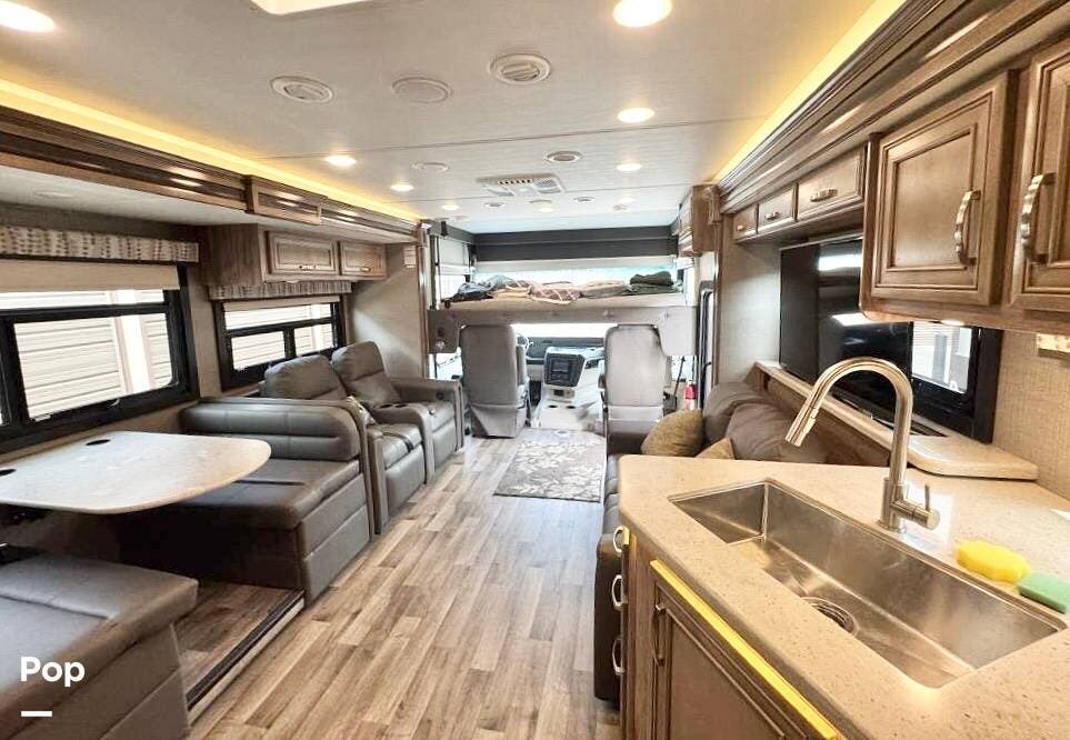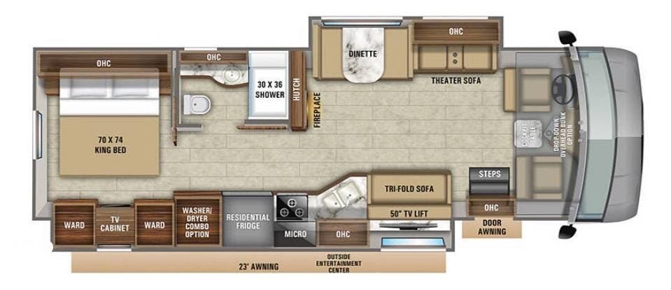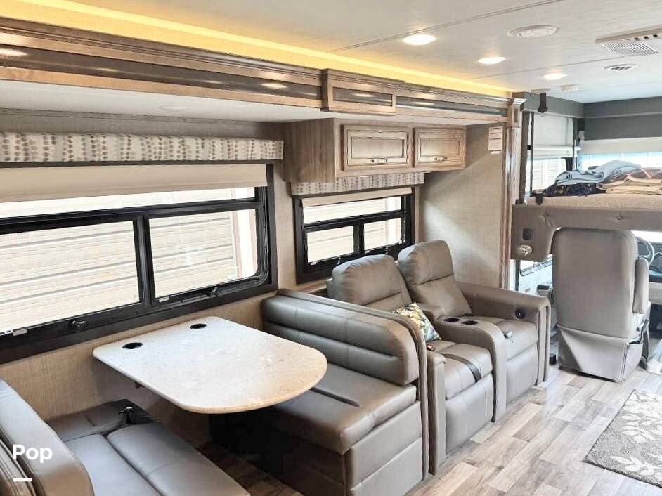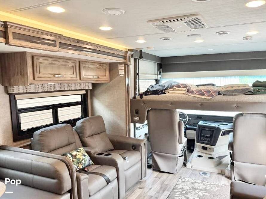 This 34G is a well-equipped coach with room to sleep up to 8. It features an upgraded drop-down bed over the driver's seat, a favorite among young people, and is large enough to accommodate adults with room to spare. The sofa folds out, and the dinette converts to a bed for two.