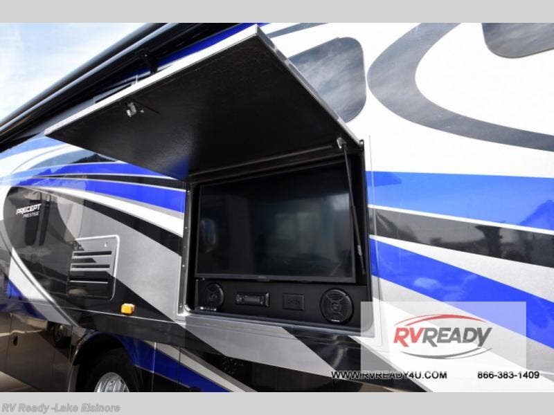 Pack your bags and load up into this Precept Prestige Class A gas motorhome for a relaxing getaway! The rear private bedroom has a king-size bed for you to rest up each night and a wardrobe with a space to add the optional washer and dryer so that you can have clean clothes throughout your entire trip. You can prepare delicious home-cooked meals with the FurrionĀ® stainless, recessed gas cooktop with cast-iron grill and even the convection microwave, and then you can enjoy eating those meals at the booth dinette which can also convert into an extra sleeping space. What better way to wind down your nights than by relaxing on the hide-a-bed sofa or the recliner while you enjoy the cozy fireplace and watch your favorite movie on the 50" TV lift!