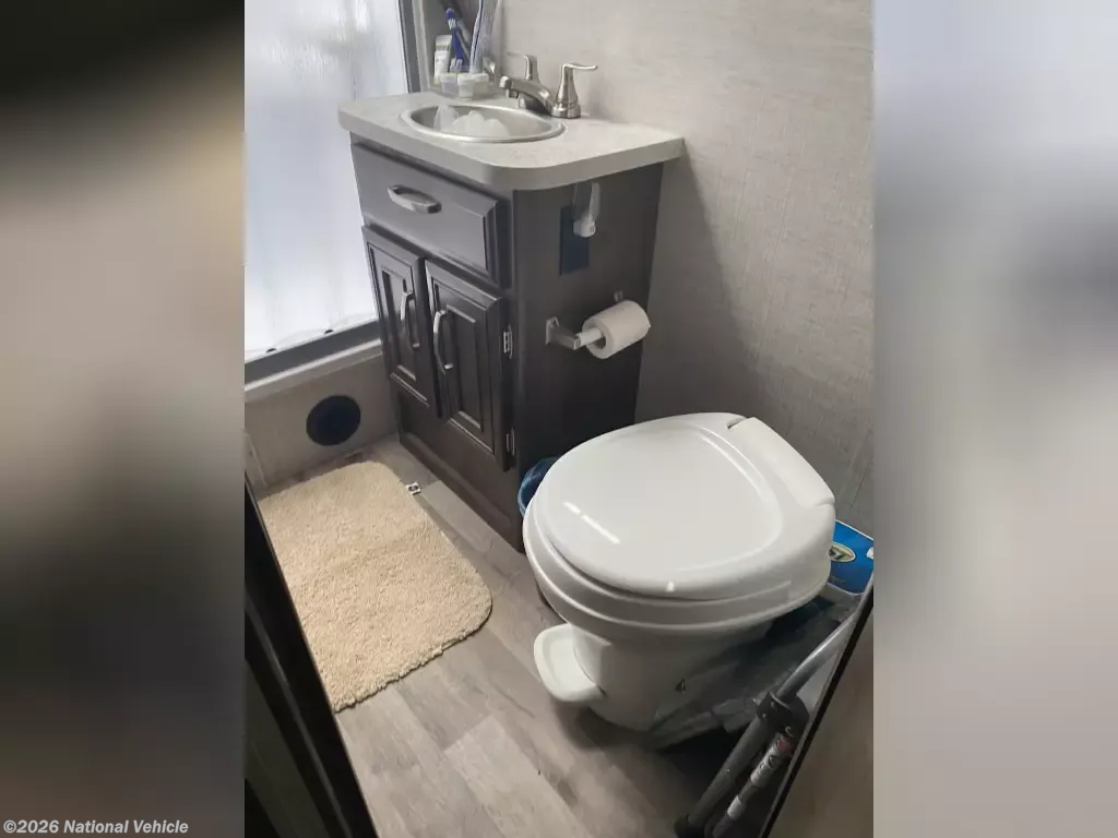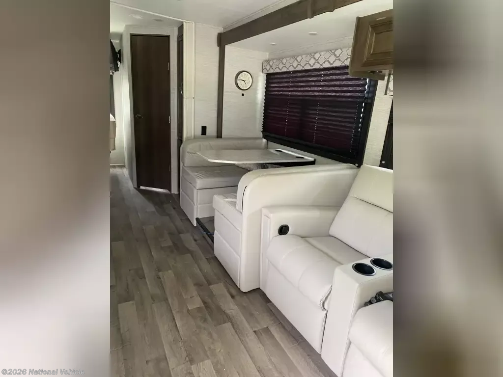 In this 2021 Redhawk Class C, you can travel a long distance, go camp at your favorite campground or get completely off the grid. It has all the comforts of home and can be powered by the shore power cord or the inboard generator. Inside to the front, above the cockpit area, is a cab-over bed. In the middle area is a theater seating style sofa that reclines, a dinette table that can convert to a bed across from the kitchen that includes double sided sink, convection microwave, a 3-burner stove/oven, and a 2-way fridge/freezer. In the rear are a full bathroom and a queen size bed that can be separated from the rest of unit.