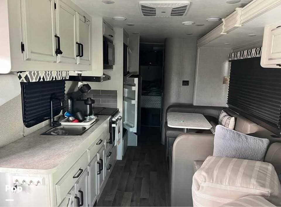 The interior of this RV features the Modern Farmhouse interior package, which adds a more homey feel to the inside of the RV.
