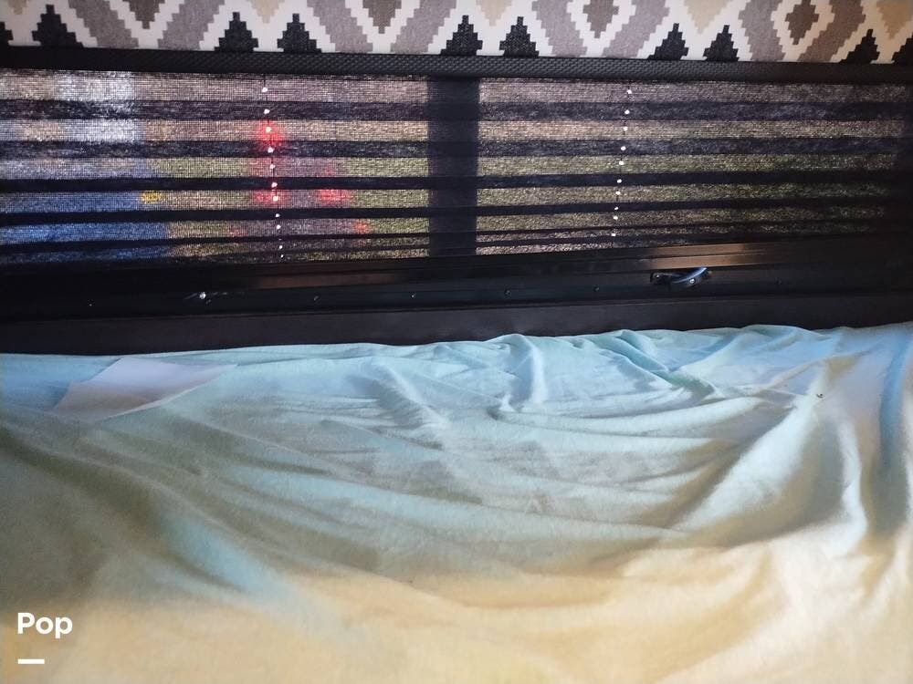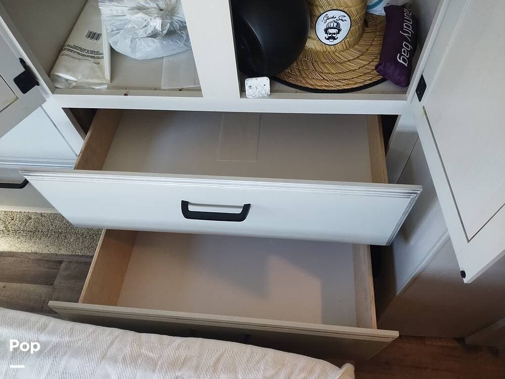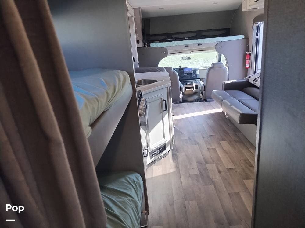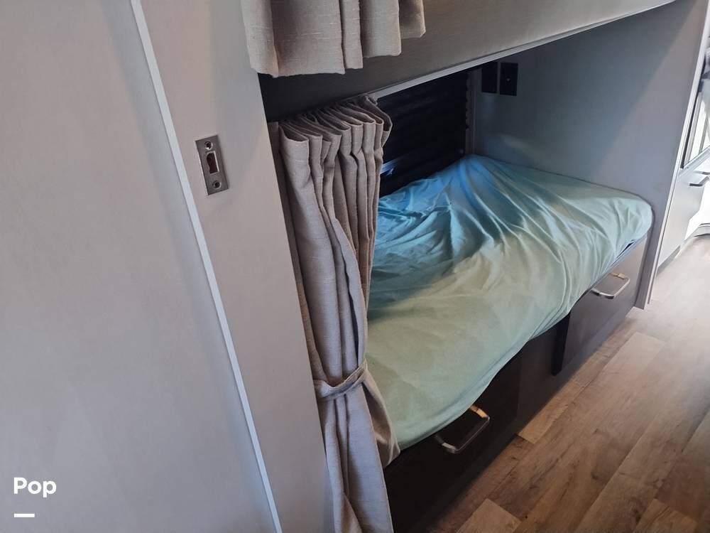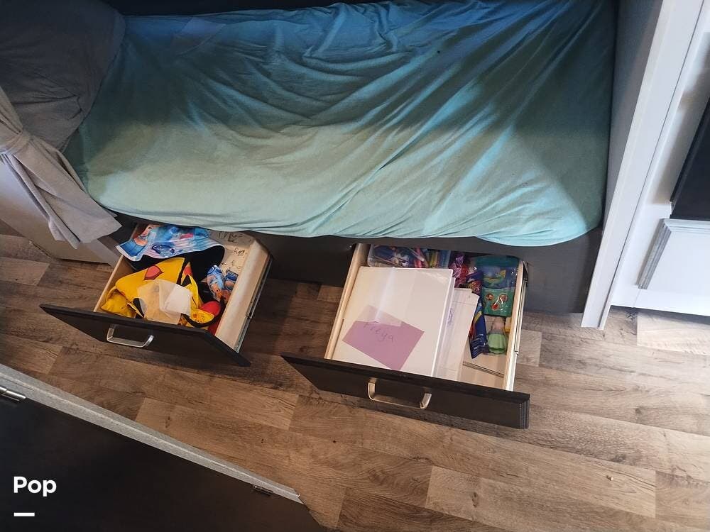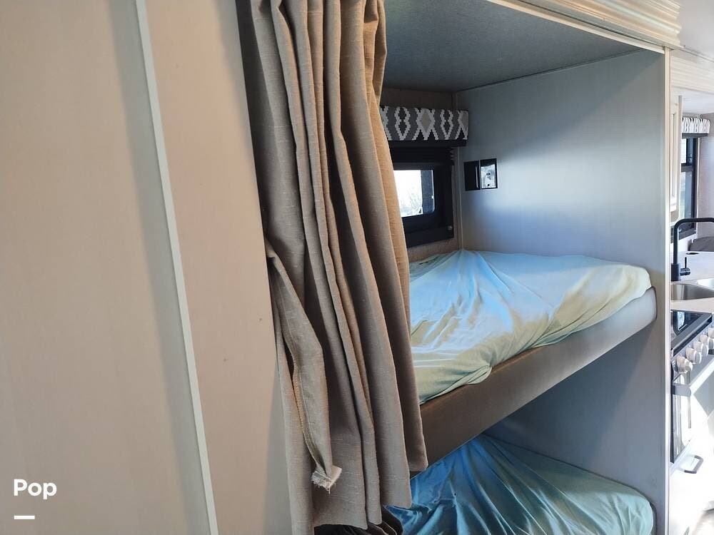 It features one queen bed in the rear bedroom and one cab-over bed with an industry-leading 750 lb. rating, which can remain ready for use. The driver's side bunk area, opposite the bath, features lights and power for a monitor or tablet, along with a privacy curtain and large storage drawers under the lower bunk. The dinette converts to an overflow sleeping area, and the sofa converts to a full-size bed.