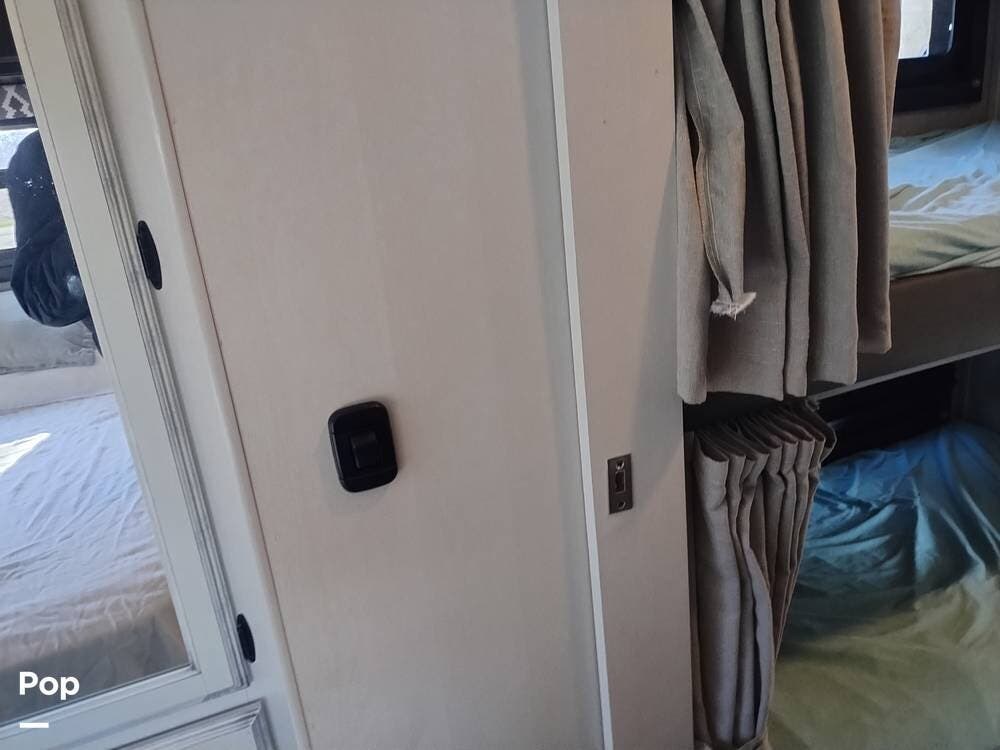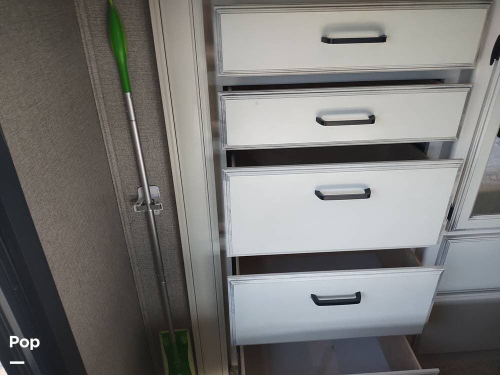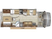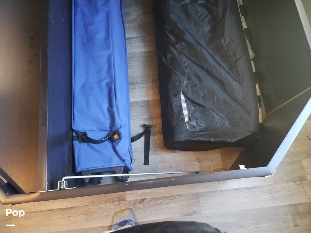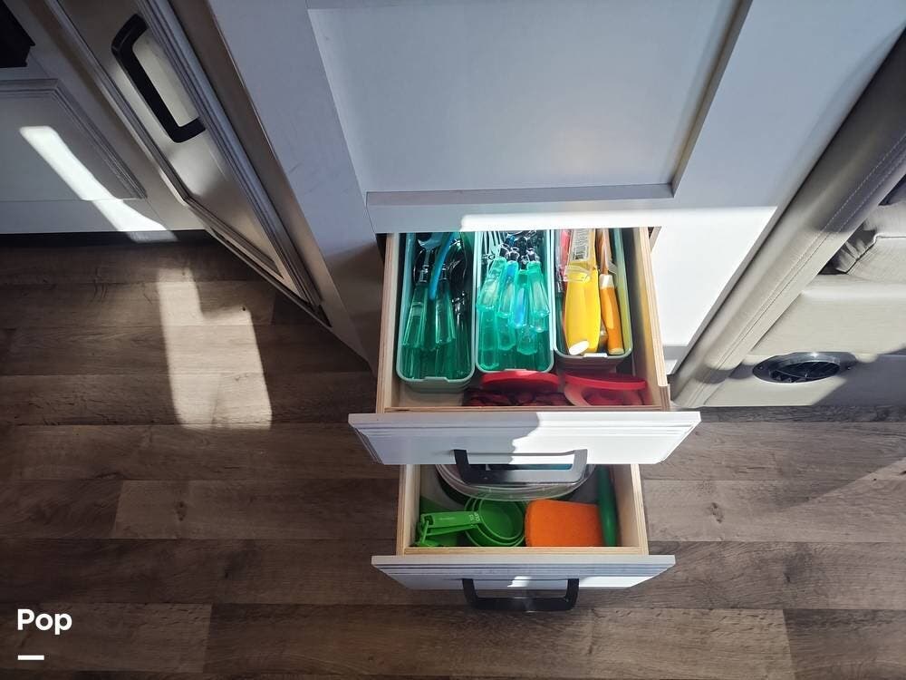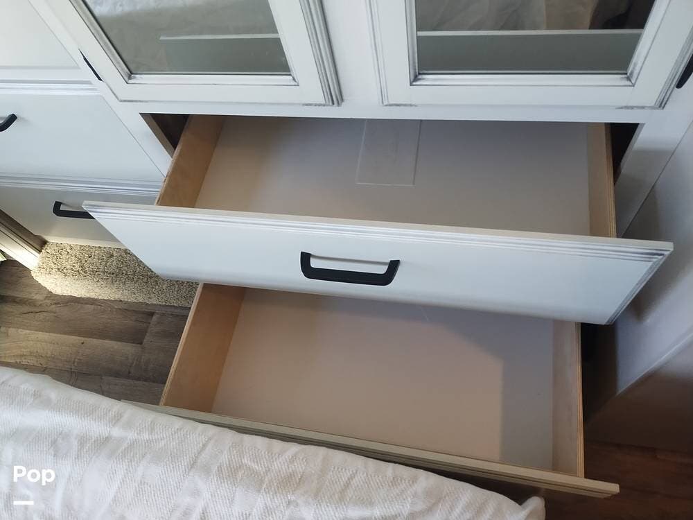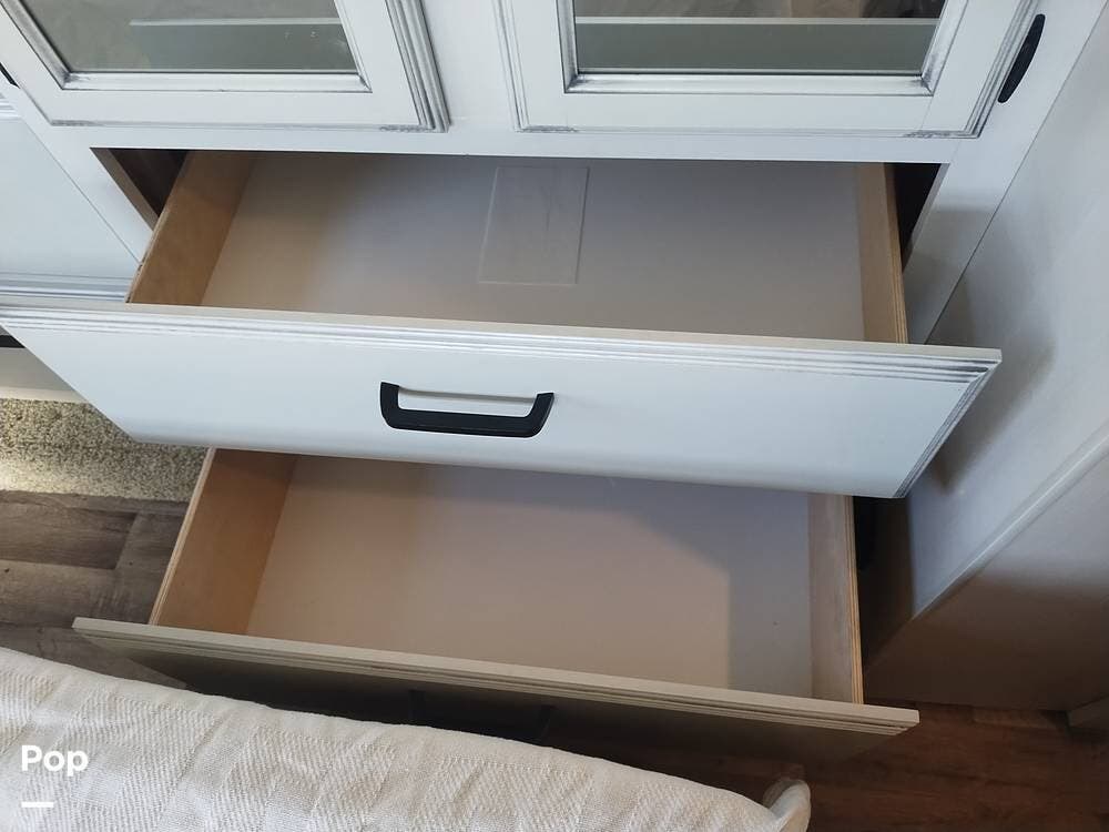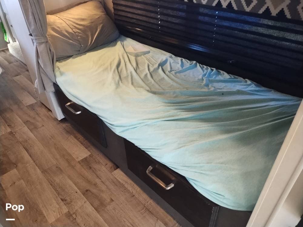 It features one queen bed in the rear bedroom and one cab-over bed with an industry-leading 750 lb. rating, which can remain ready for use. The driver's side bunk area, opposite the bath, features lights and power for a monitor or tablet, along with a privacy curtain and large storage drawers under the lower bunk. The dinette converts to an overflow sleeping area, and the sofa converts to a full-size bed.